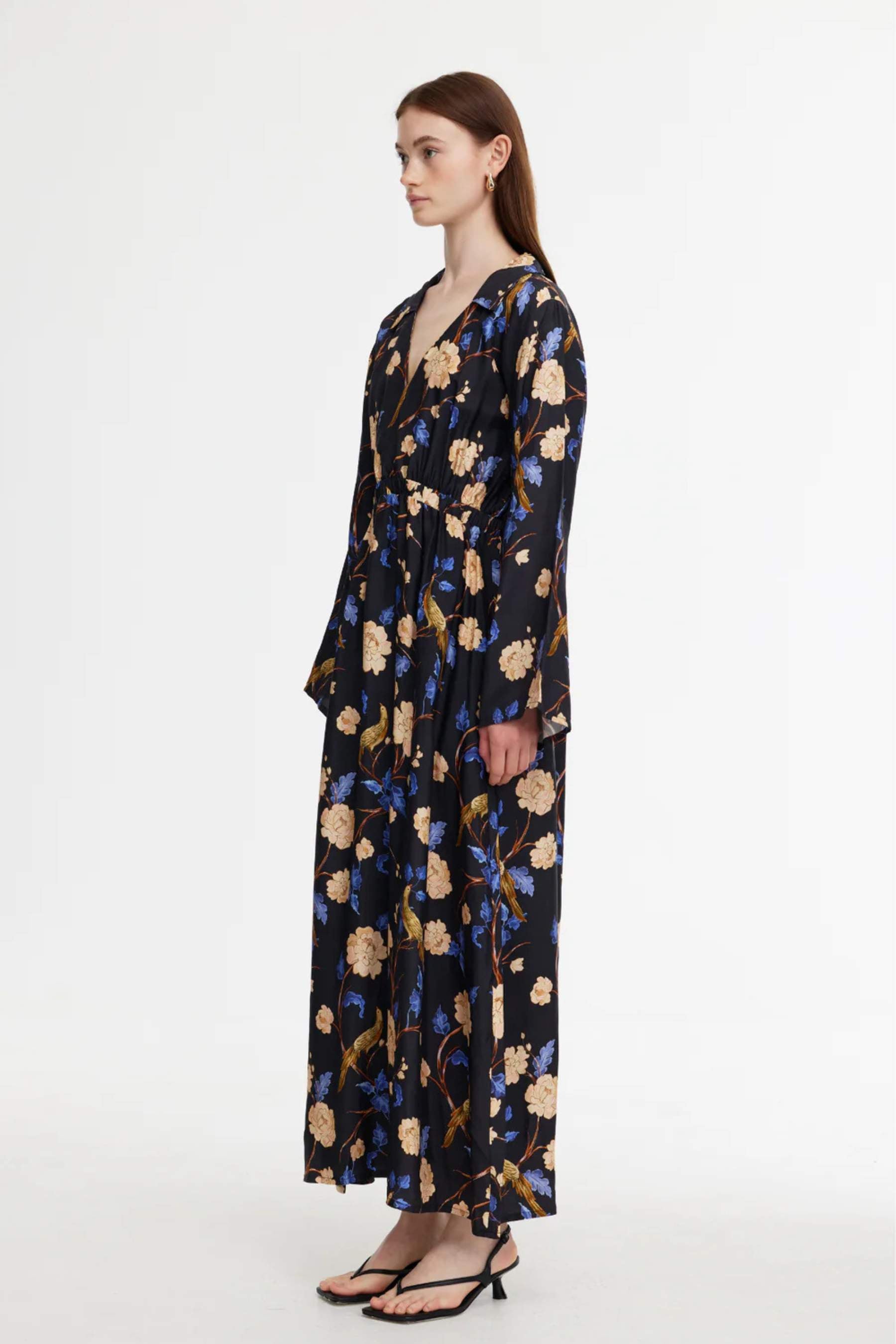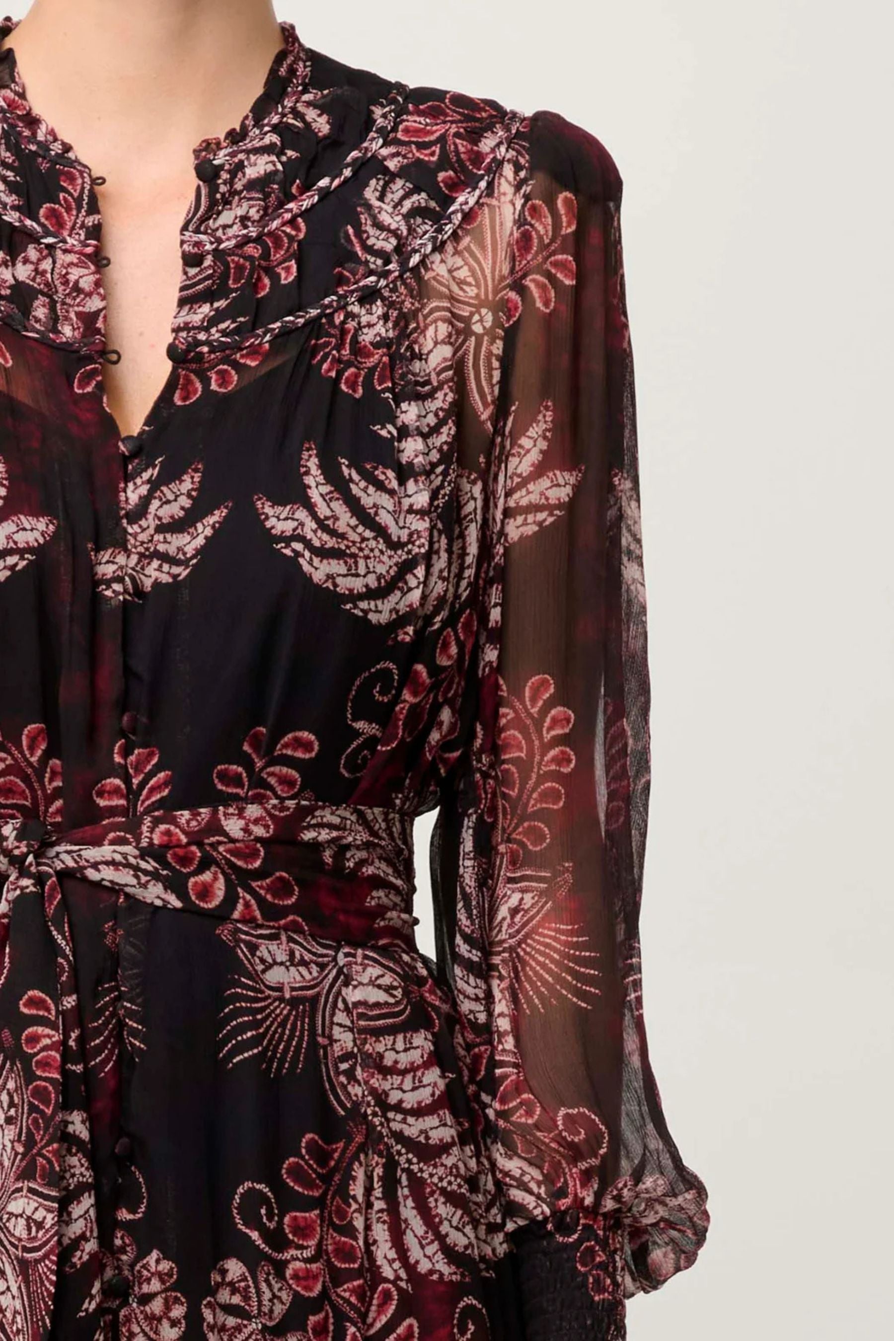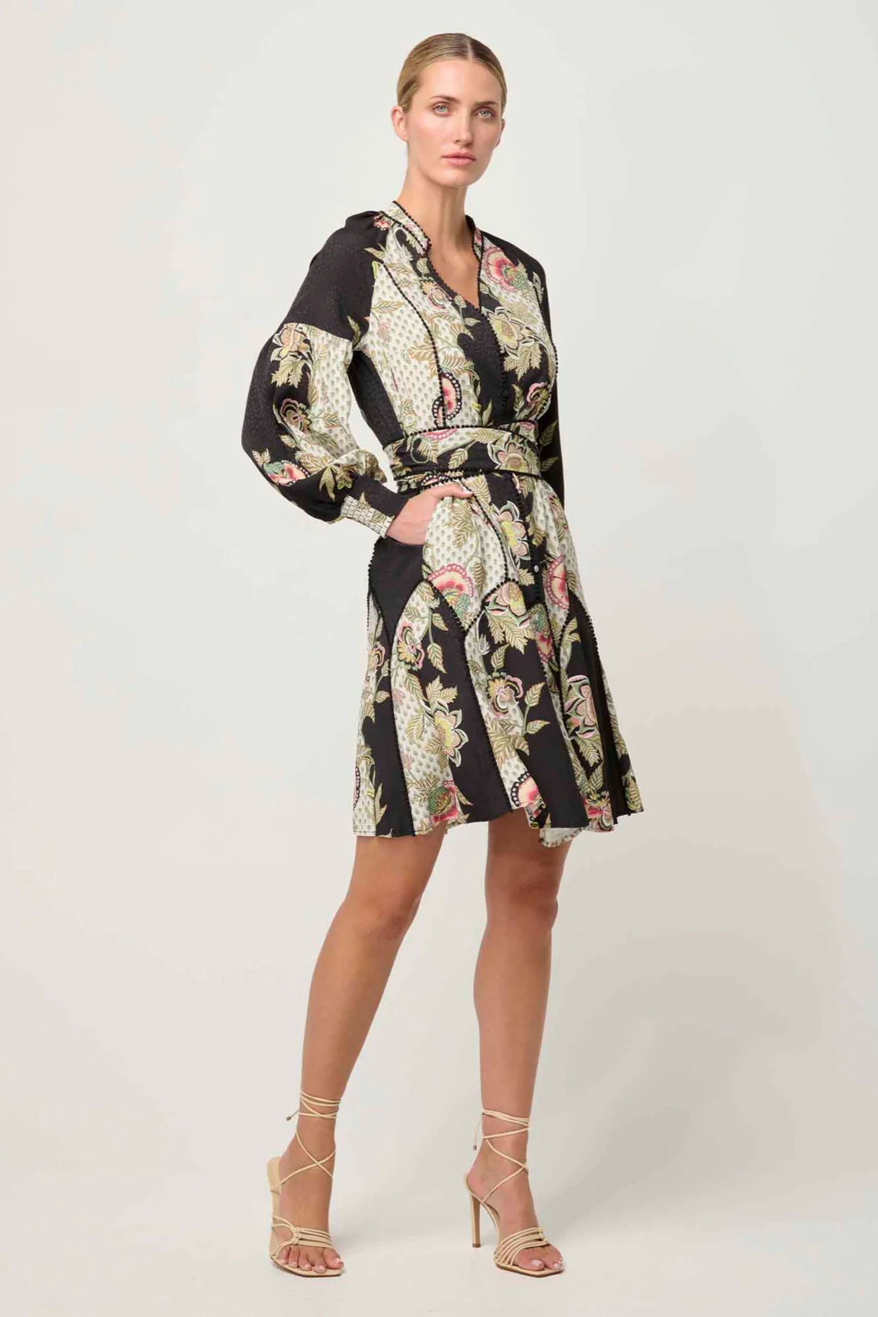 Renata Placement Print Silk Shirred Cuff Dress | Mariposa Zafiro