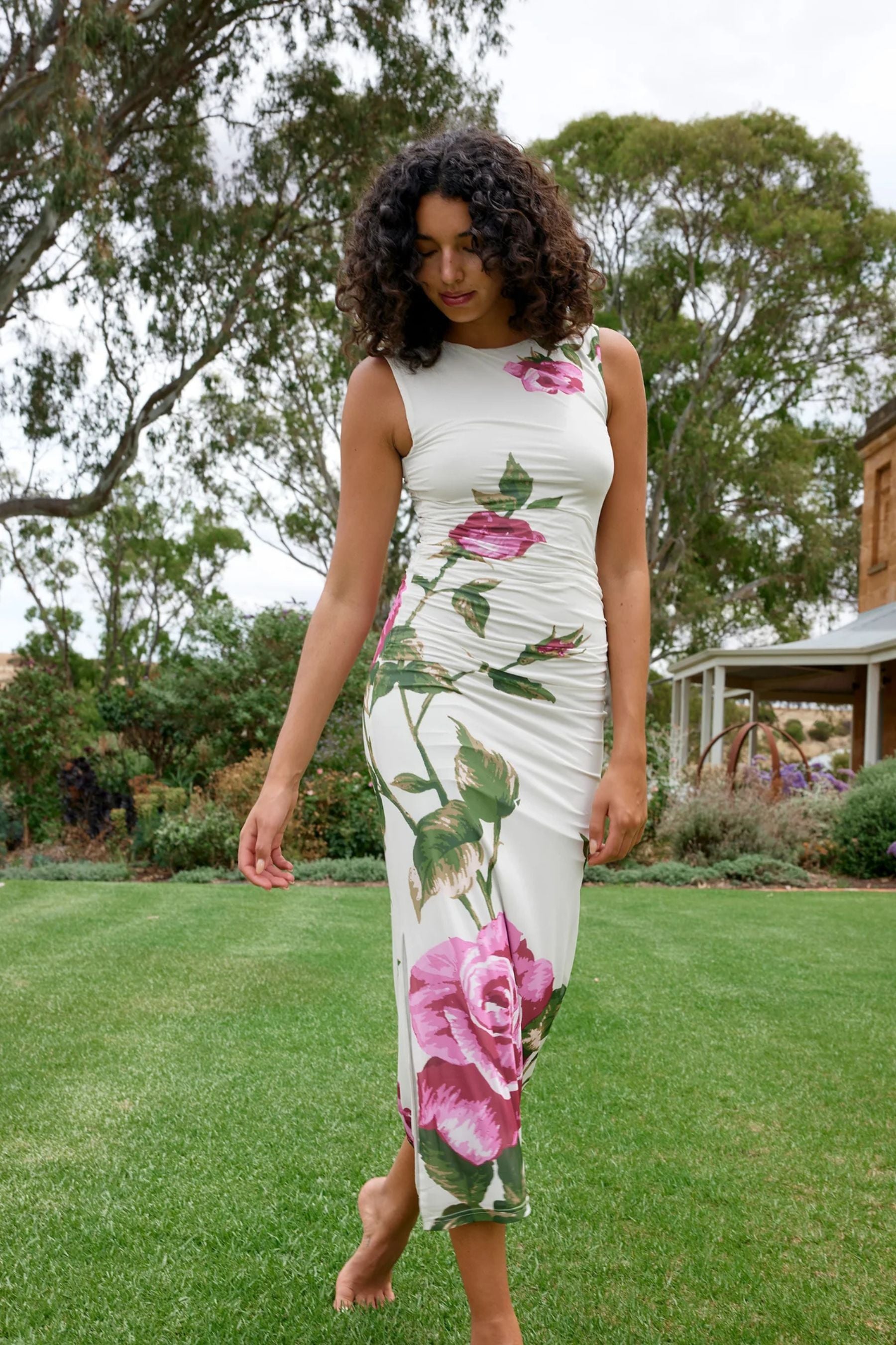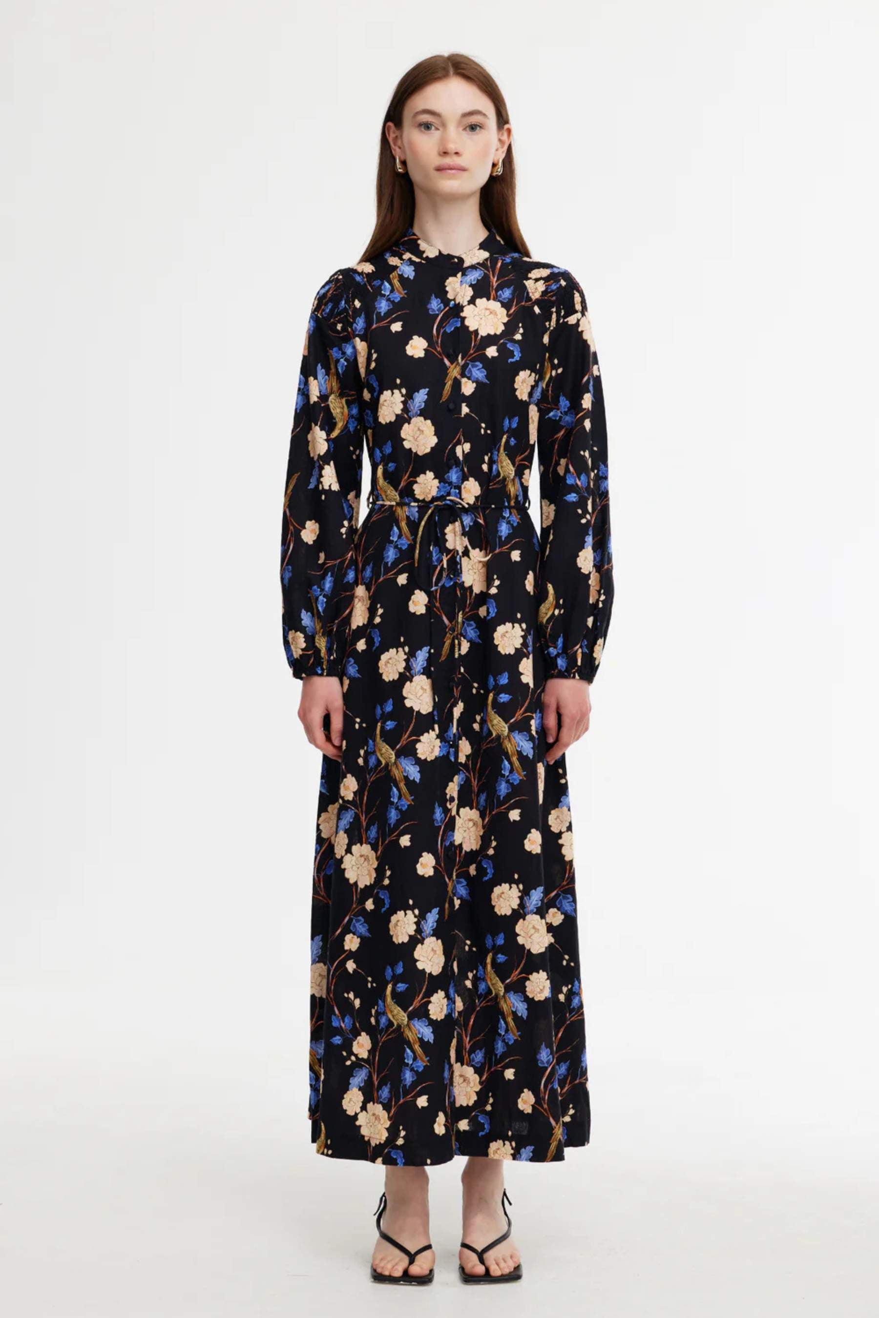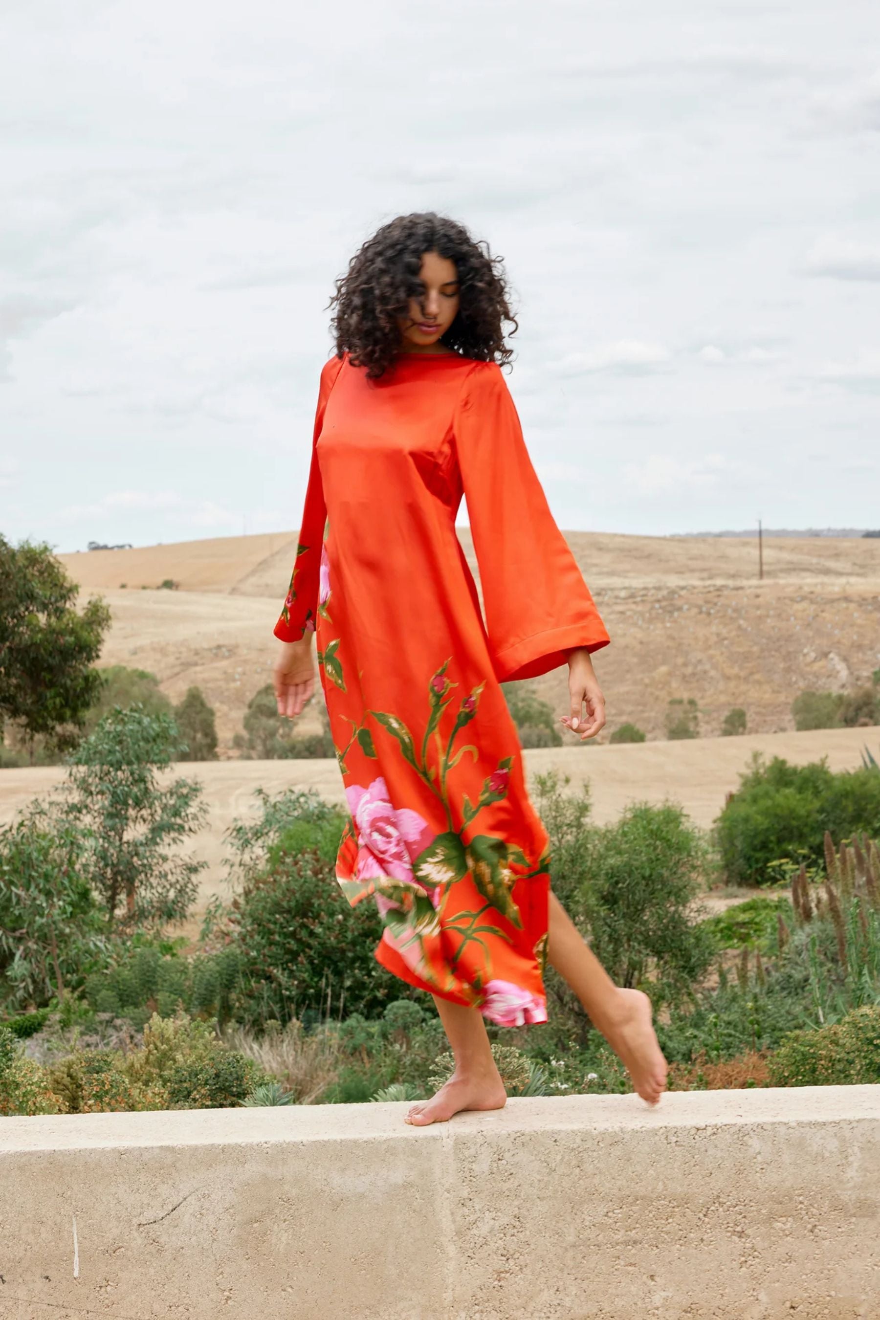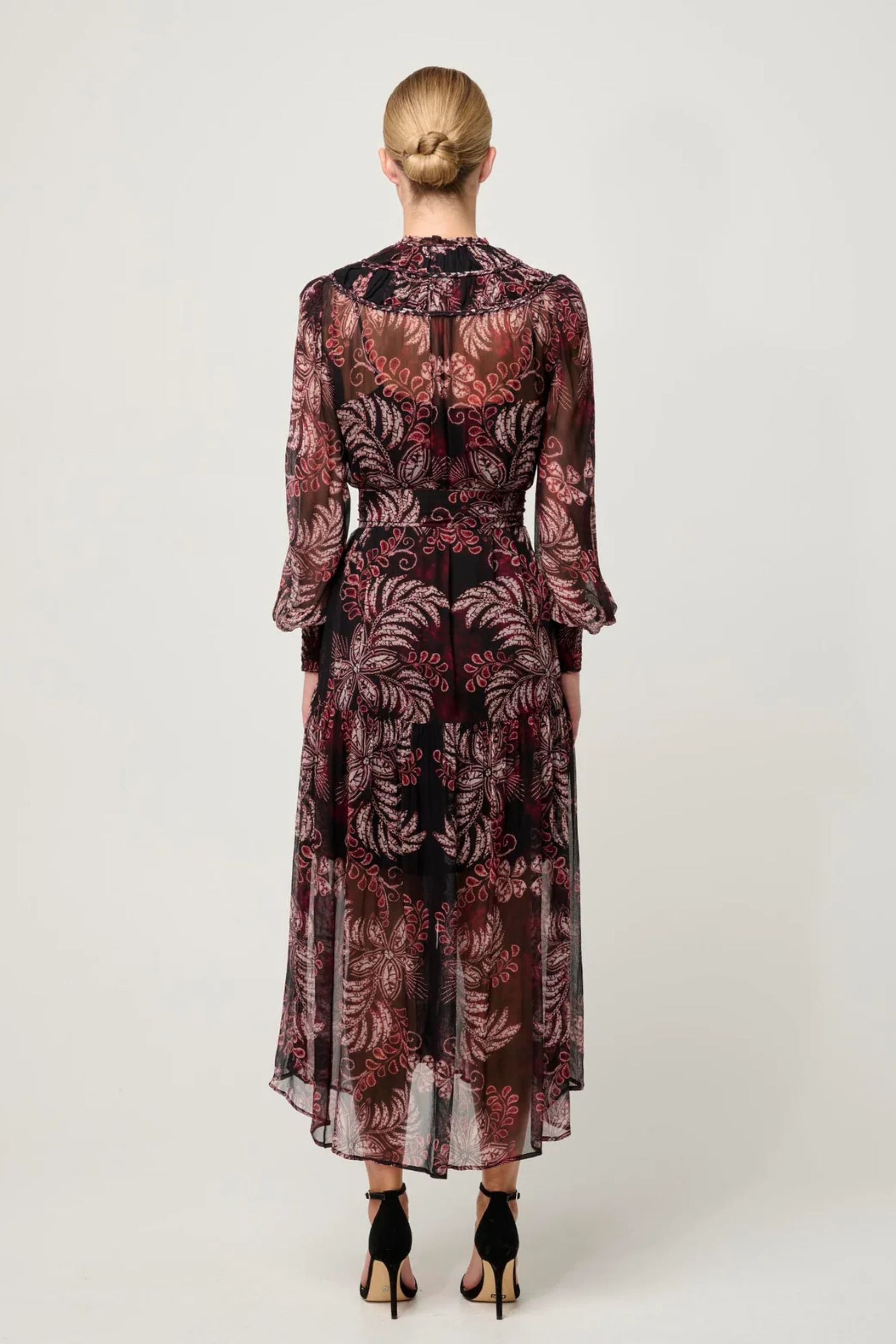 Renata Placement Print Silk Shirred Cuff Dress | Mariposa Zafiro