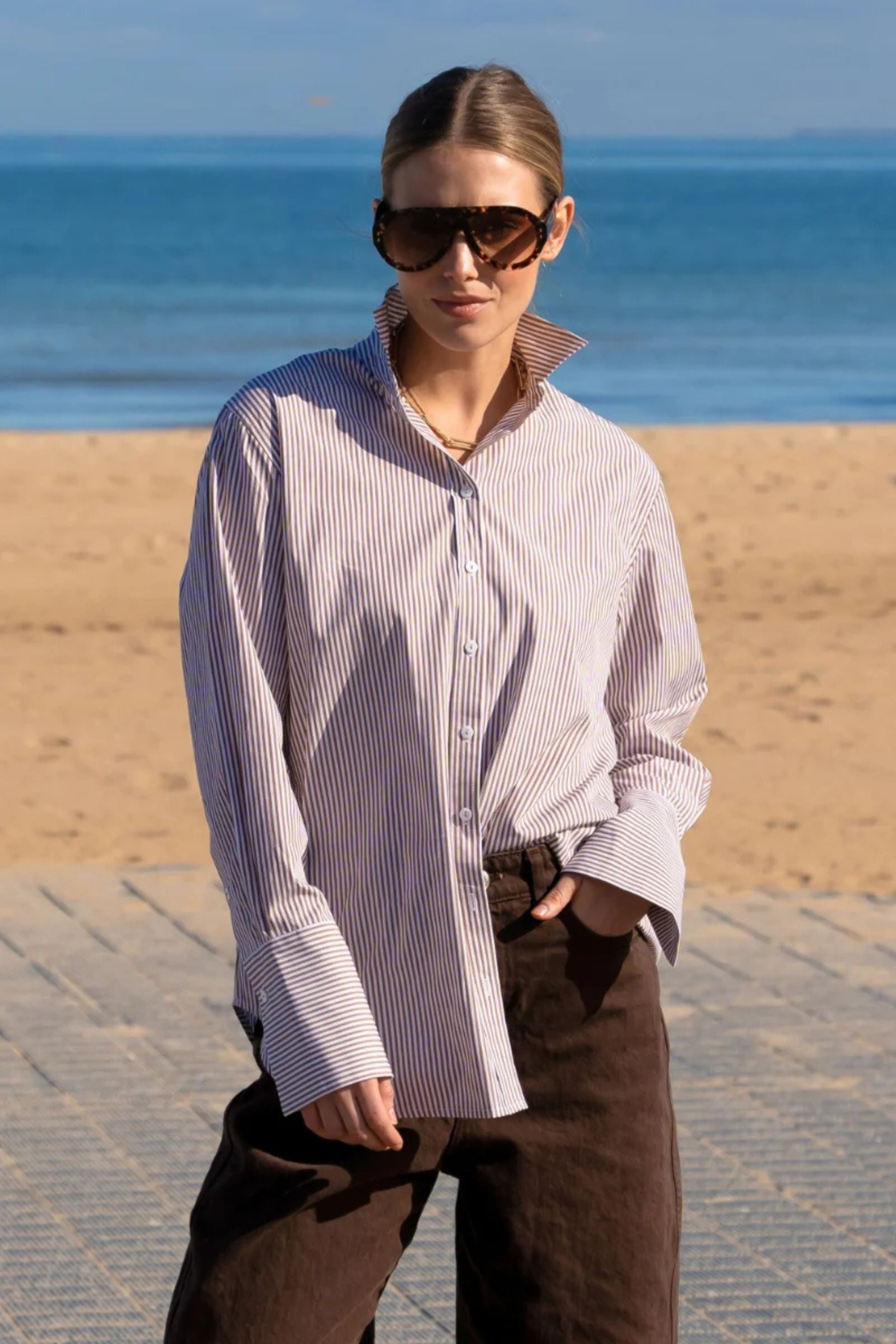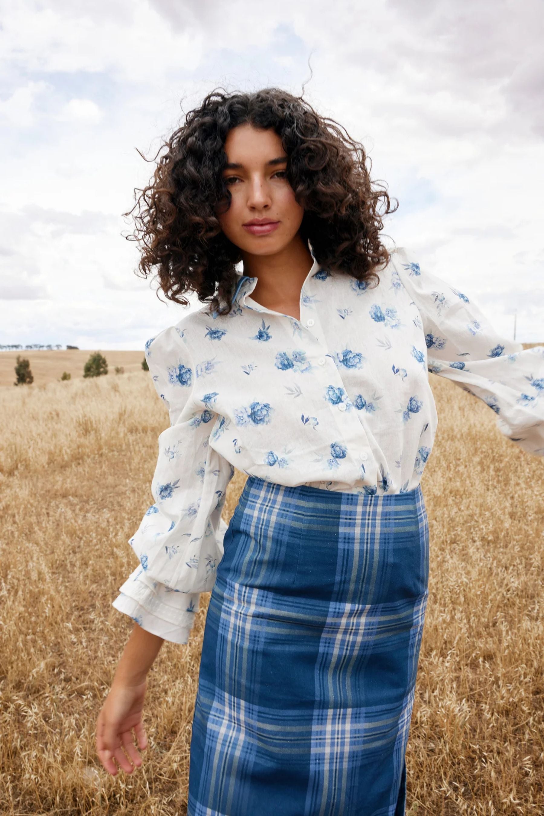 The Boyfriend Shirt | White with Blue Stripe Floral Trim