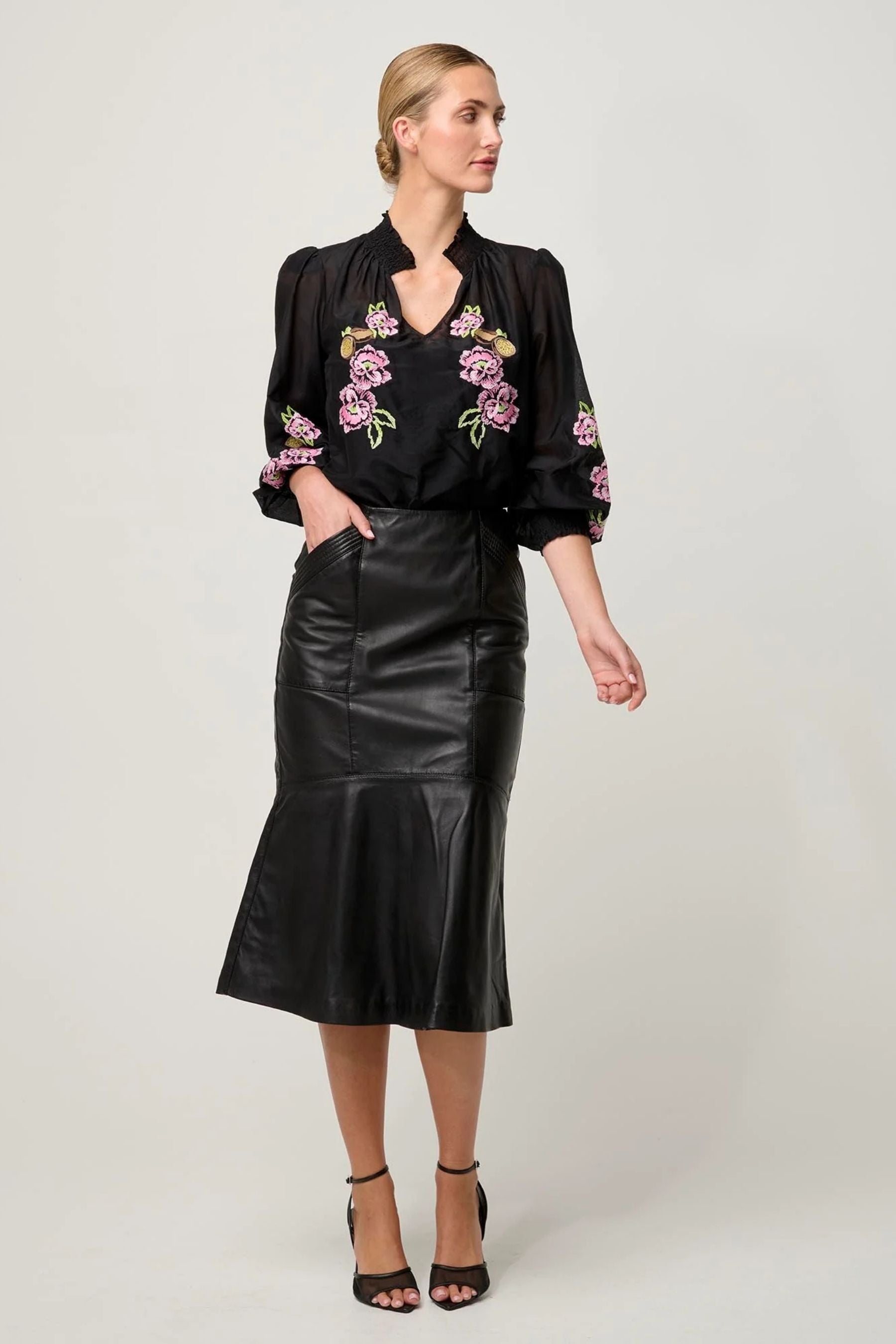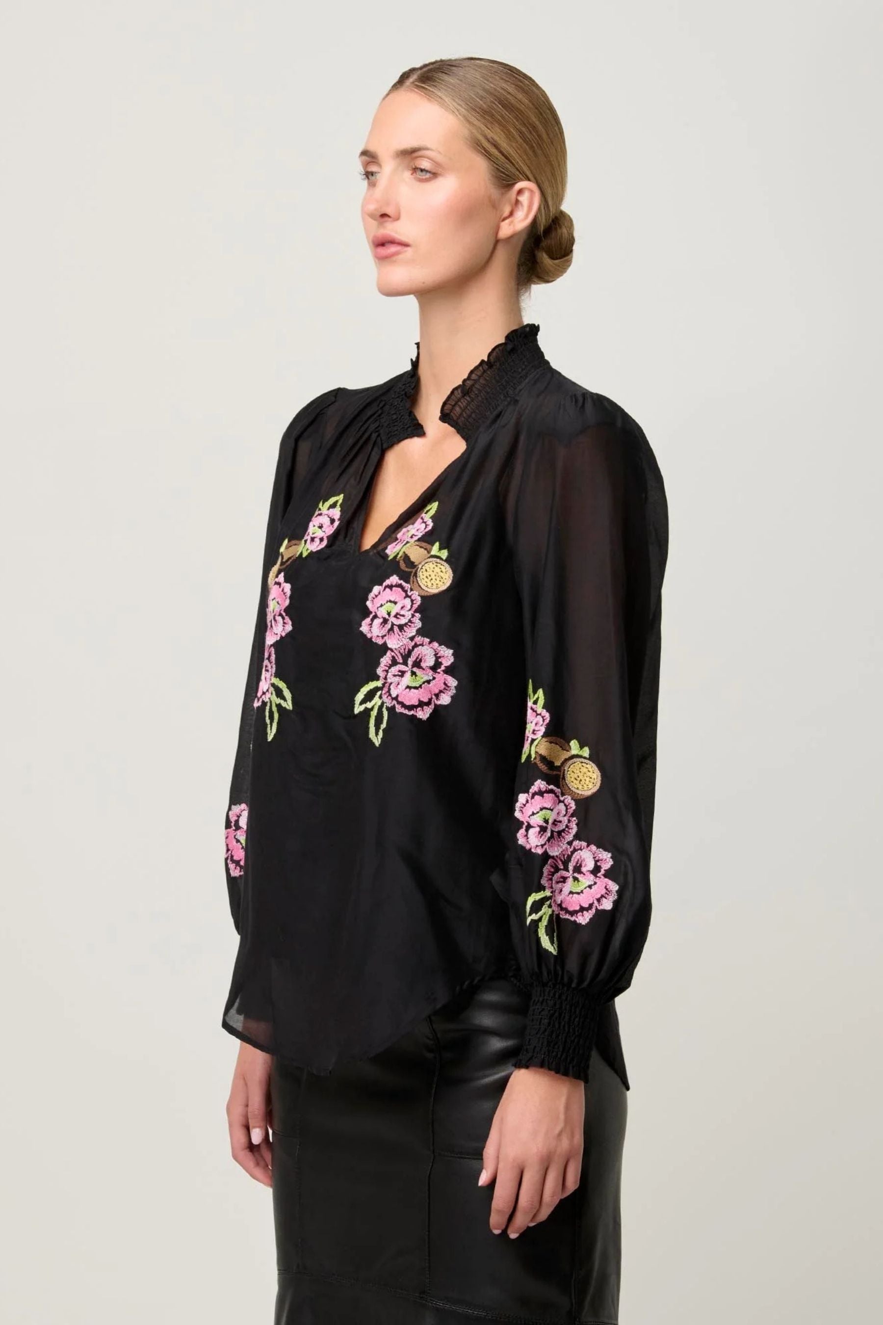 Catalina Embroidered Cotton Silk Blouse In Black Flores