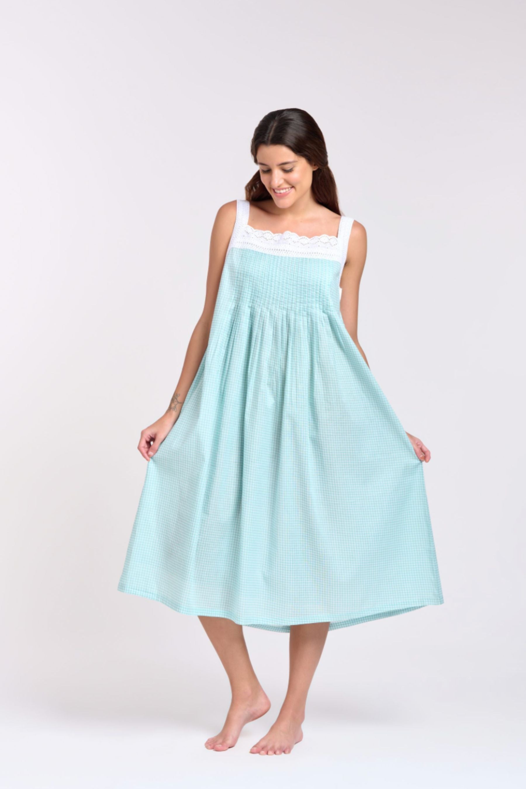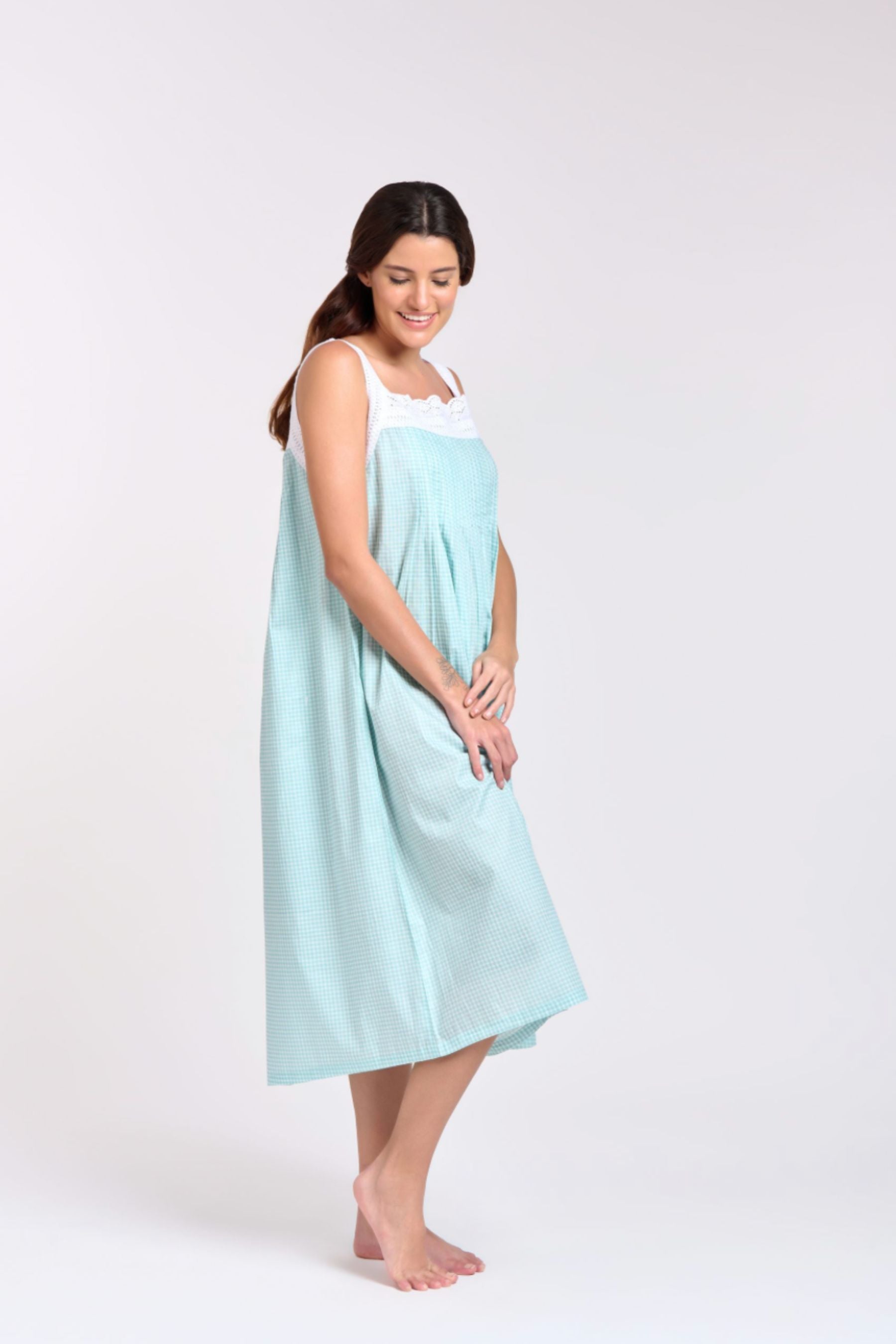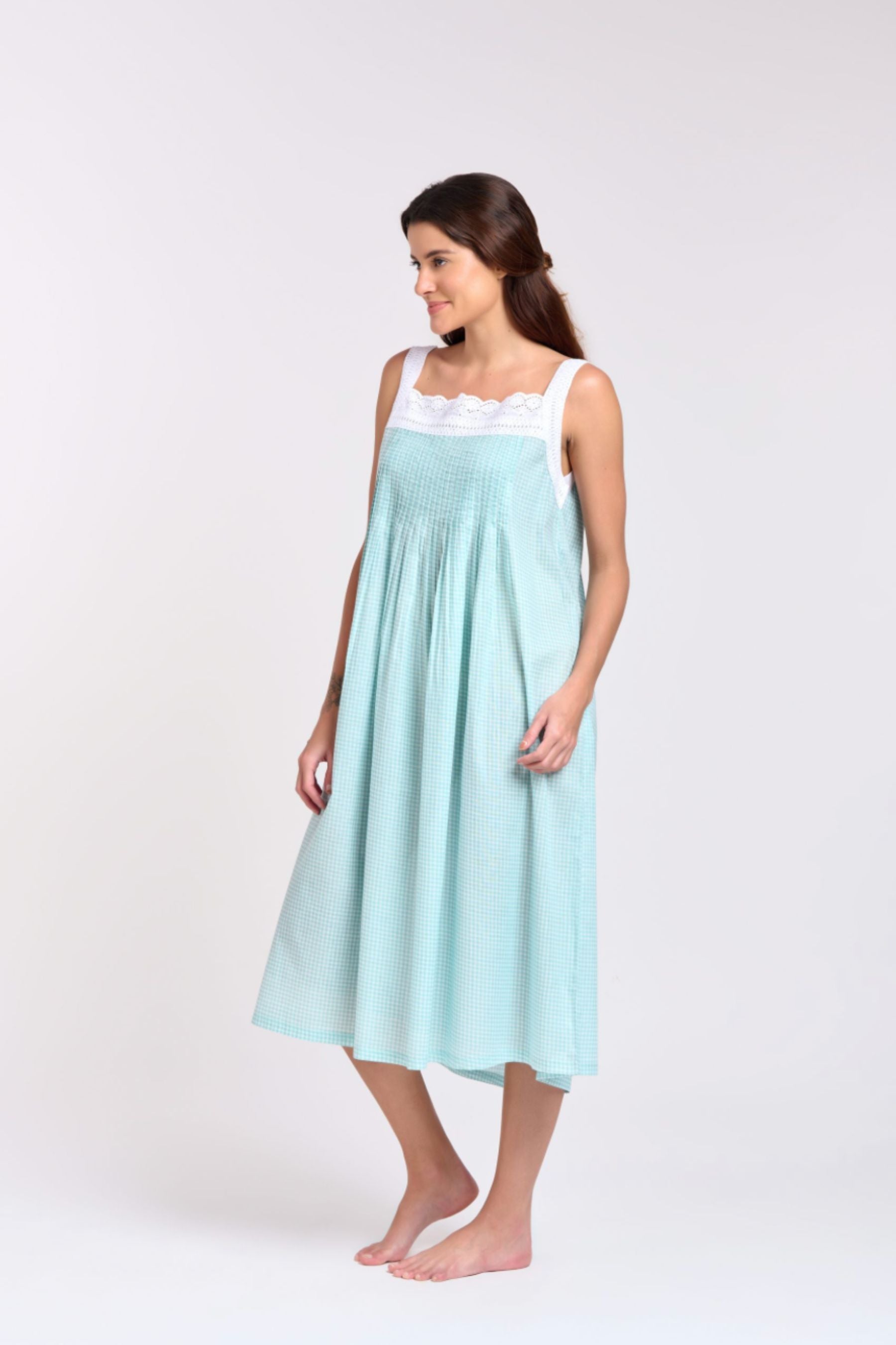 Pin Tucked Nightie | Aqua Gingham