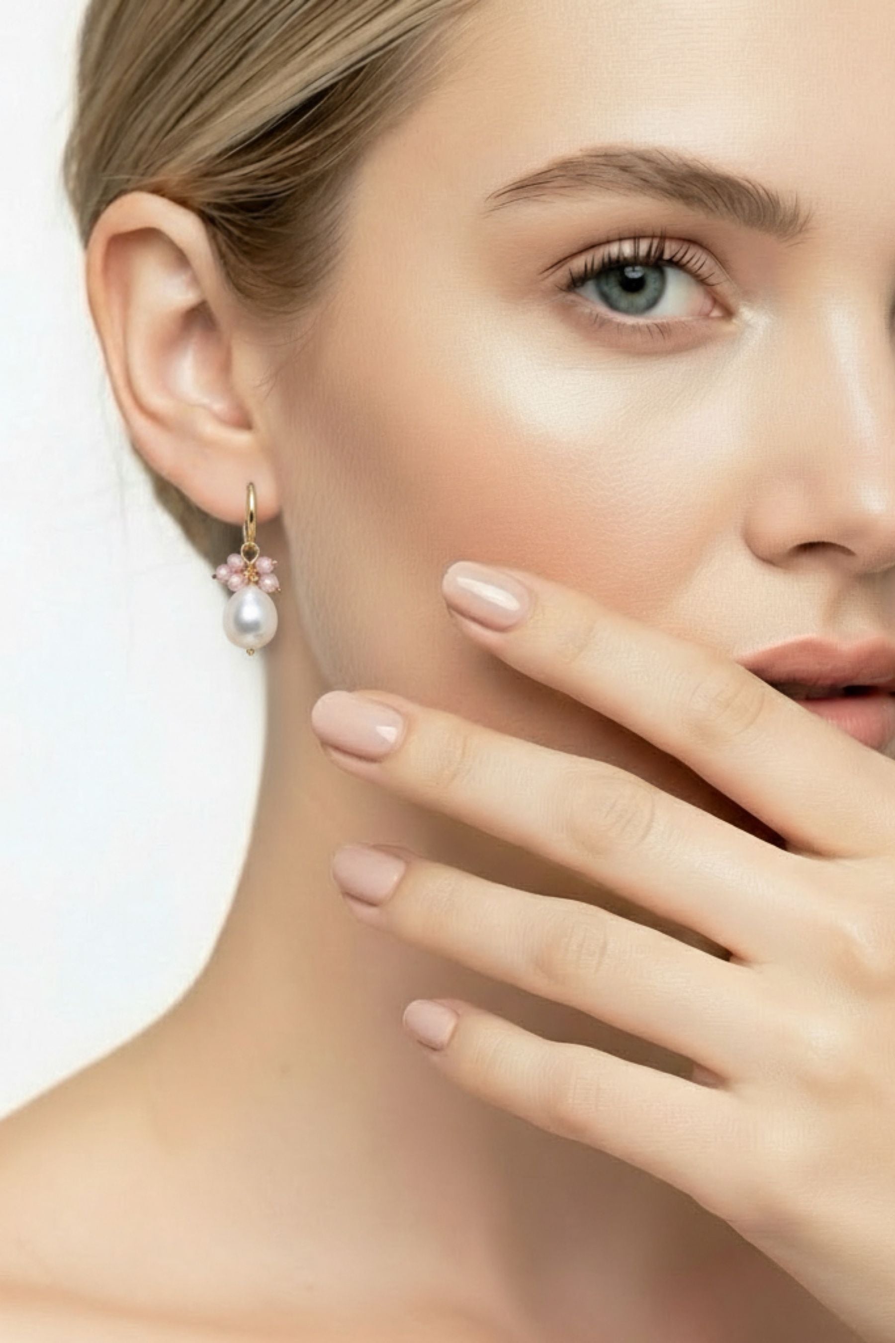 Small Hoops Stud With Stone & Pearl Drop | Pink Agate