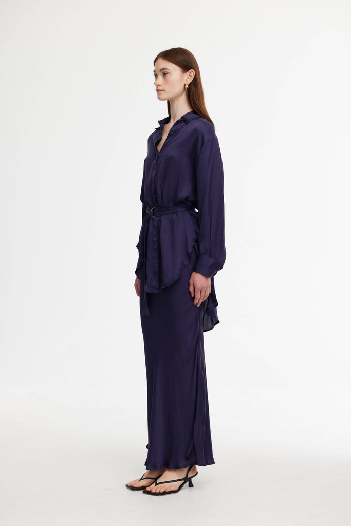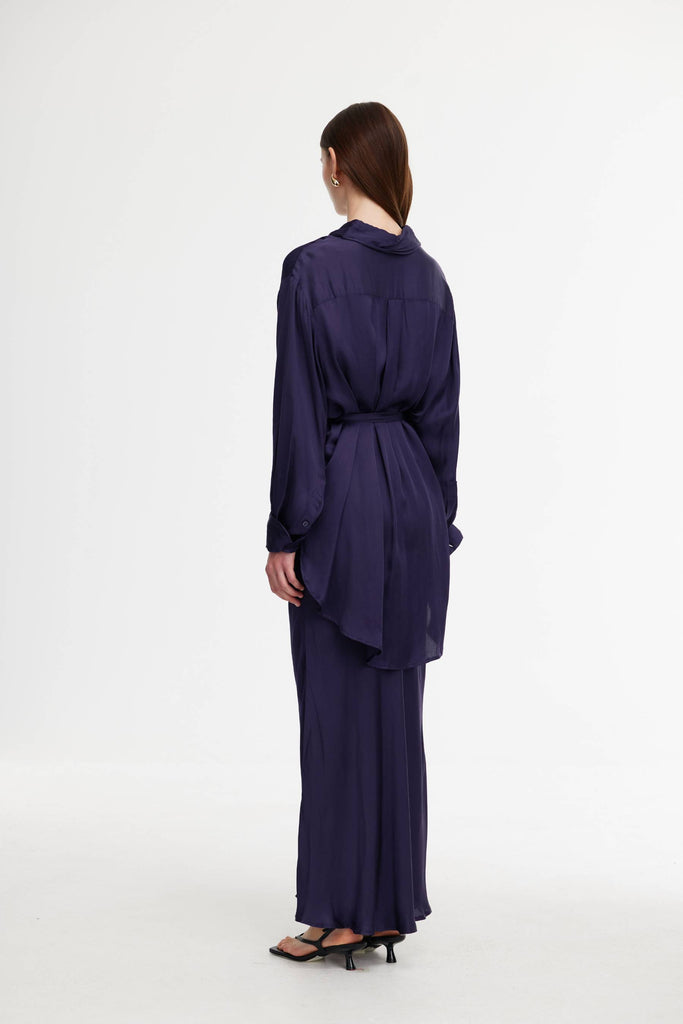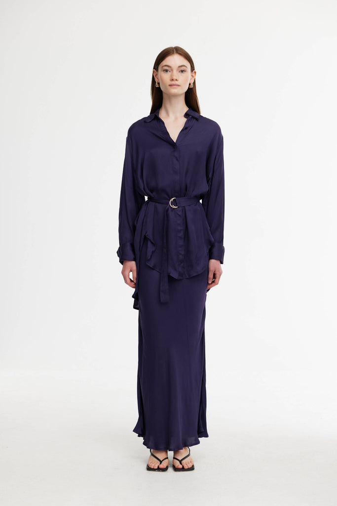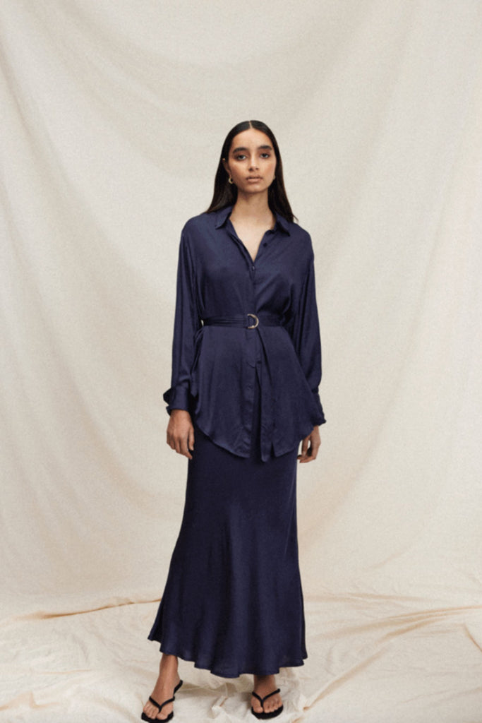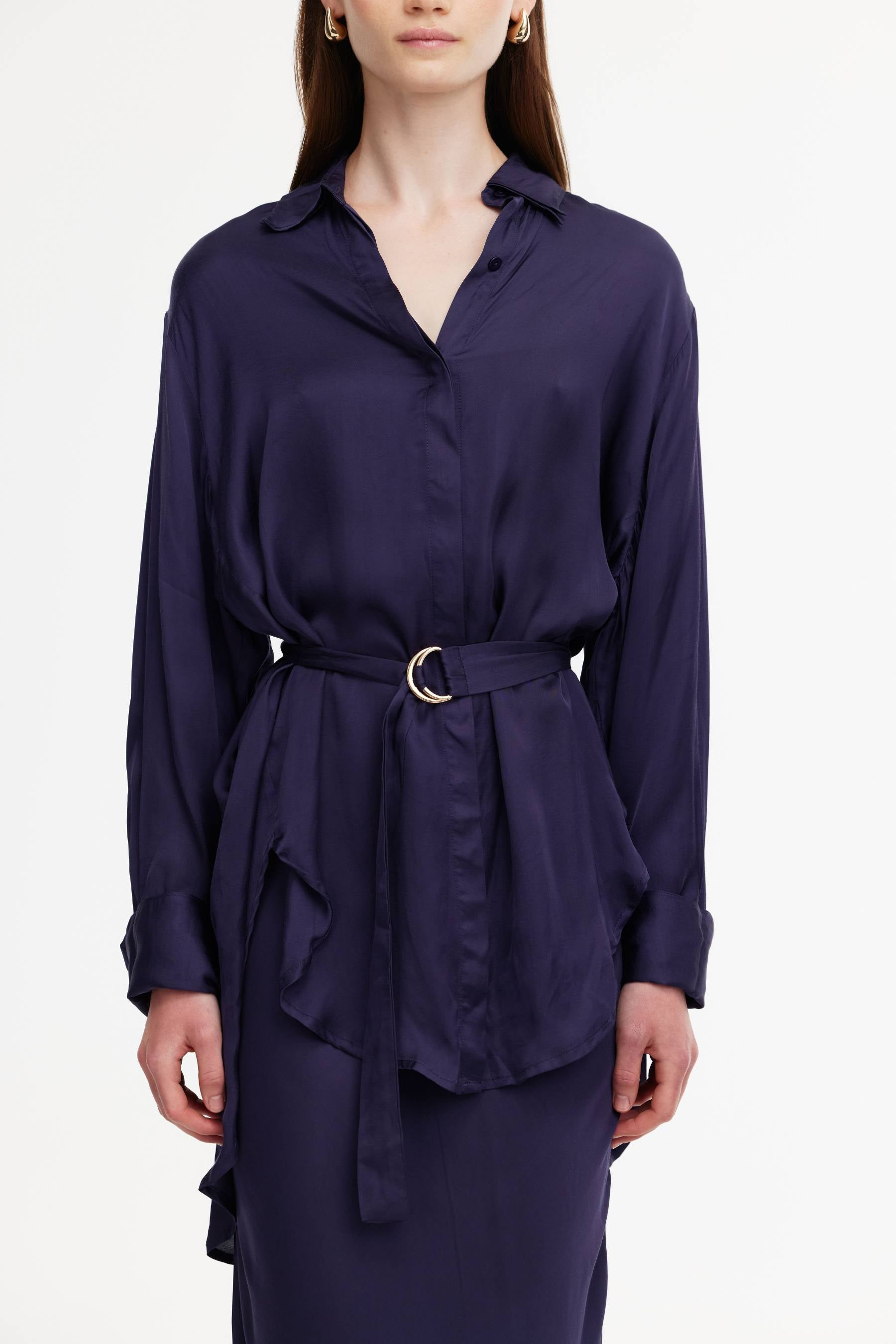 The Belted Noah Shirt is our classic shirt shape, re-designed with a waist tie and gold d-ring. This shirt features tailored cuffs, a double leaf collar and back yoke with box pleat detail.