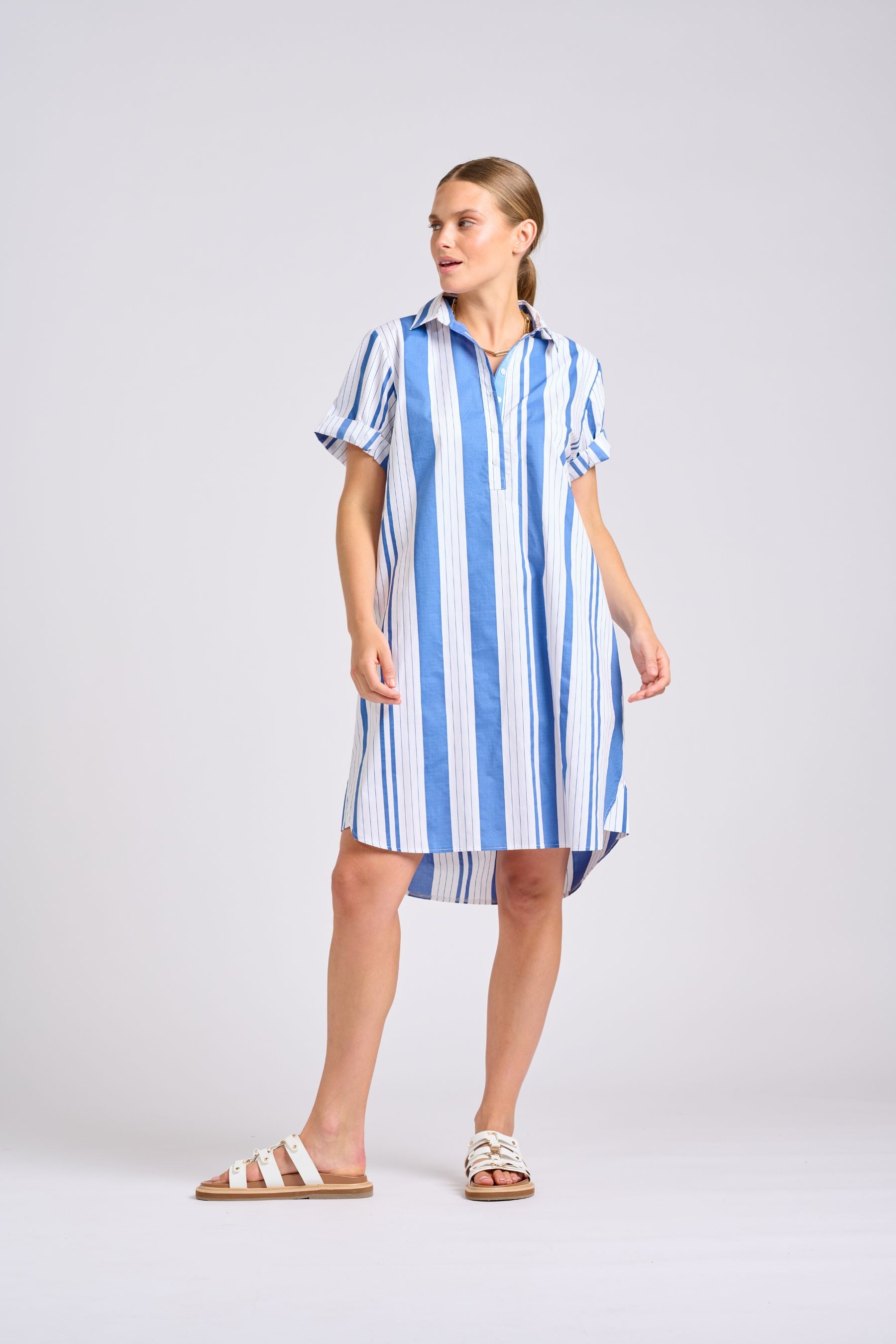The Evie Short Sleeve Shirtdress | Double Light Blue Stripe