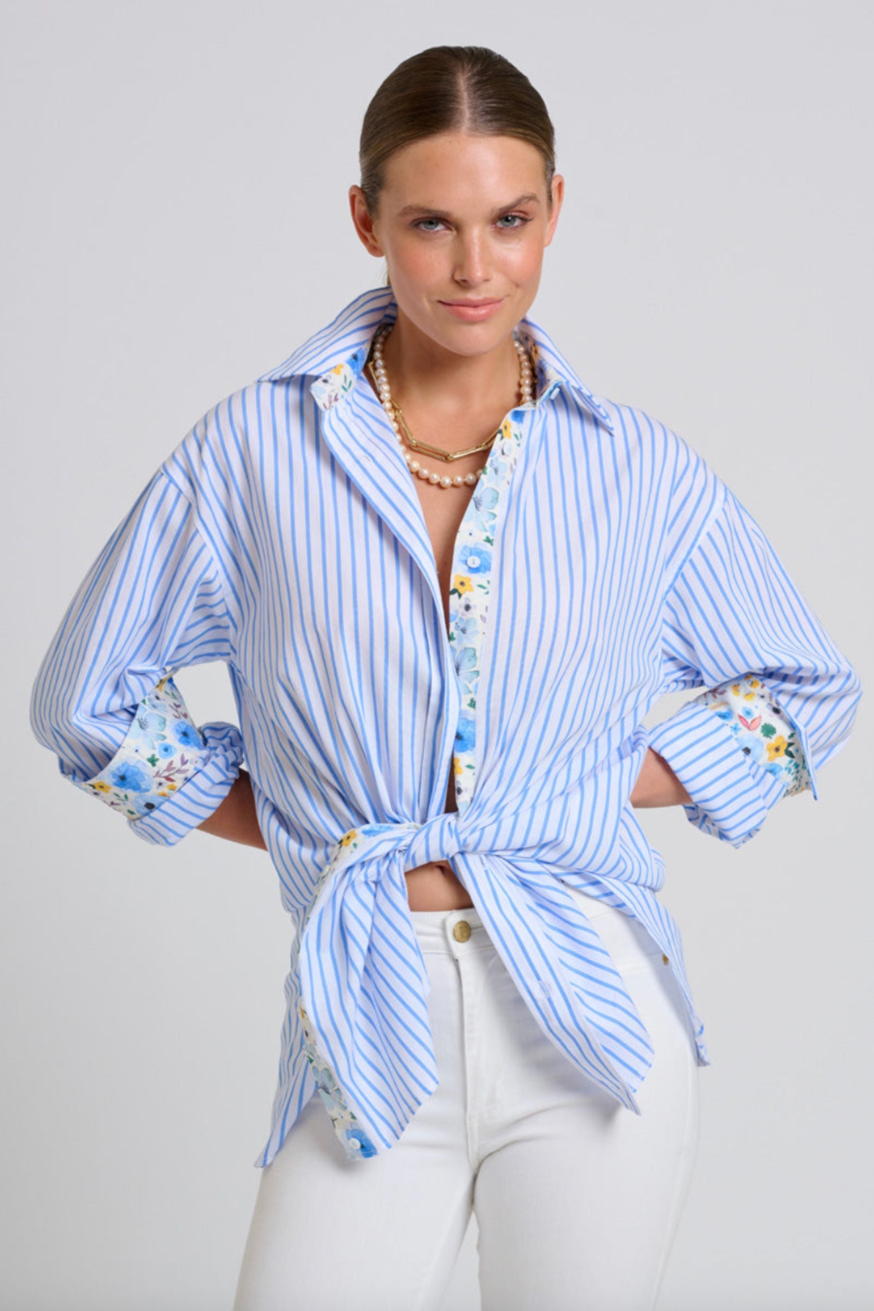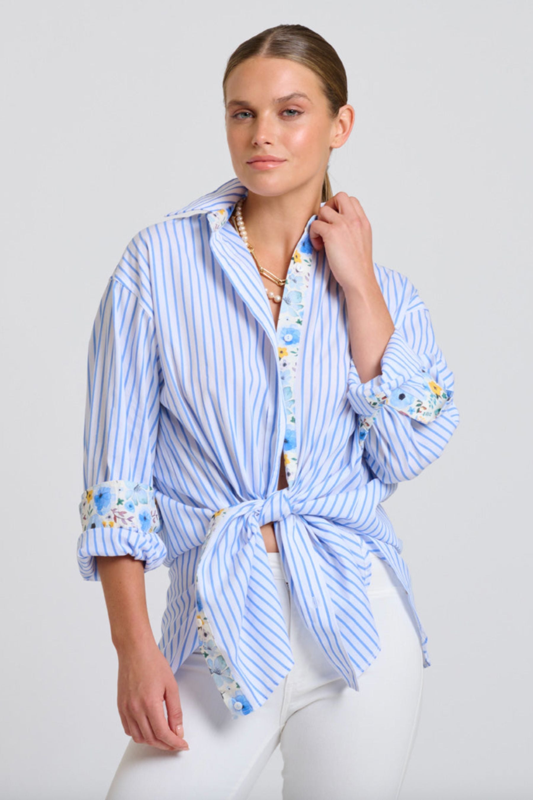 The Boyfriend Shirt | White with Blue Stripe Floral Trim