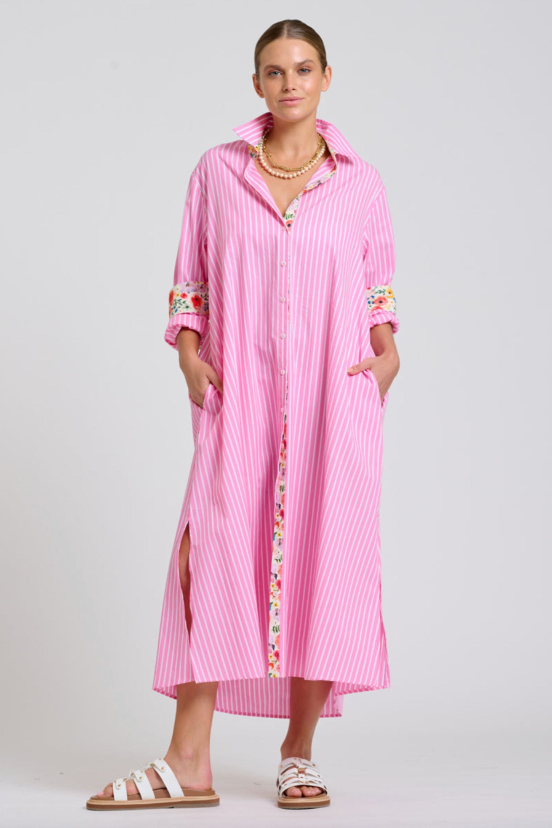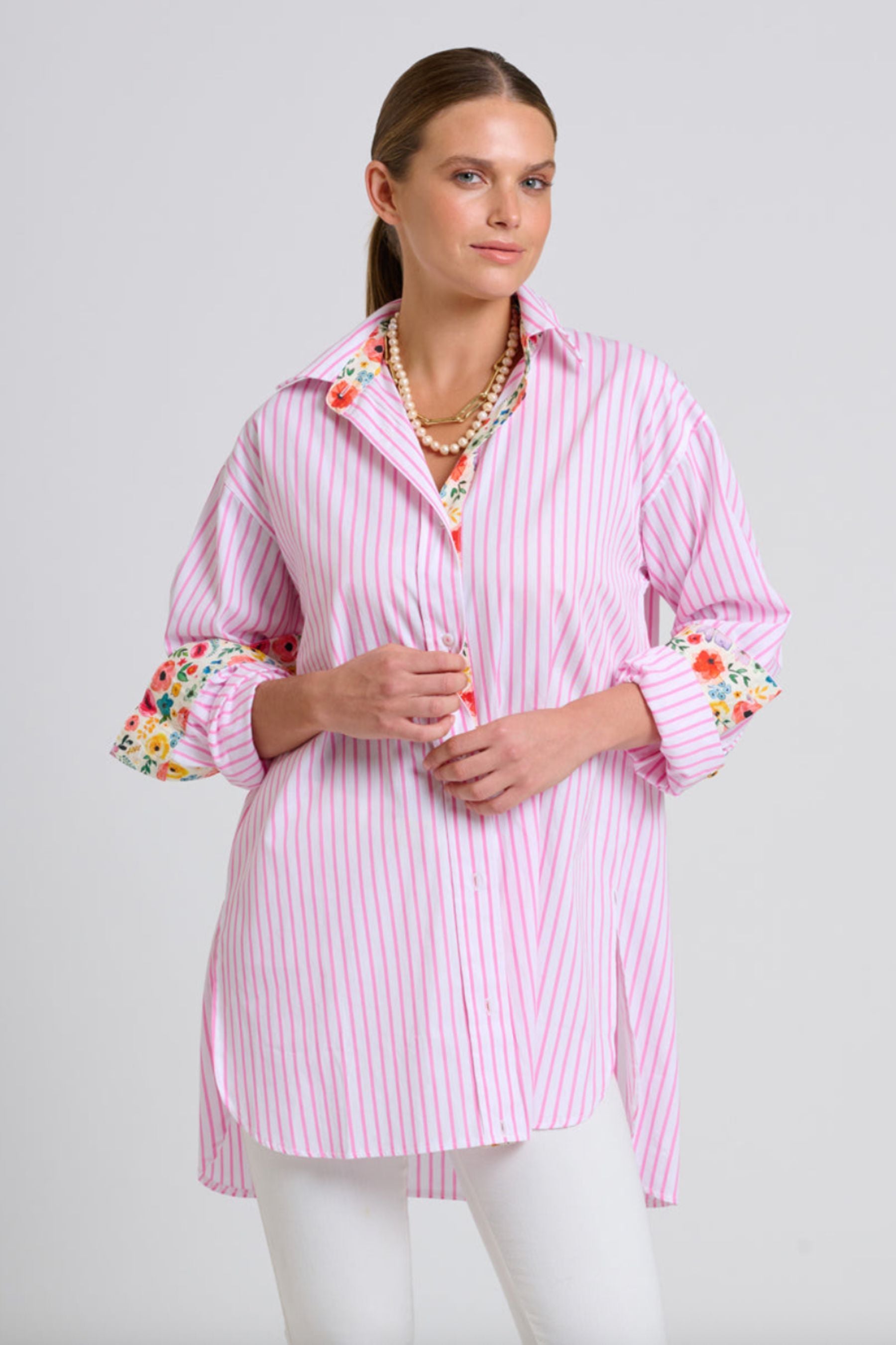 The Luna Longline Shirt Dress | Pink Stripe Floral Trim