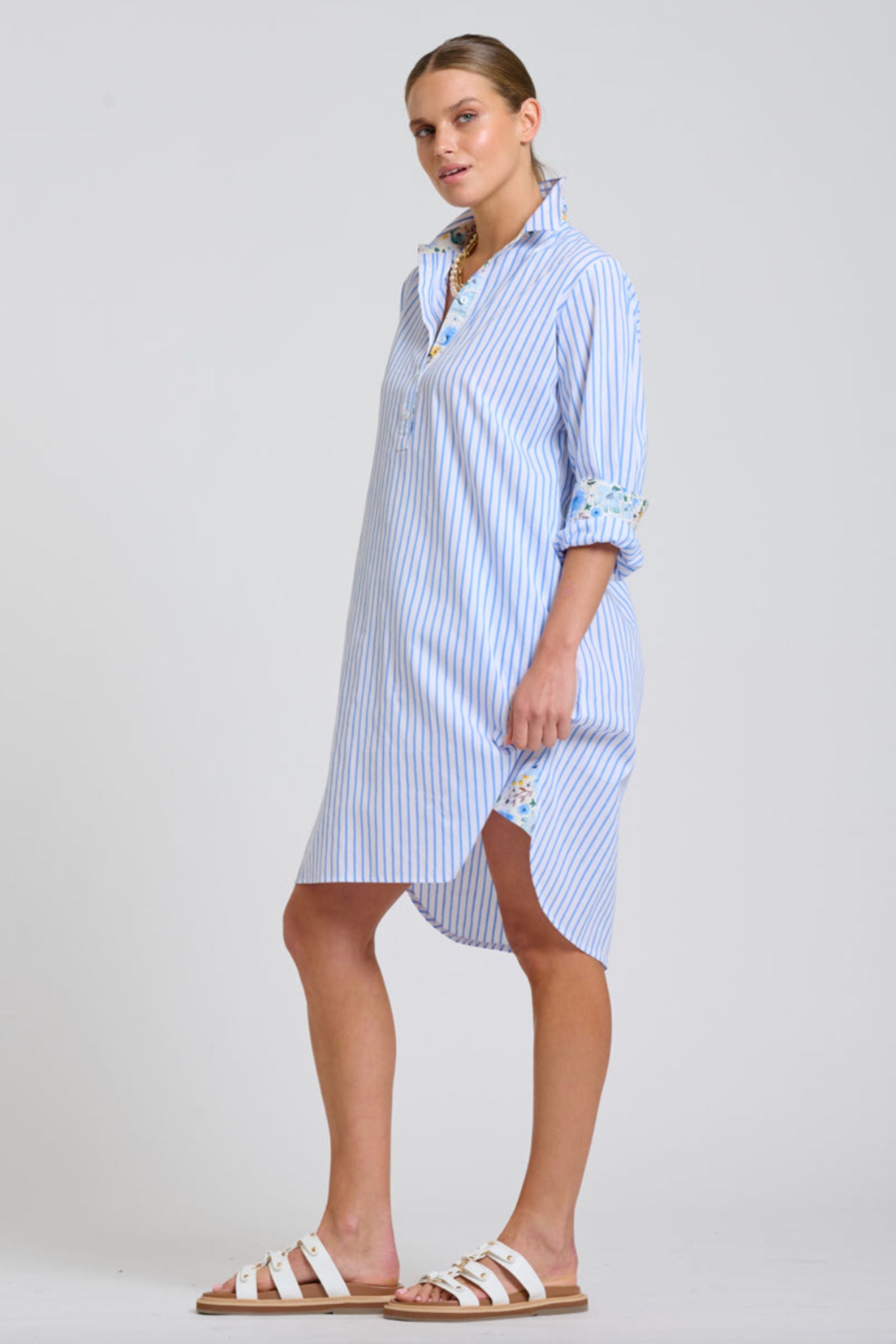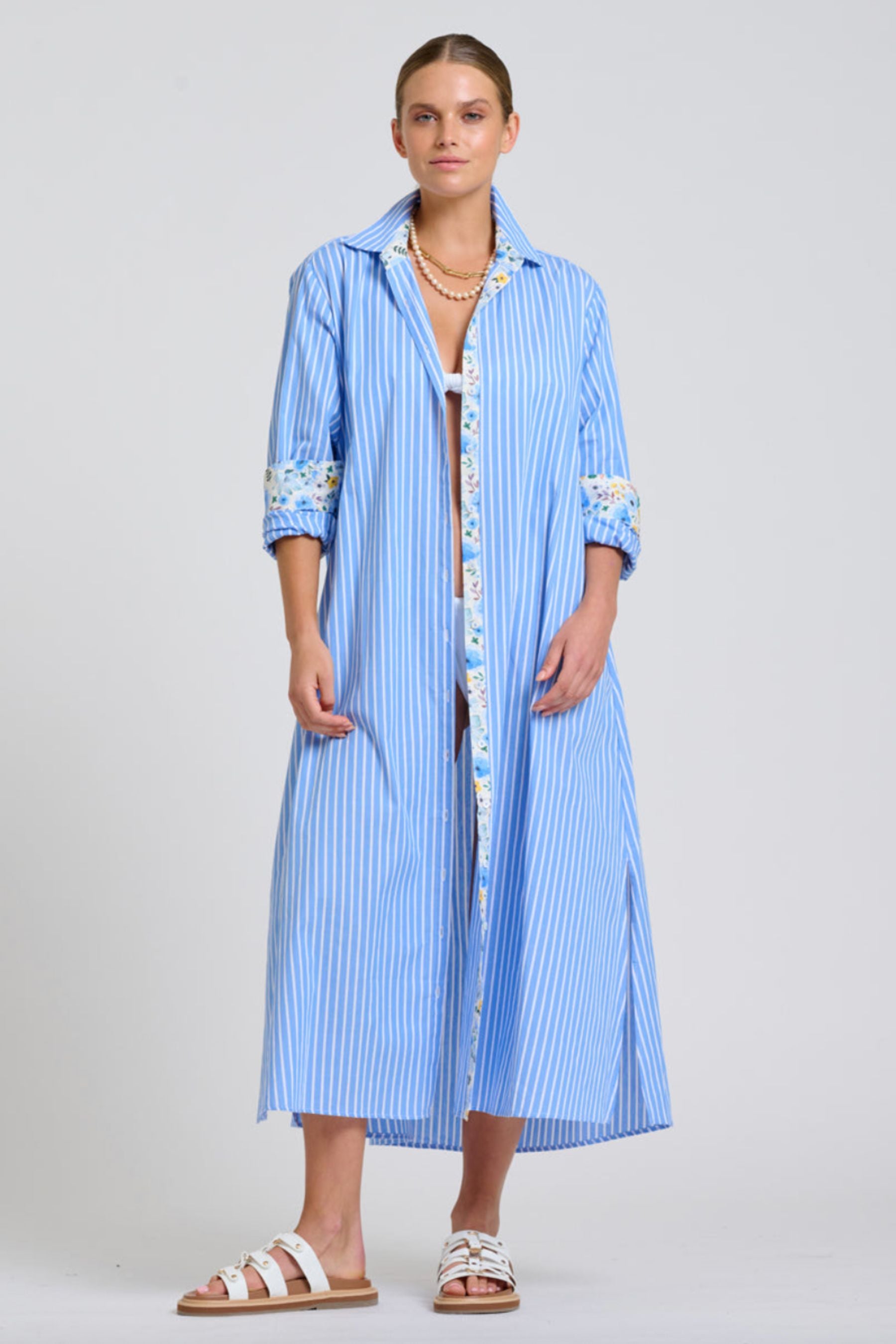 The Luna Longline Shirt Dress | Blue Stripe Floral Trim