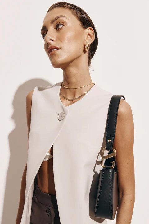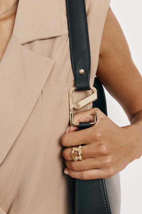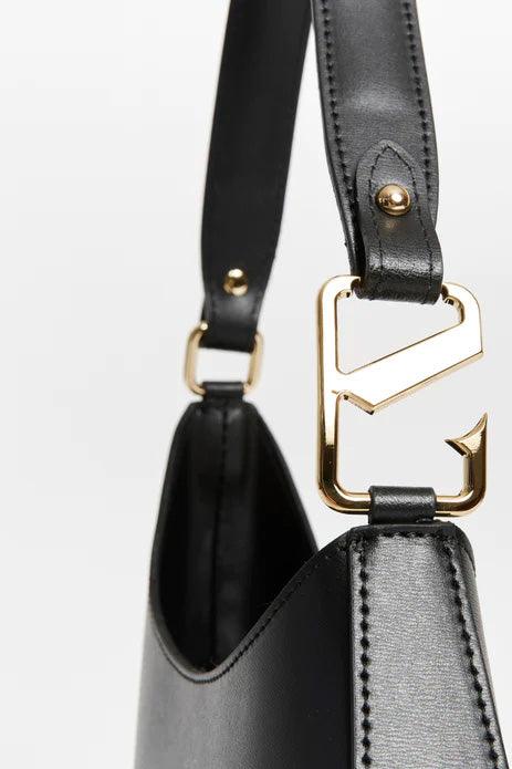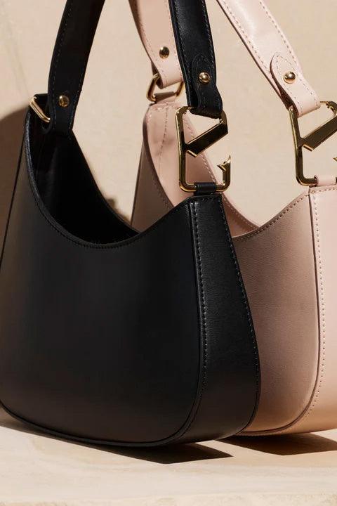 The Alyssa shoulder bag effortlessly transitions from day to night, offering a sleek and versatile accessory. Elevate your look with its chic asymmetrical silhouette, accentuated by the distinctive 'V' logo hardware adorning the shoulder strap.