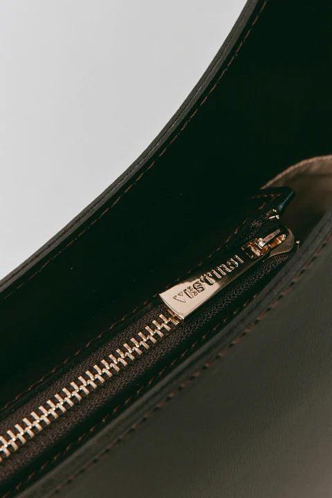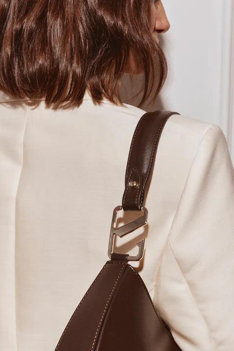 The Alyssa shoulder bag effortlessly transitions from day to night, offering a sleek and versatile accessory. Elevate your look with its chic asymmetrical silhouette, accentuated by the distinctive 'V' logo hardware adorning the shoulder strap.