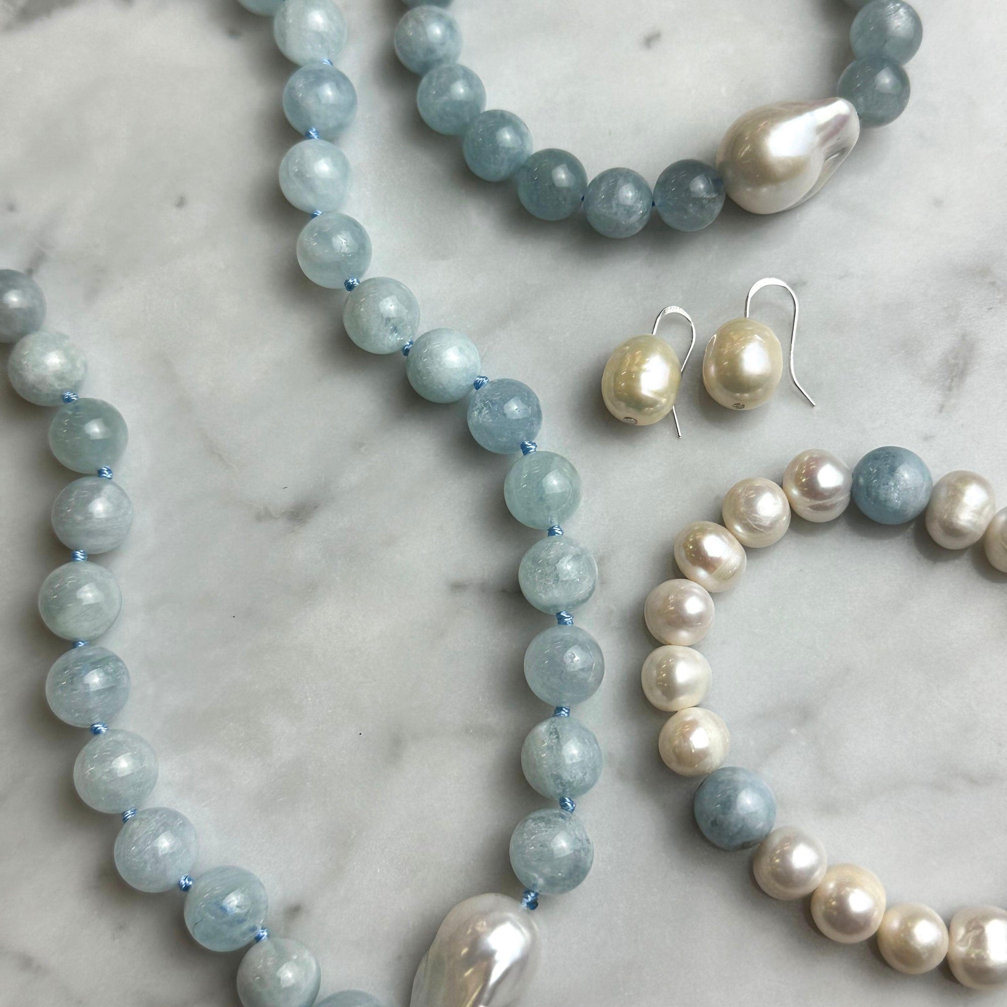 10mm Aquamarine and beautiful baroque pearl, elasticated