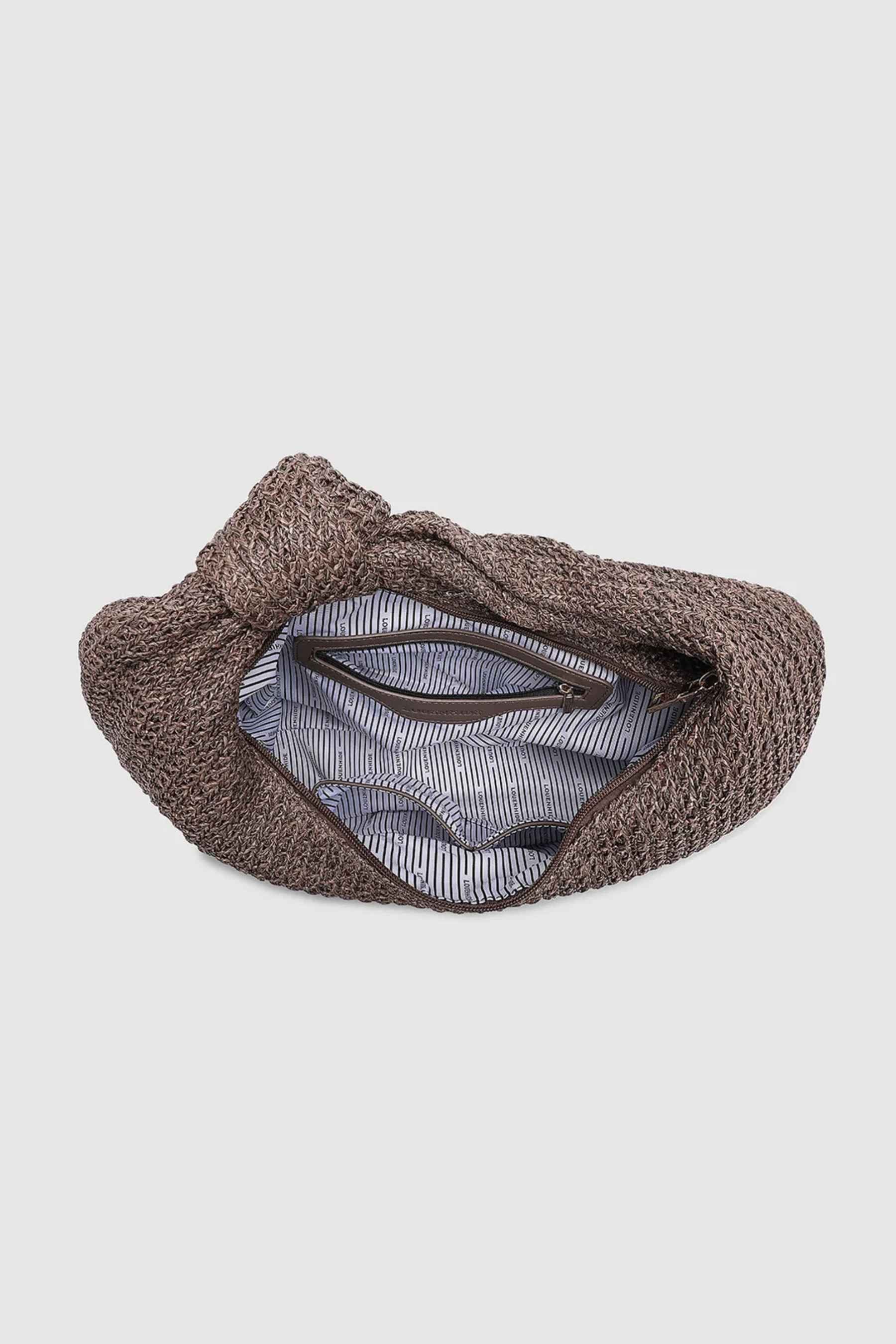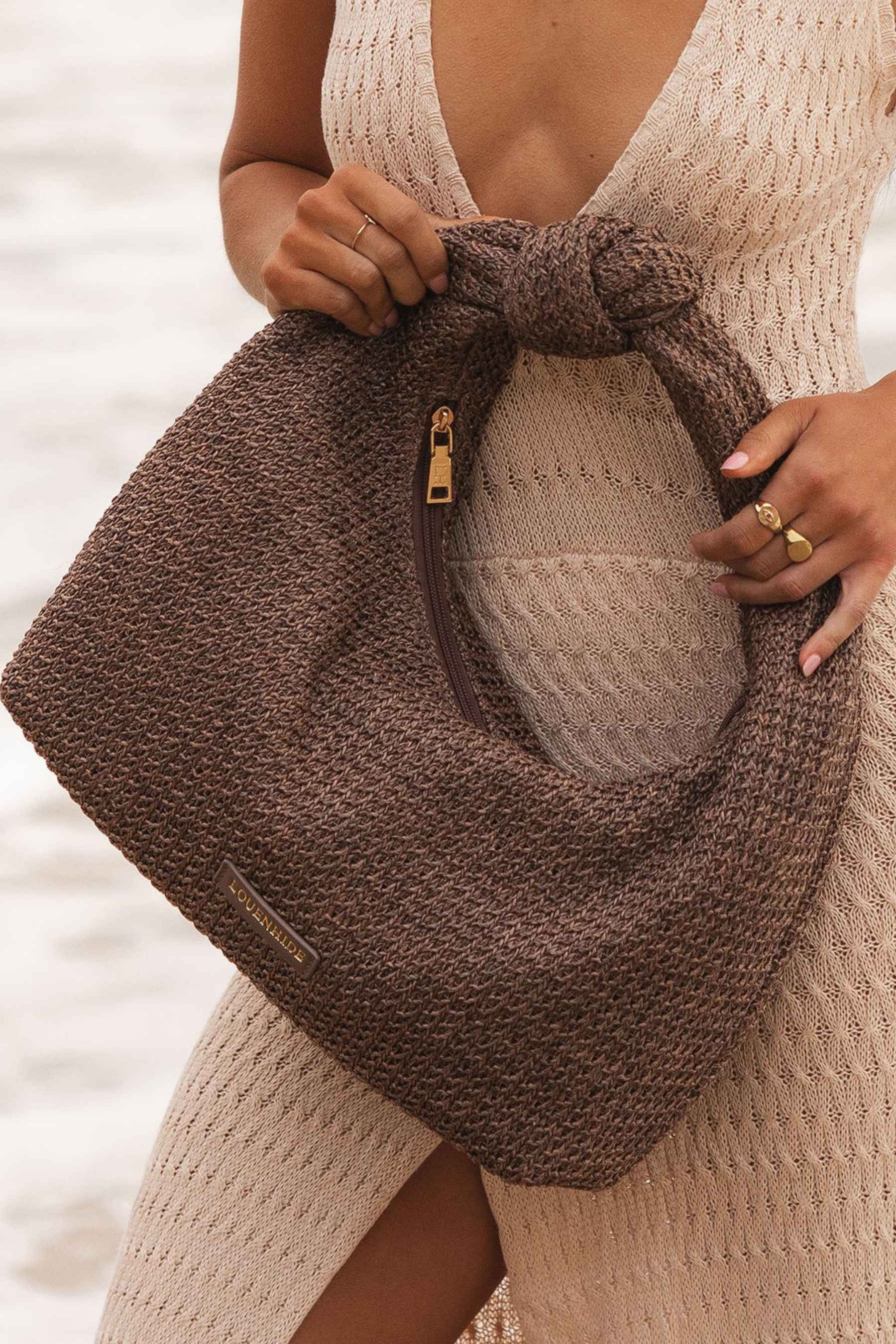 The Louenhide Bahama Chocolate Shoulder Bag will keep you looking put together as you seamlessly transition from beachside to brunch. Where the rich texture of raffia meets a subtle metallic thread woven throughout, this slouchy shoulder bag exudes an effortless charm. The shoulder straps distinctive knot detailing further elevates its unique form, while enhancing your summer style appeal. Embracing the allure of a soft structure, this women’s textured shoulder bag offers both comfort and style for those laid-back summer days. Make Bahama Chocolate the cornerstone of your seasonal wardrobe and revel in the compliments that are sure to follow!