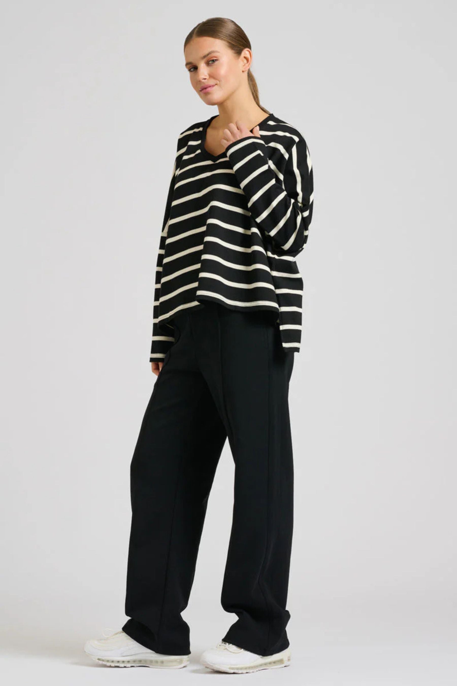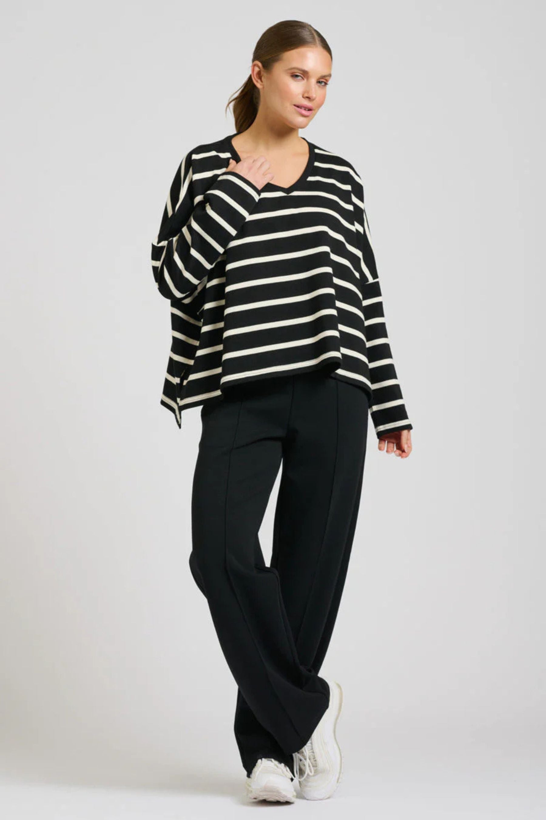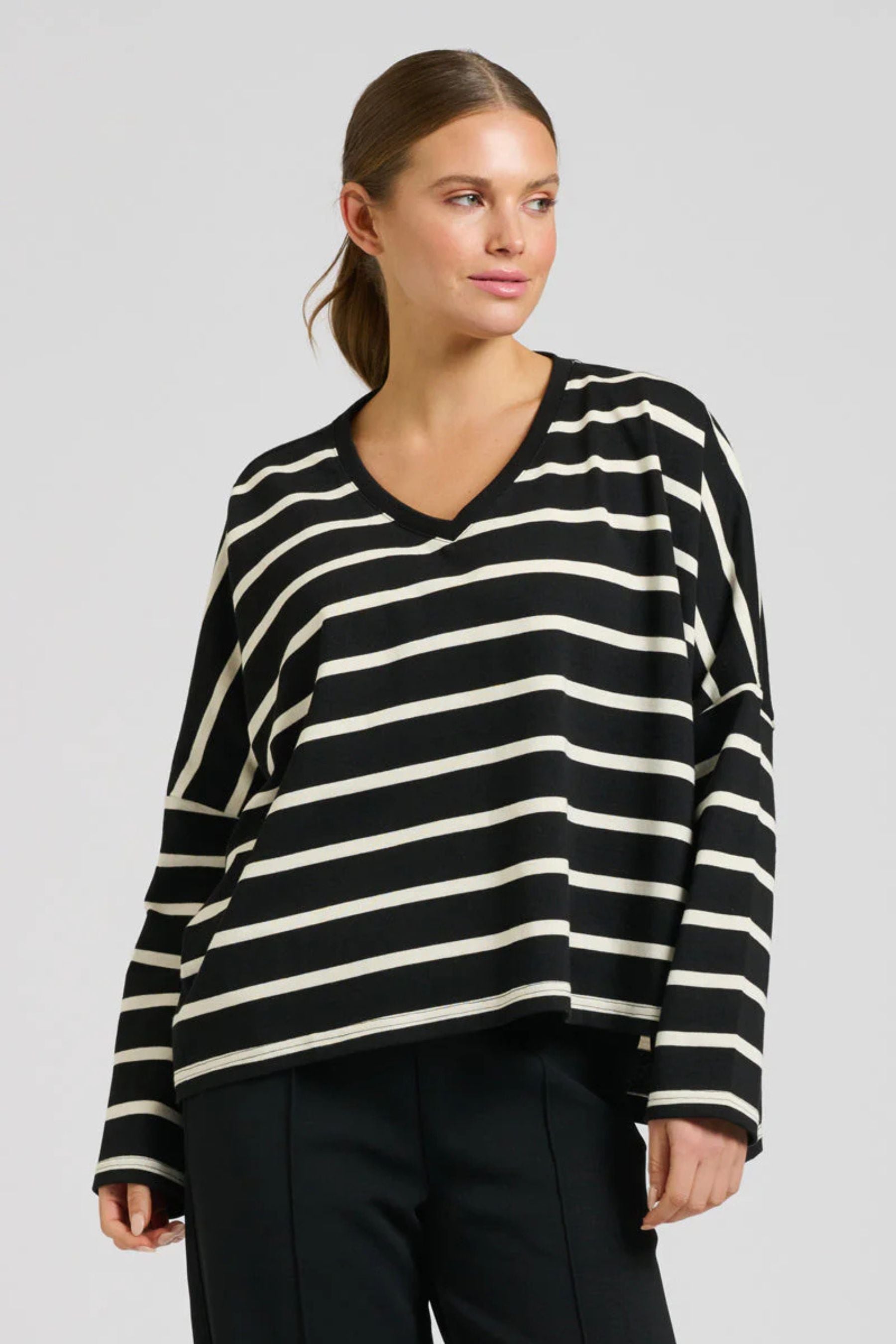 Our new oversized V neck Breton. An oversized fit, crafted from mid weight knitted cotton, flattering boxy cut, high low hem, a perfect laying piece for all seasons.