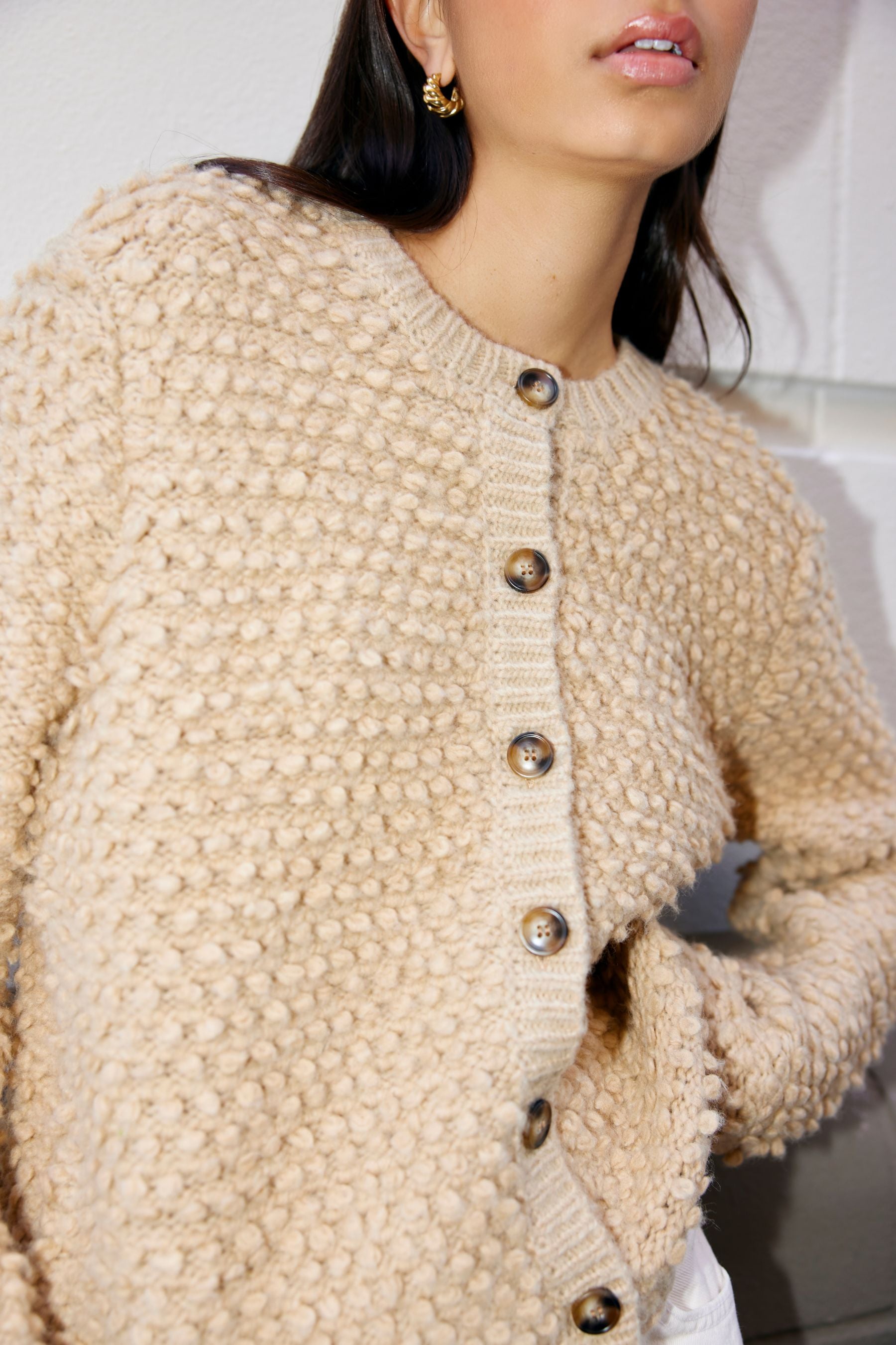 Introducing the Cassidy Cardi in Stone – the ultimate blend of cozy and chic. This gorgeous cardigan features a beautiful bobble detail that adds texture and charm, making it a standout piece in any wardrobe. Crafted from a luxurious blend of 80% wool and 20% nylon, the Cassidy Cardi is soft, warm, and perfect for those colder months.