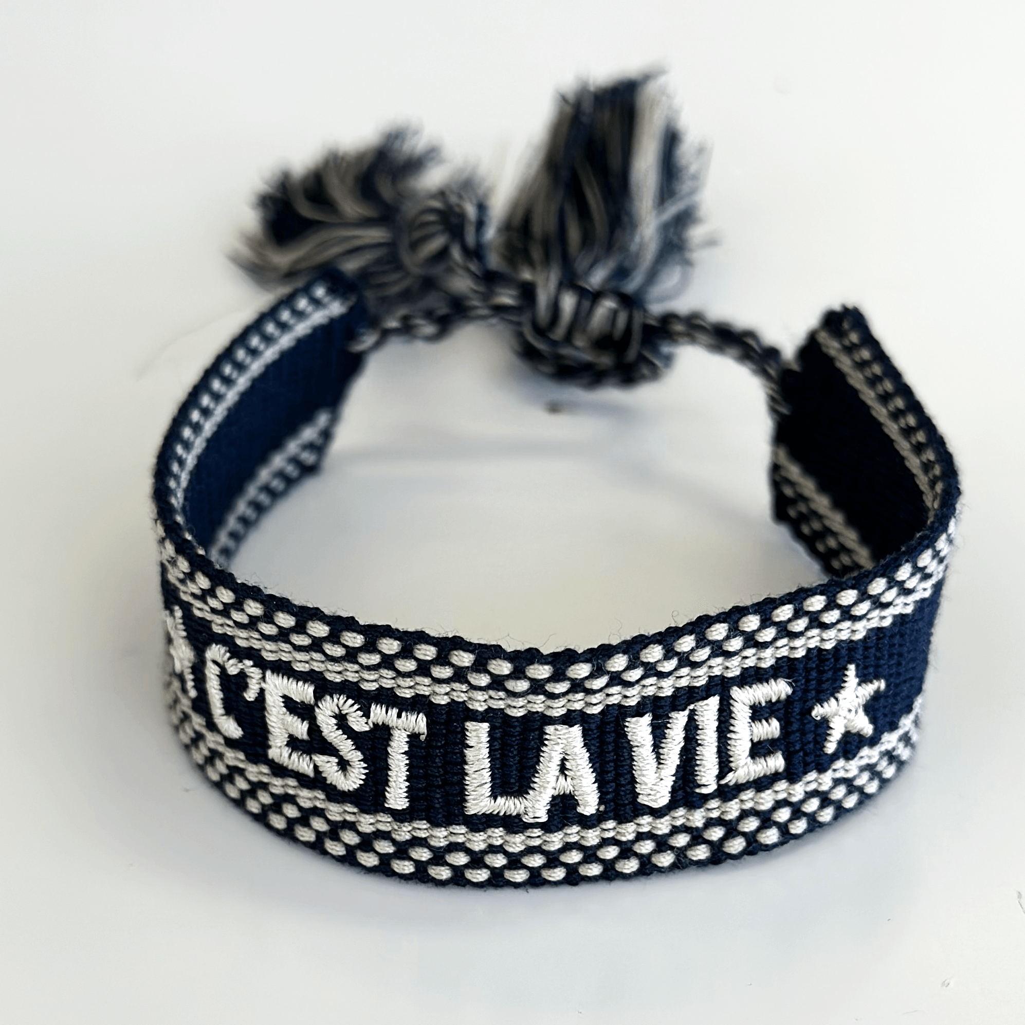 The C'EST LA VIE bracelet, the perfect gift for the fashionista in your life or a little treat for yourself. The bracelet is adjustable with its handmade cords, and may be worn for any occasion, alone or stacked with other bracelets.