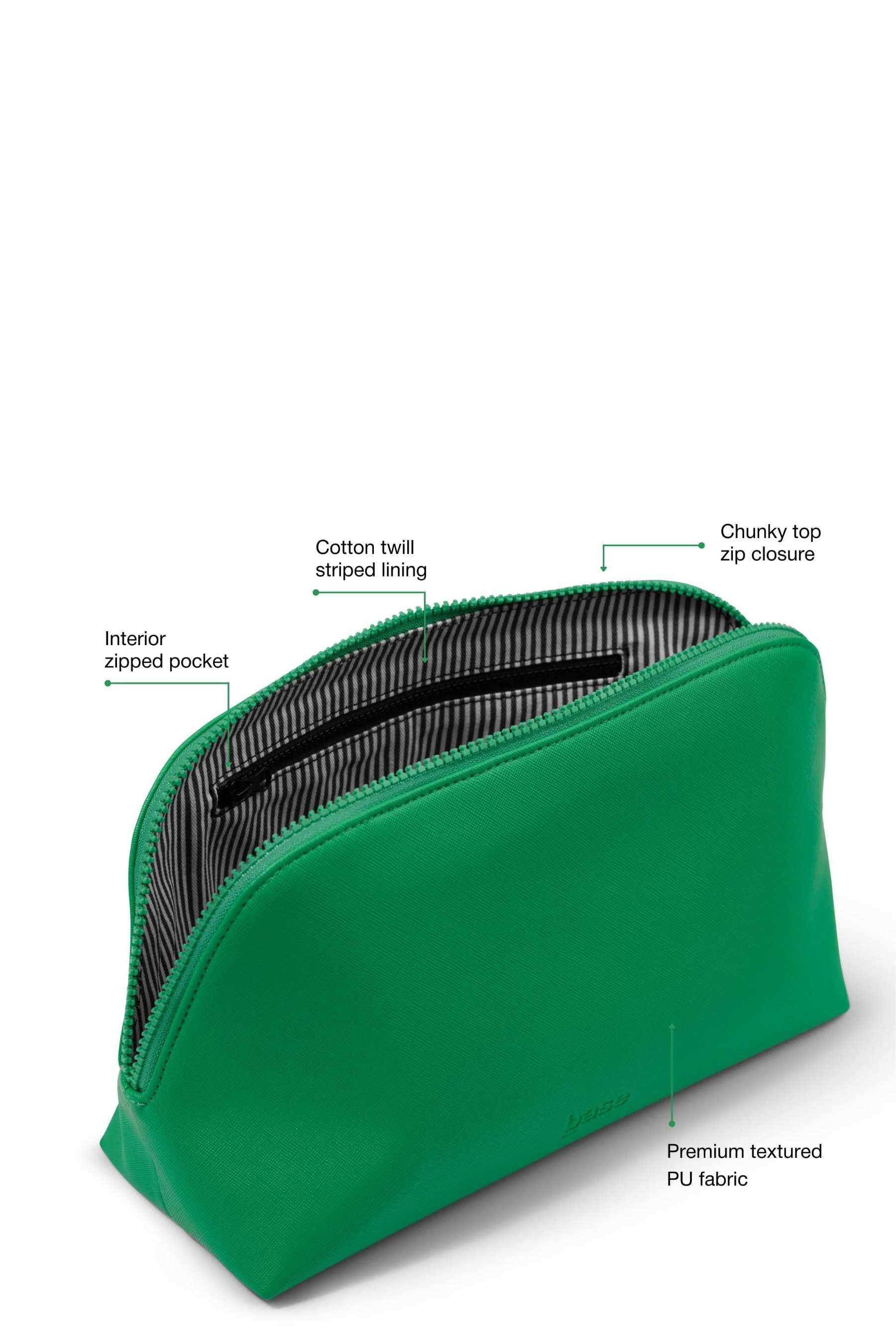 The semi circle shape of our cosmetic base large holds more than the basics. A wide mouth opening with a chunky zip top makes it easy to grab what you need. The interior zip pocket keeps smaller items safe.