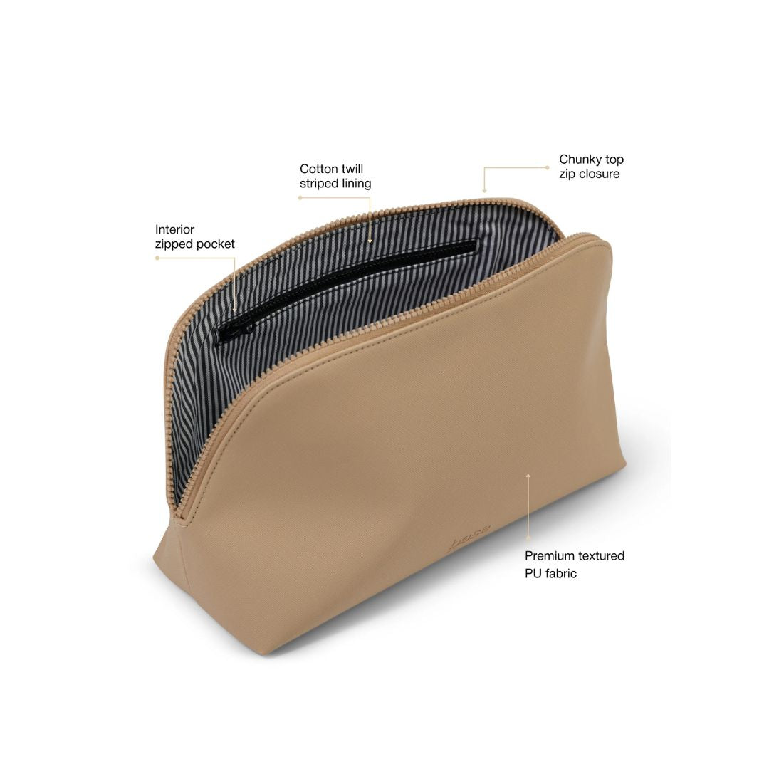 The semi circle shape of our cosmetic base large holds more than the basics. A wide mouth opening with a chunky zip top makes it easy to grab what you need. The interior zip pocket keeps smaller items safe.