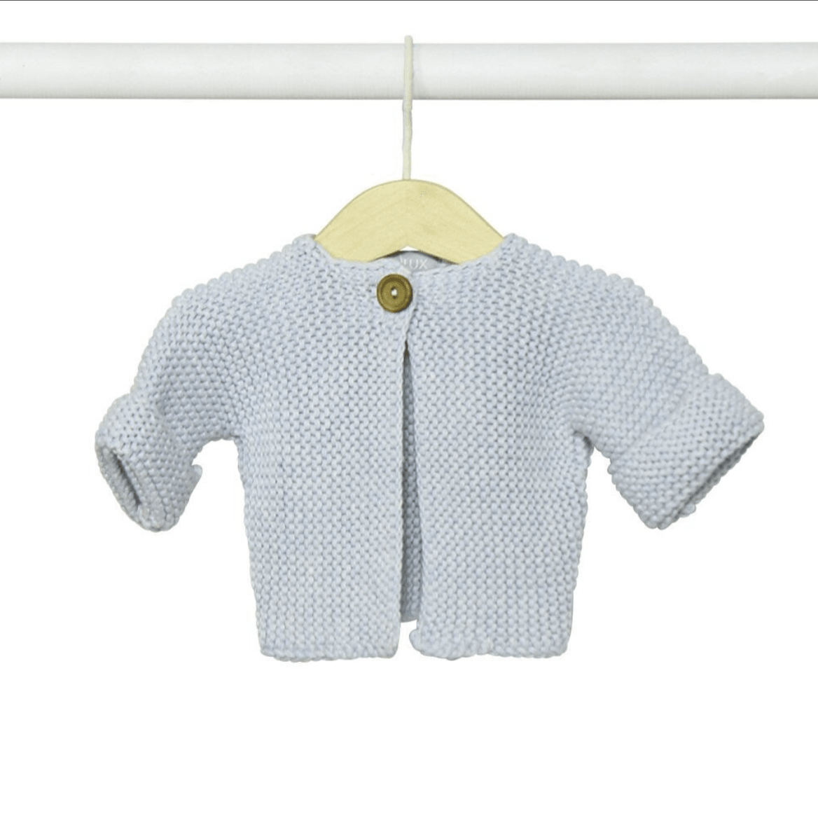 Our Elf knitted baby cardigan is designed to keep baby warm. Knitted from the softest cotton yarns and finished with a button at the neck and turn back sleeves. This cardigan makes a great gift.