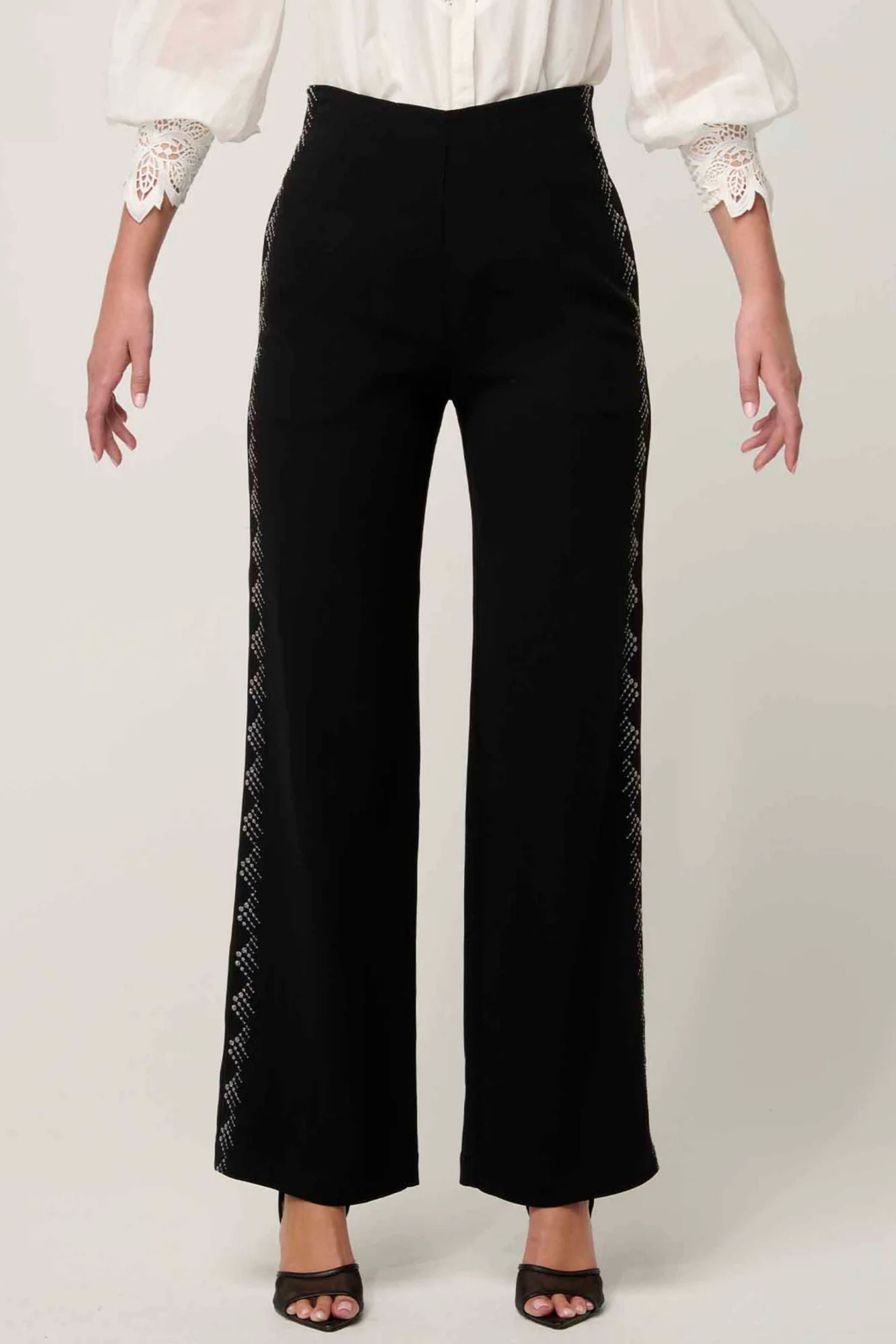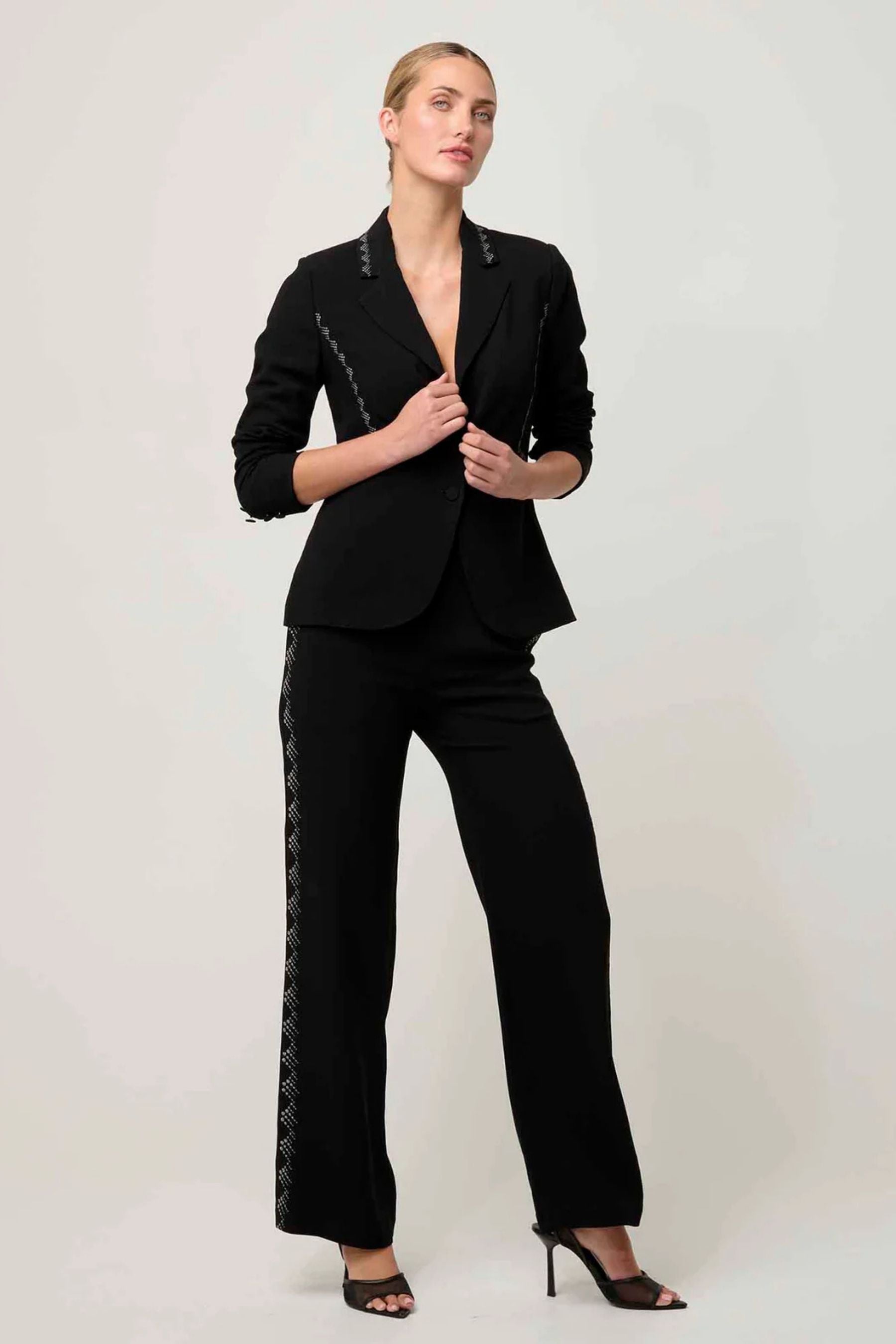 Step into effortless elegance with the Elvira Viscose Stretch Crepe Pant in Onyx. Designed for the modern woman who commands attention, these high-waisted, wide-leg trousers exude sophistication with their sleek silhouette and delicate embroidery cascading down the sides.