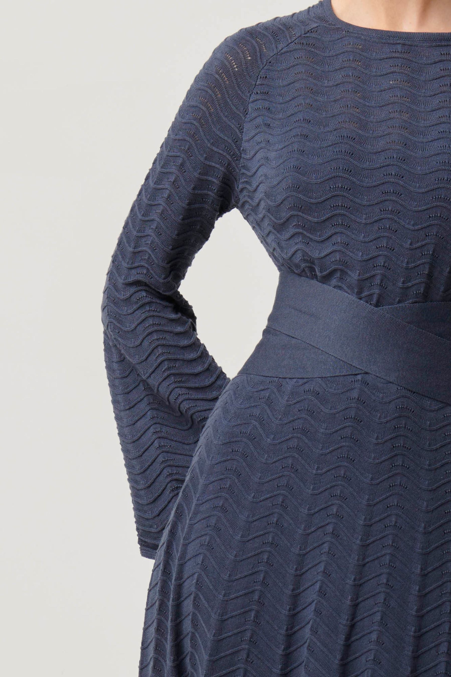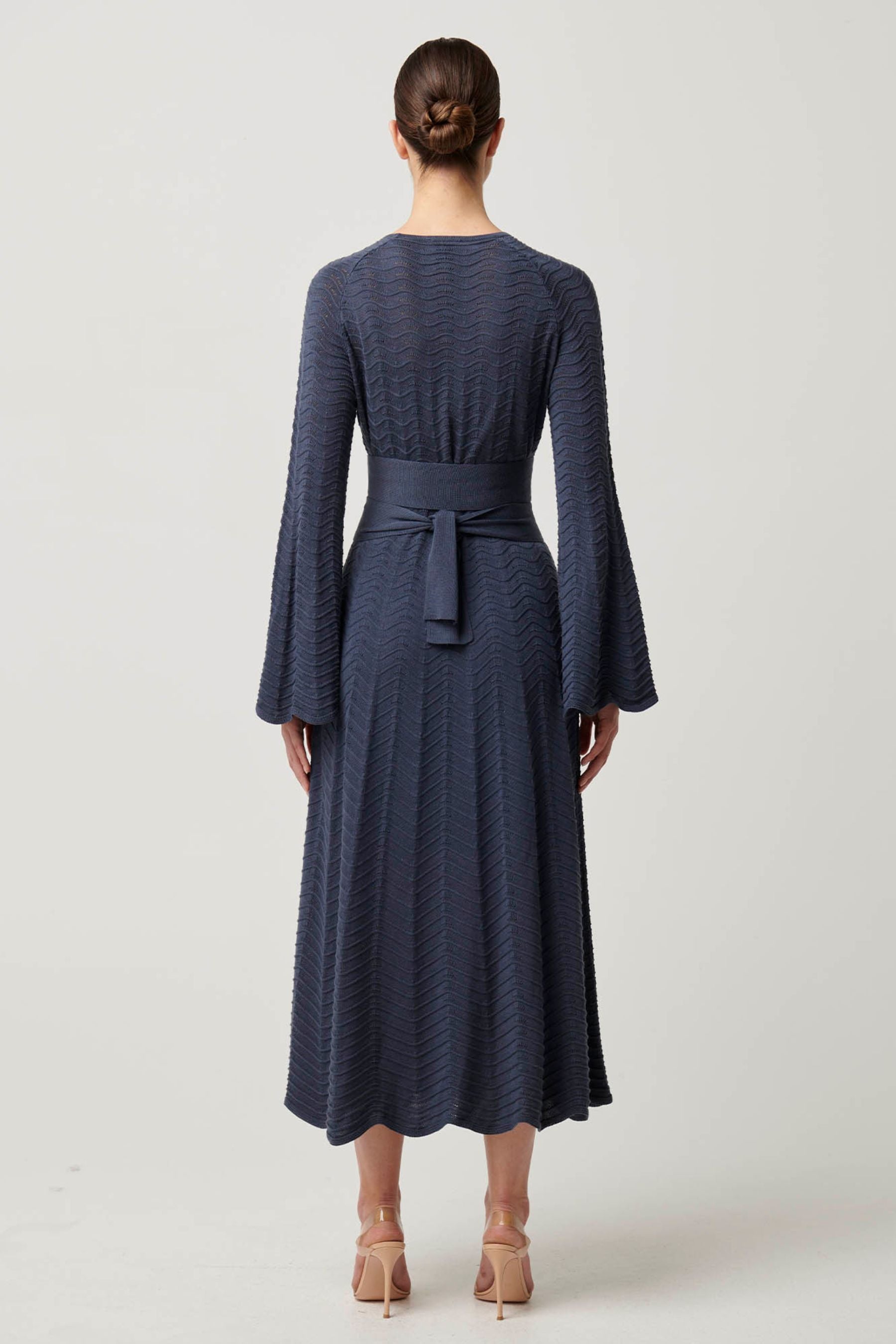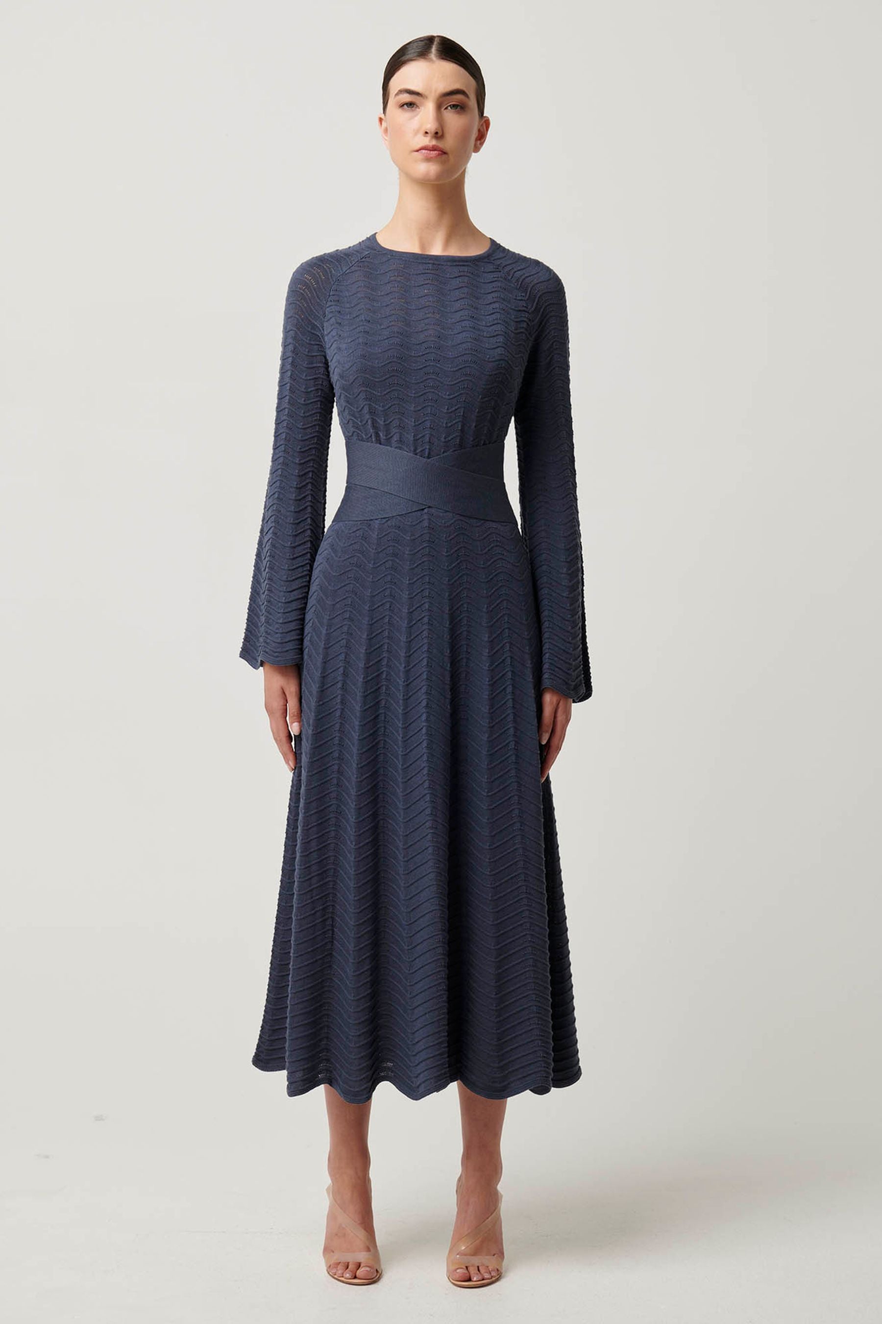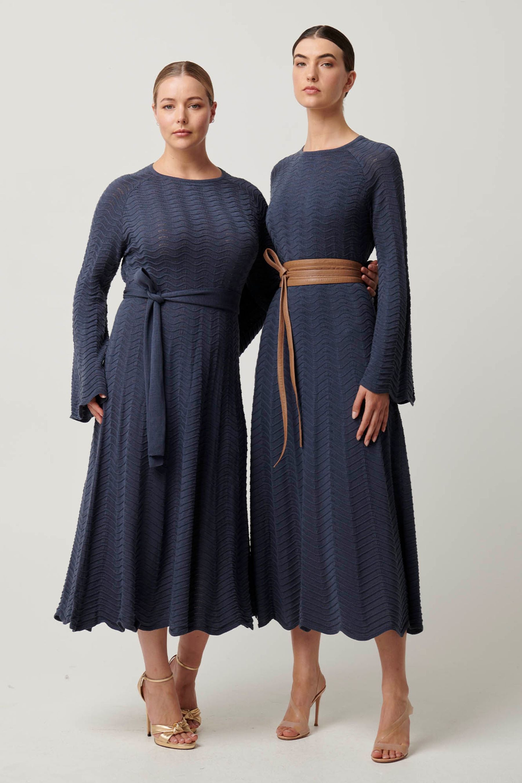 Wrap yourself in effortless elegance with the Everett Cotton Lyocell Wave Knit Midi Dress in Bluestone. Perfect for modern, sophisticated styling, this dress showcases a stunning wave knit texture that adds visual depth and movement, beautifully complementing its classic midi length. Crafted from a blend of cotton and lyocell, it ensures softness, breathability, and comfort for all-day wear. Featuring long bell sleeves and a flattering fit and flare silhouette, this dress creates a graceful, feminine look that flows beautifully with every step. Style it with a cinched belt to accentuate the waistline, for an elevated finish.