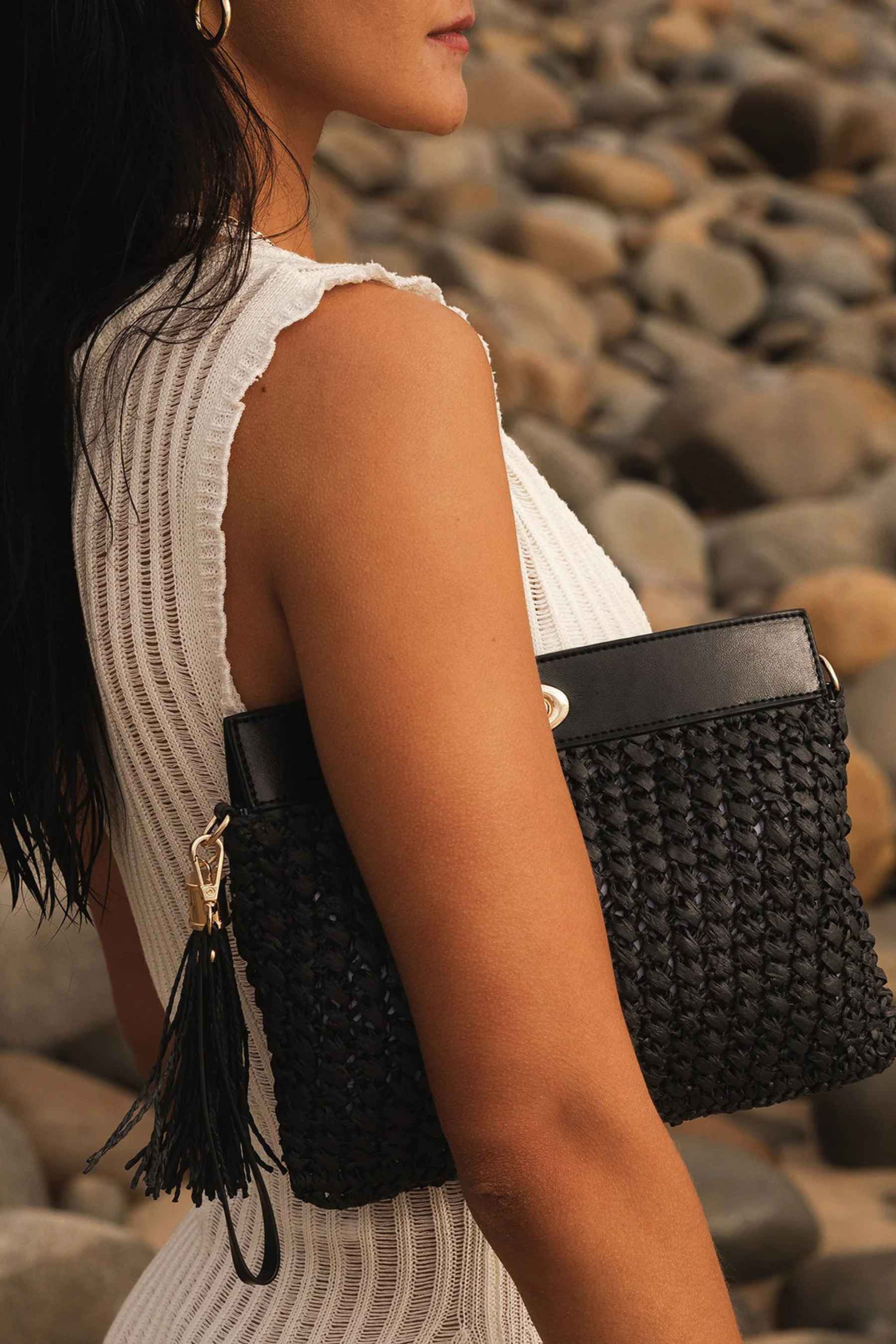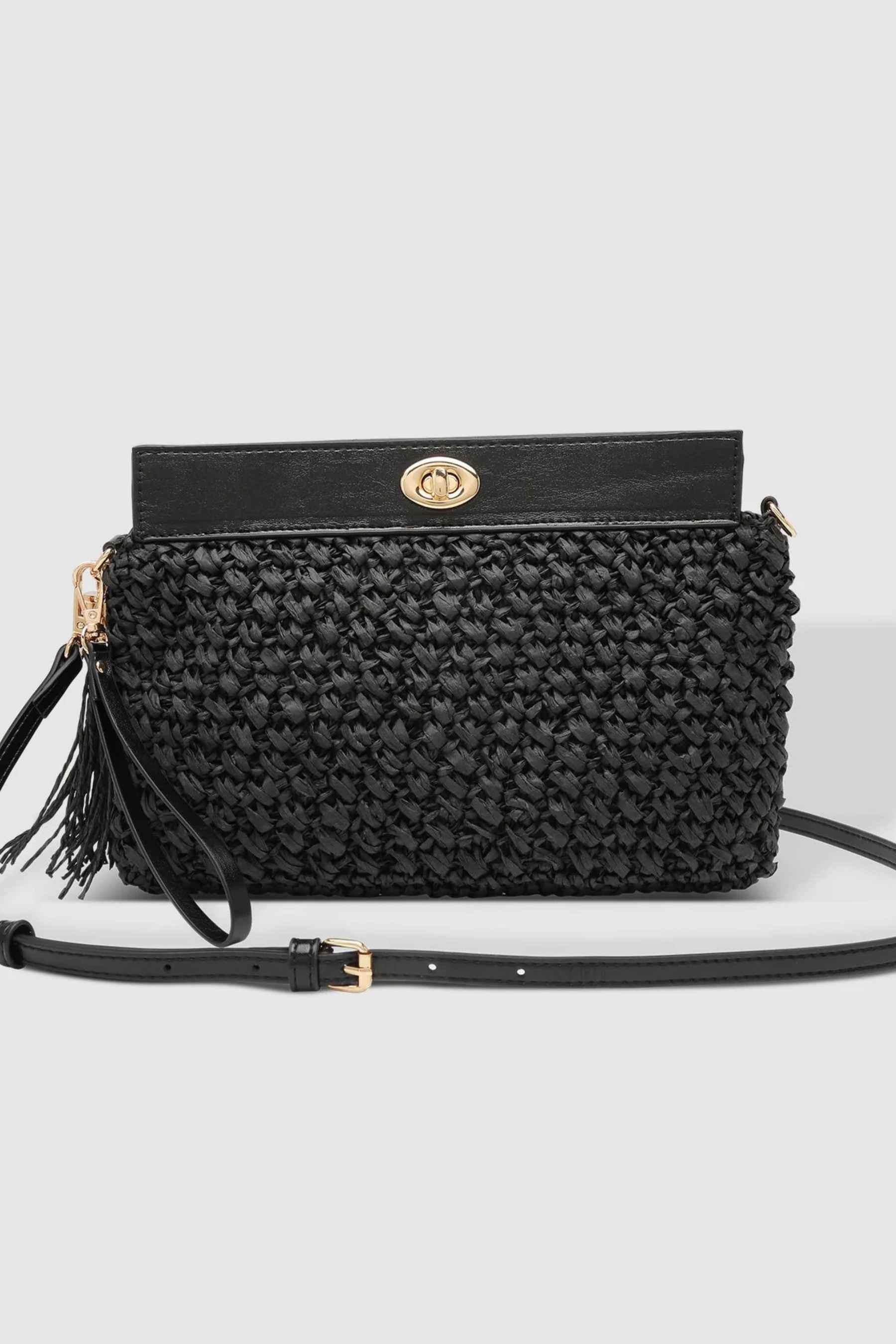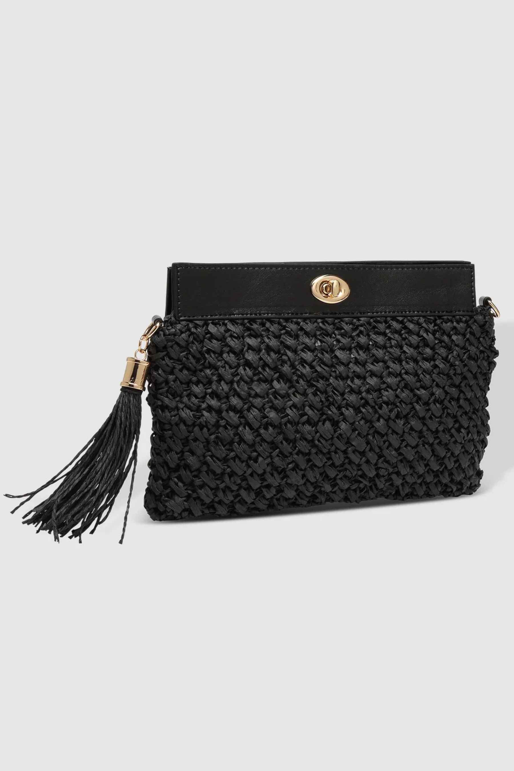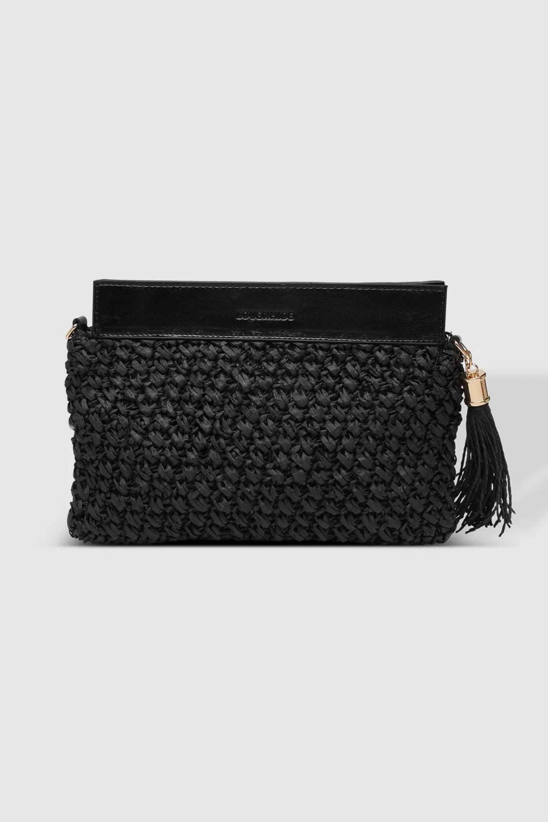 The Louenhide Fern Black Raffia Clutch is the ultimate accessory for your summer getaway. This clutch embodies the essence of sun-soaked adventures and chic style with the combination of textured raffia, metallic vegan leather detailing and delicate accents of light gold hardware. Allowing you to completely customise your look as you transition into the night, the choice is yours with the optional adjustable and detachable vegan leather shoulder strap and wristlet. For easy access on the go, this women's crossbody bag is designed with a slip pocket and a turn lock closure, to effortlessly keep your belongings safe. The Fern Black Clutch exudes an air of laid-back elegance while seamlessly complimenting your summer wardrobe.