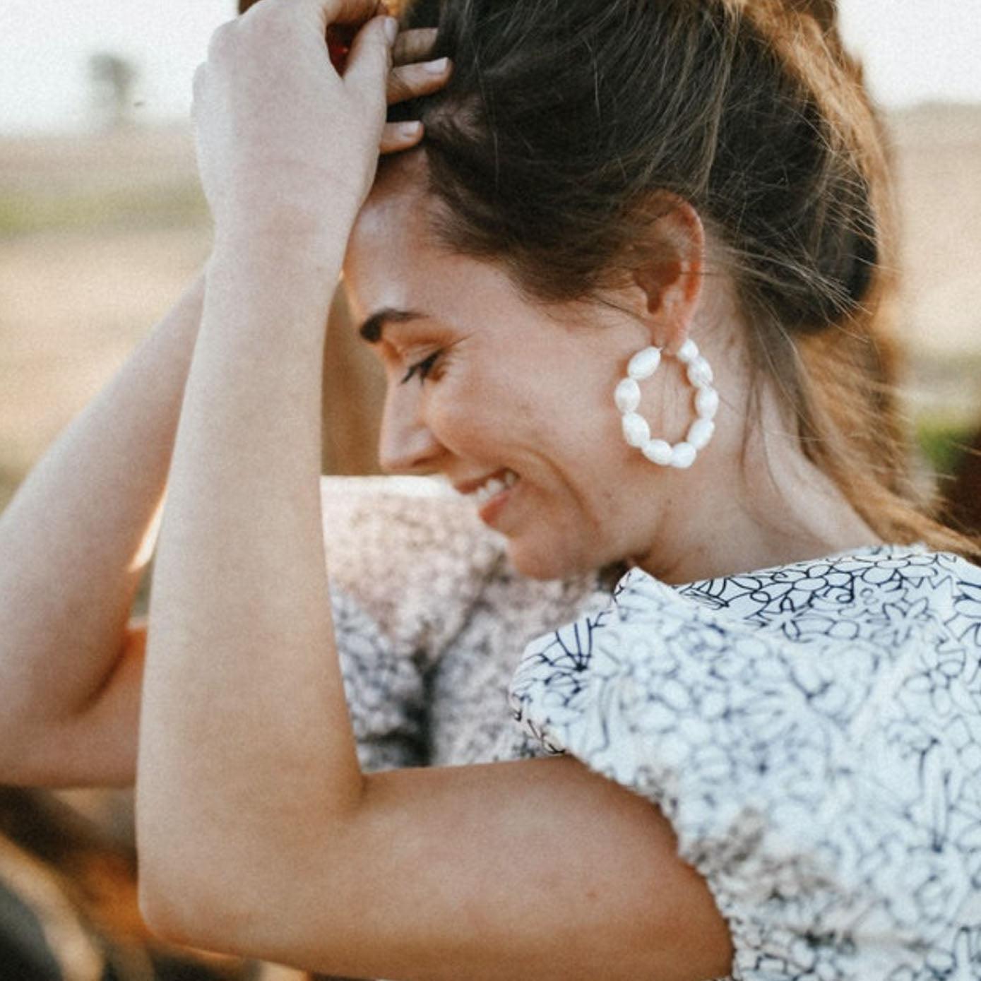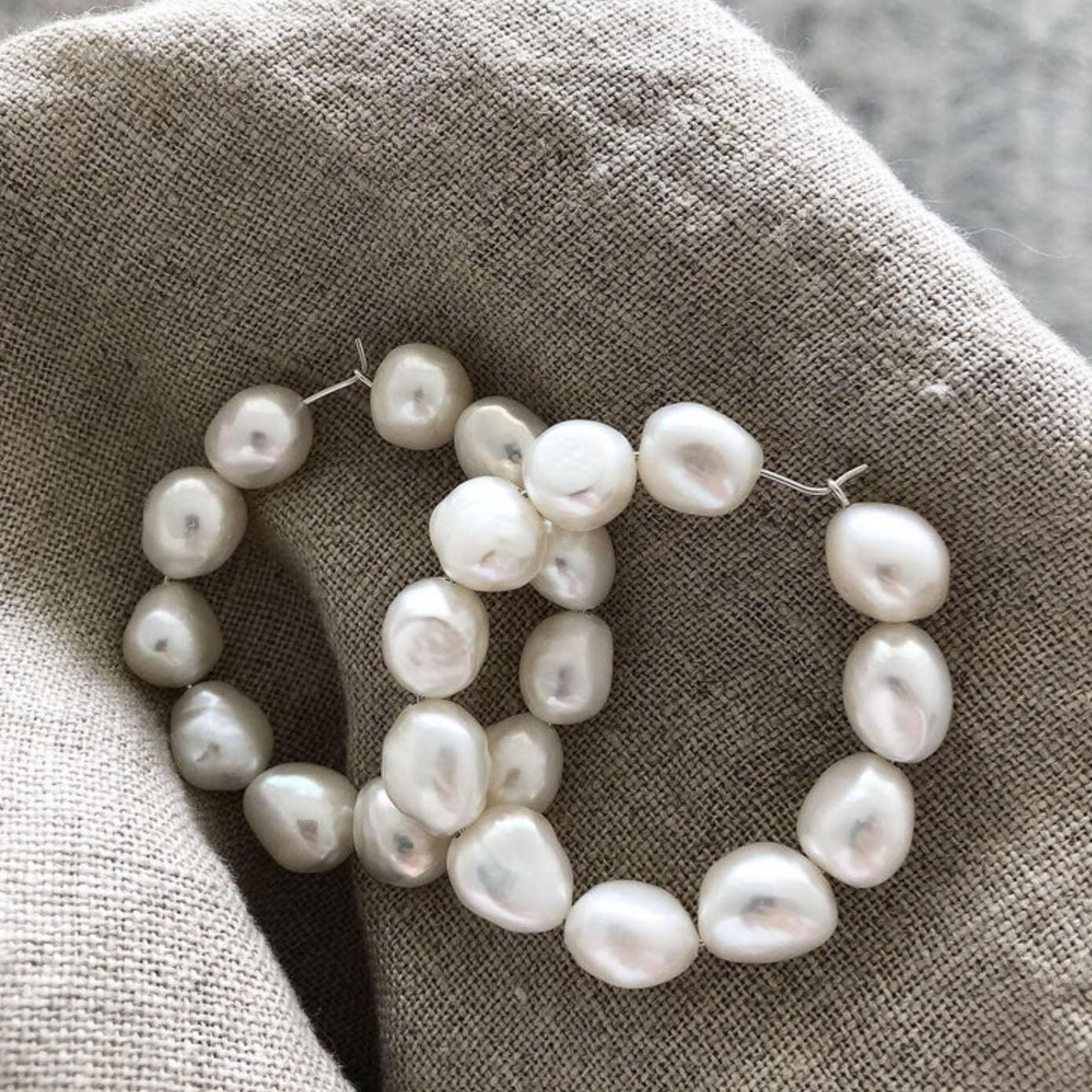 Large hoop earrings with 10-13 white baroque freshwater pearls. Measuring 5cm drop & 17 grams per earring.