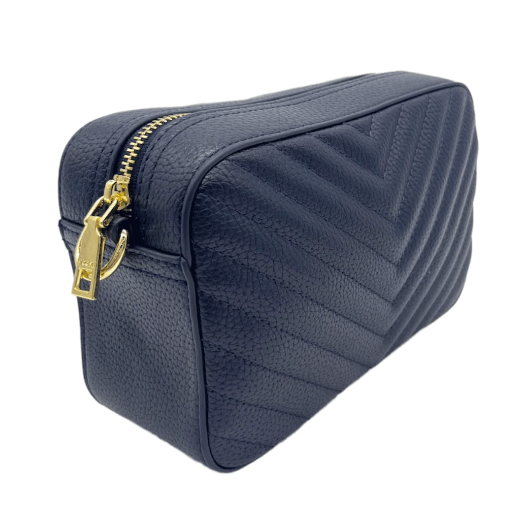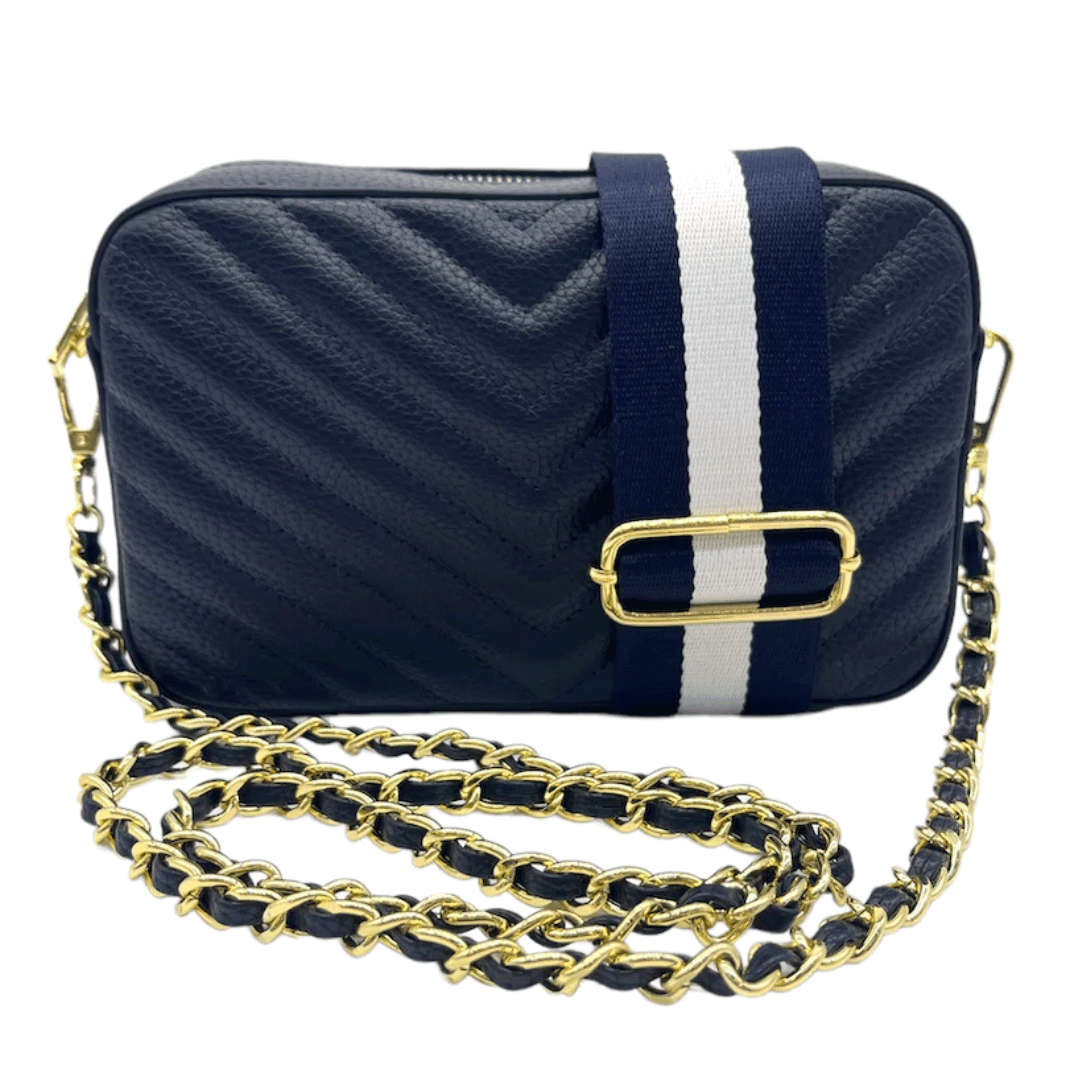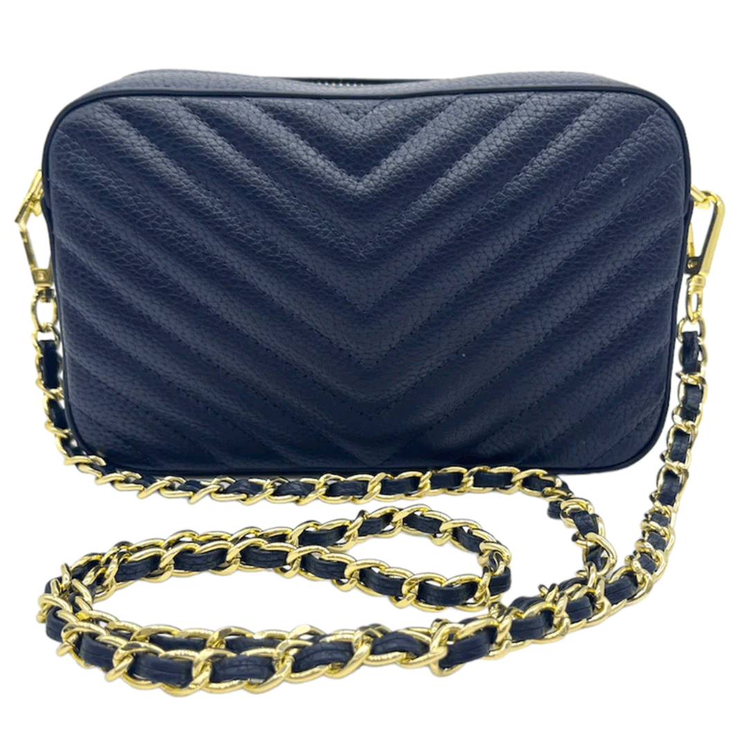 Designed with quilting along the edge and a gold chain strap woven through with the matching vegan leather. The look is elevated and luxurious and suitable for a more dressy occasion.