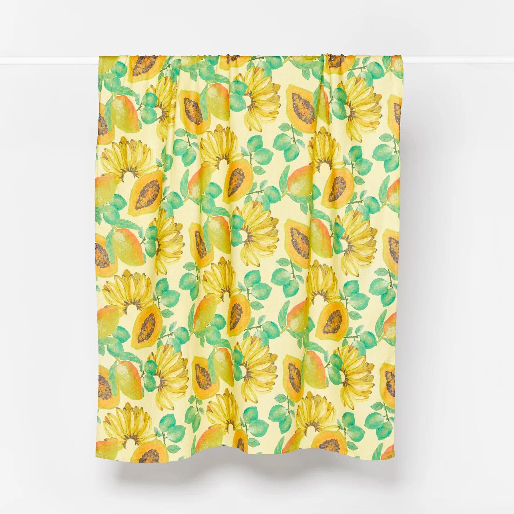 Our Fruit Salad Yellow rectangular tablecloth features original artwork by Bonnie printed on linen and is available in two sizes medium (250cm x 145cm) and large (350cm x 145cm).