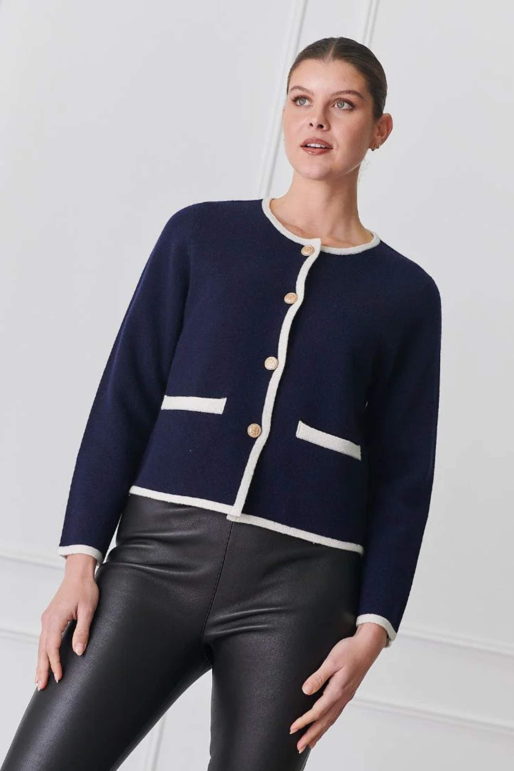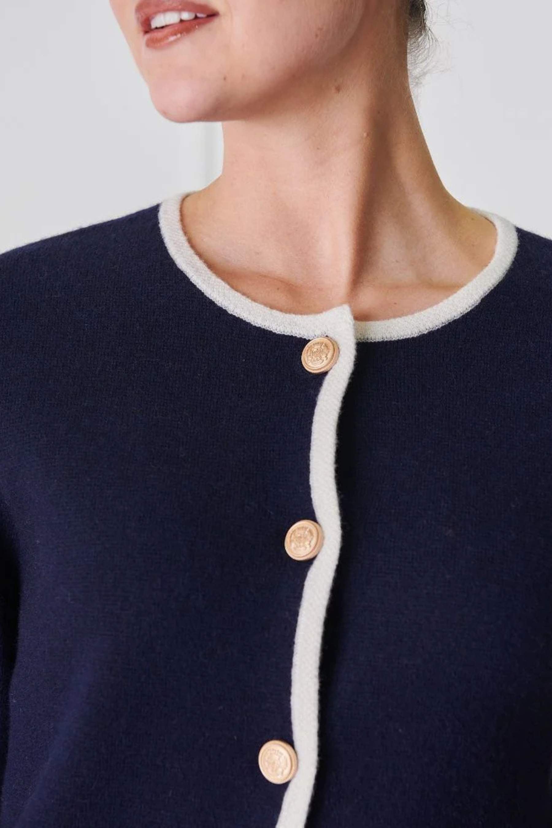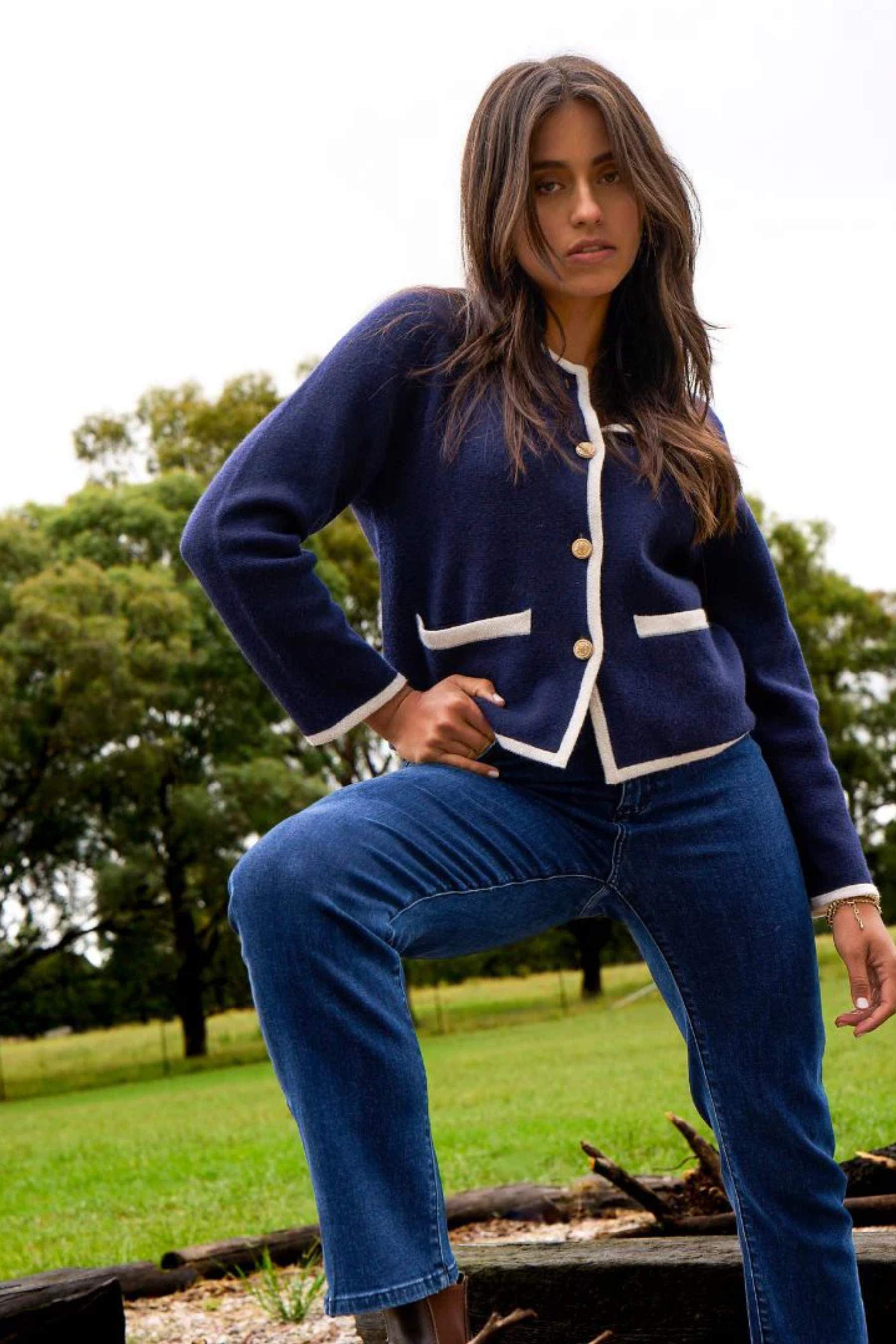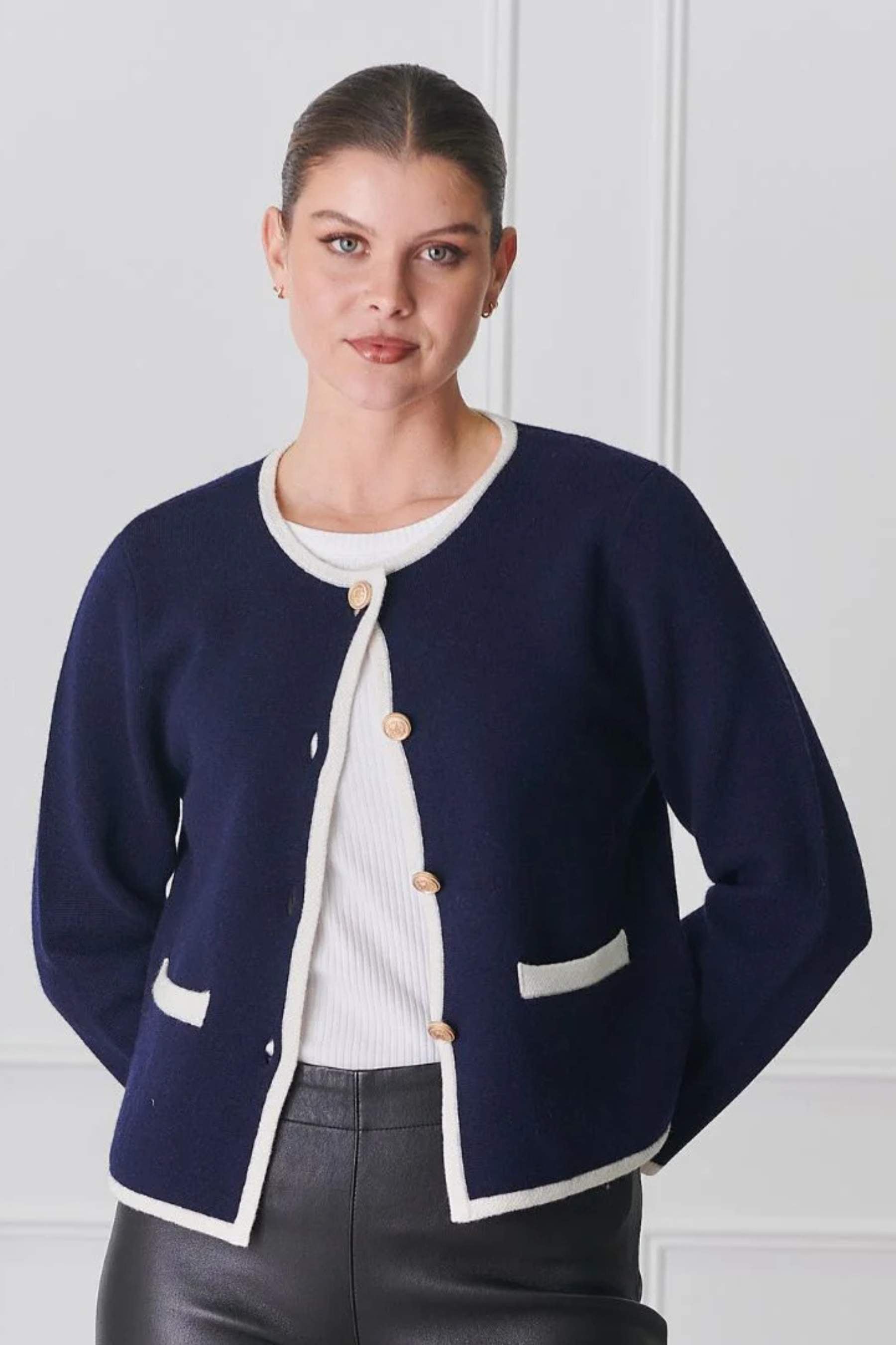 The Gabrielle Knit Jacket Navy is crafted from 100% wool, offering a soft and cosy feel while providing just the right amount of warmth. The deep navy is beautifully contrasted by a fresh ivory trim, giving it a timeless yet modern look that's perfect for any occasion.