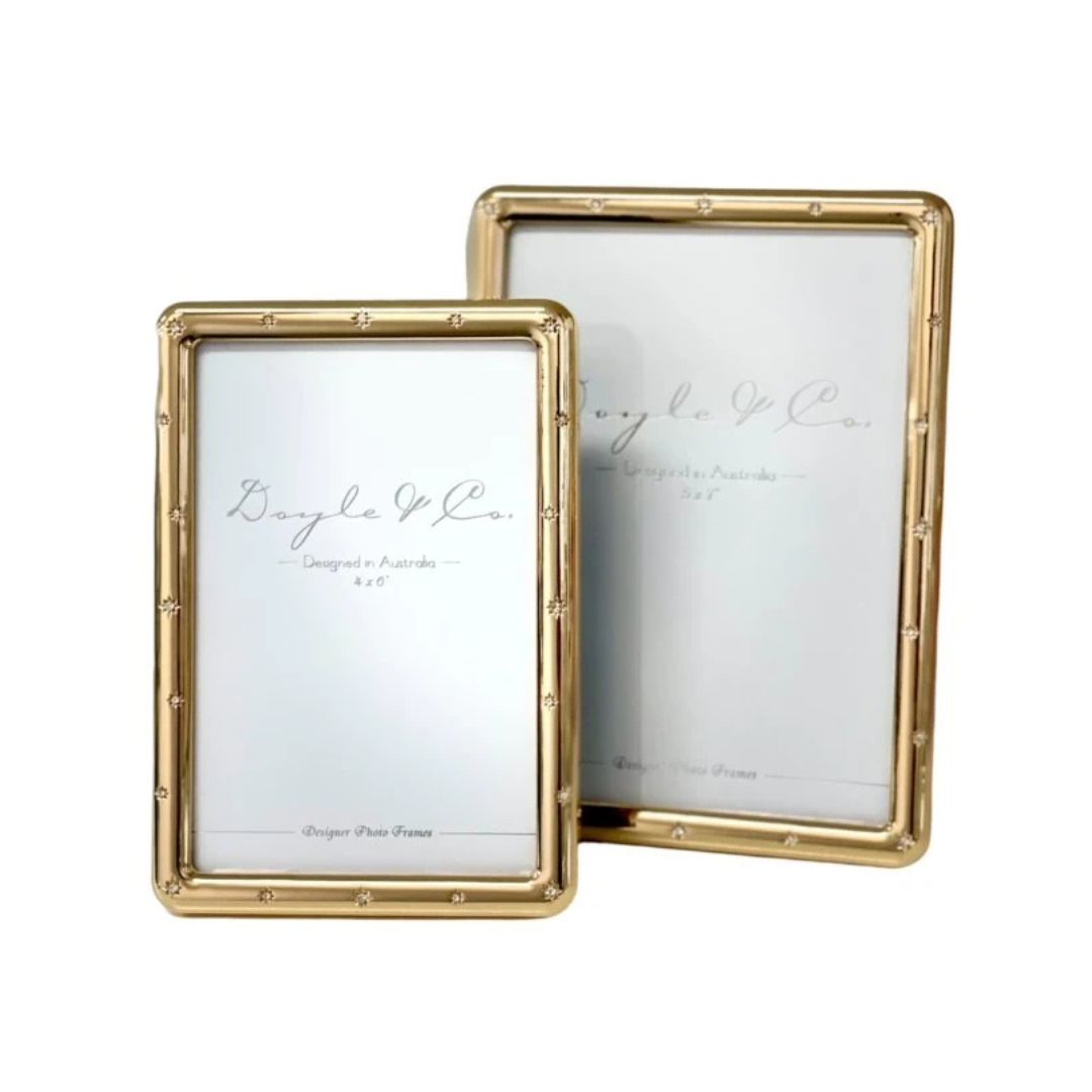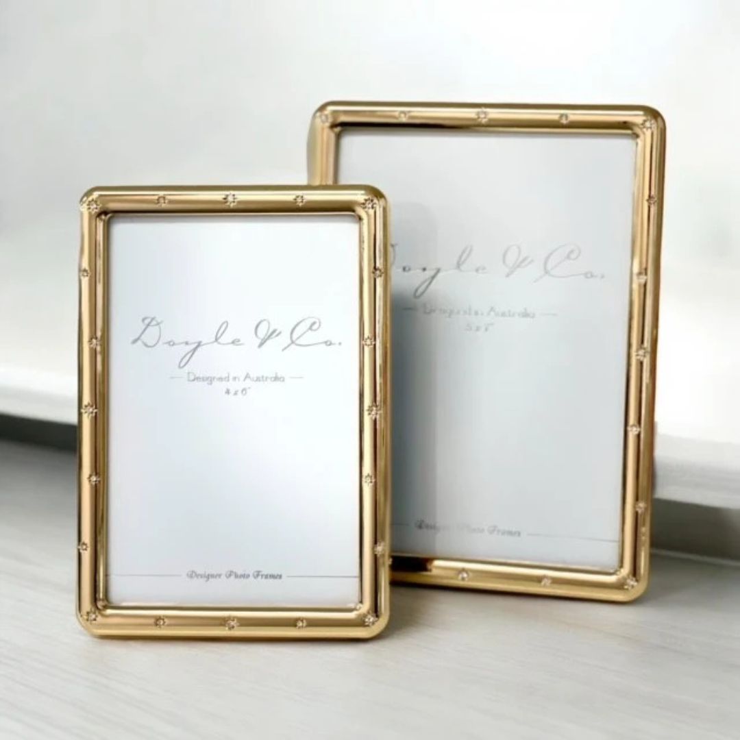 This luxurious gold frame is adorned with scattered diamonds, elevating any 4x6" photo to a work of art. The intricate design and exquisite craftsmanship make it a sophisticated addition to any room. Display your memories in style with this exclusive and elegant frame.
