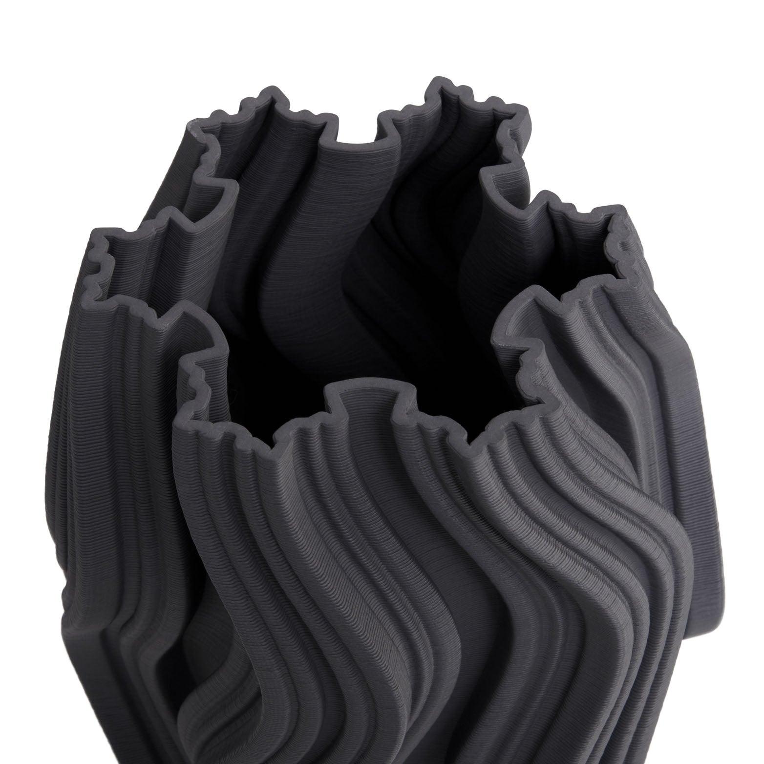 Crafted with meticulous attention to detail, this vase features a sleek and sculptural design. Its form showcases undulating waves and curves that mimic the rhythmic patterns of airwaves in motion. The delicately textured surface of the vase reflects light, creating an illusion of movement and adding an element of visual intrigue.