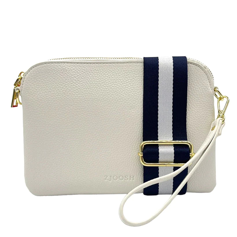 The Hugo Cross Body Bag is back and this time with a cool alternate webbing strap. Sleek but roomy enough for your daily essentials. It can also be used as a cute clutch for your evening events. It includes 2 long and interchangeable straps that as well as a handy wristlet