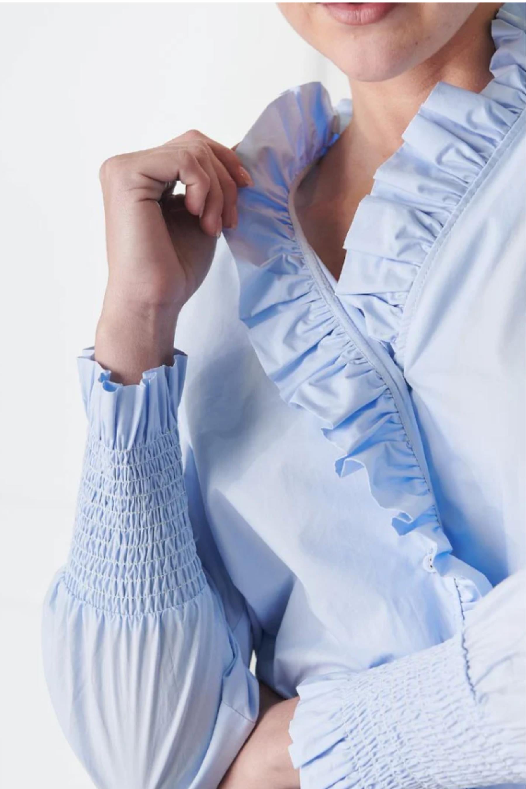 The Jessie V Shirt Blue is a versatile wardrobe essential in a soothing blue sky colour. Designed for comfort, this relaxed-fit shirt features delicate frills along the front placket, adding a subtle feminine touch. The V-neck and elastic cuffs create a flattering silhouette, making it the perfect choice for both casual and more dressed-up occasions.