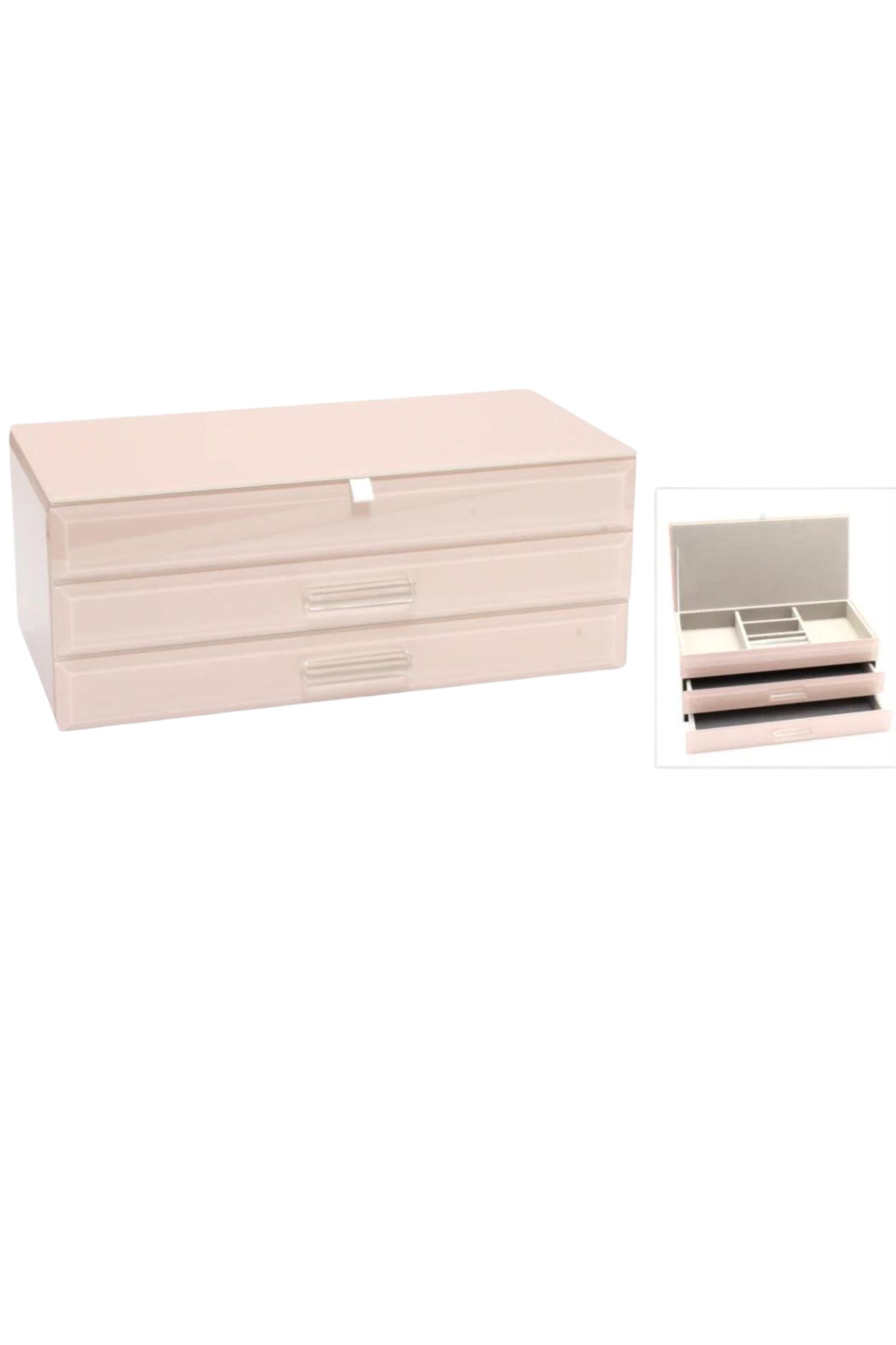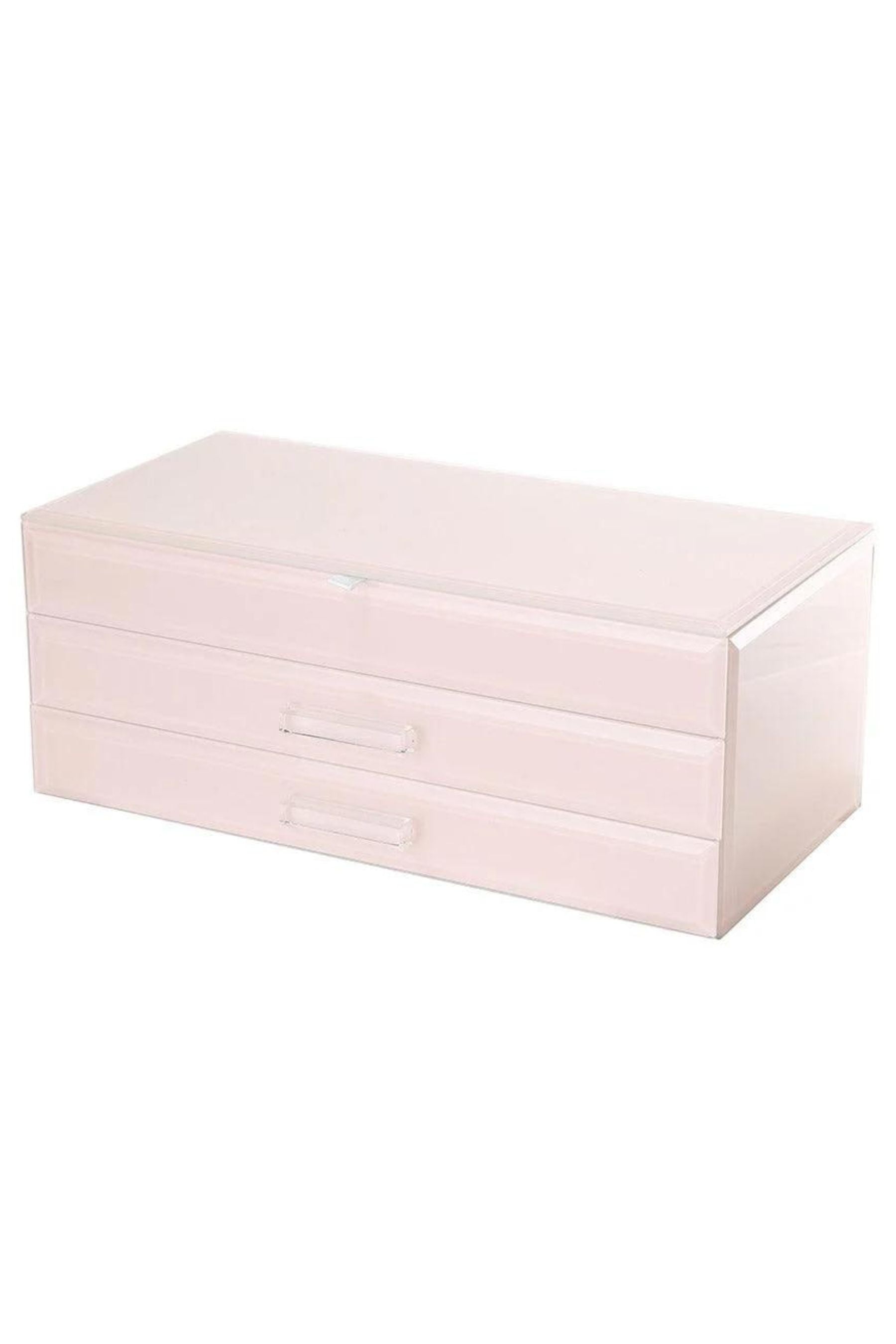 Functionality meets fabulous style with this glass jewellery box. It features three tiers: one compartmentalised top section plus two removable drawers, so there's plenty of room for rings, earrings, bracelets and necklaces. Every item will be safely stored, neatly arranged and set against tactile velvet to protect it from scratches. The glass box will glisten in the light to bring an air of vintage glamour to your vanity table. What more could a girl want?