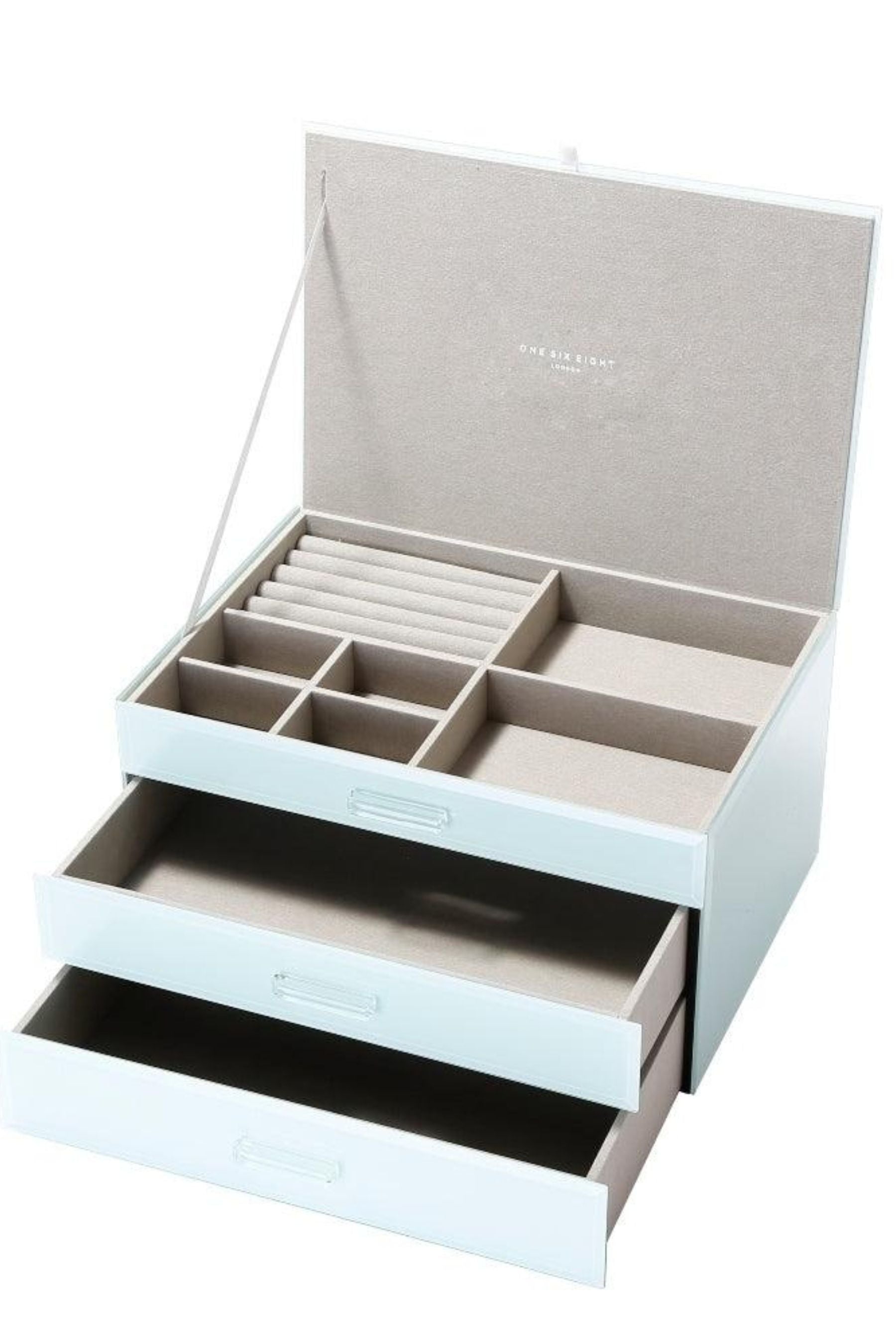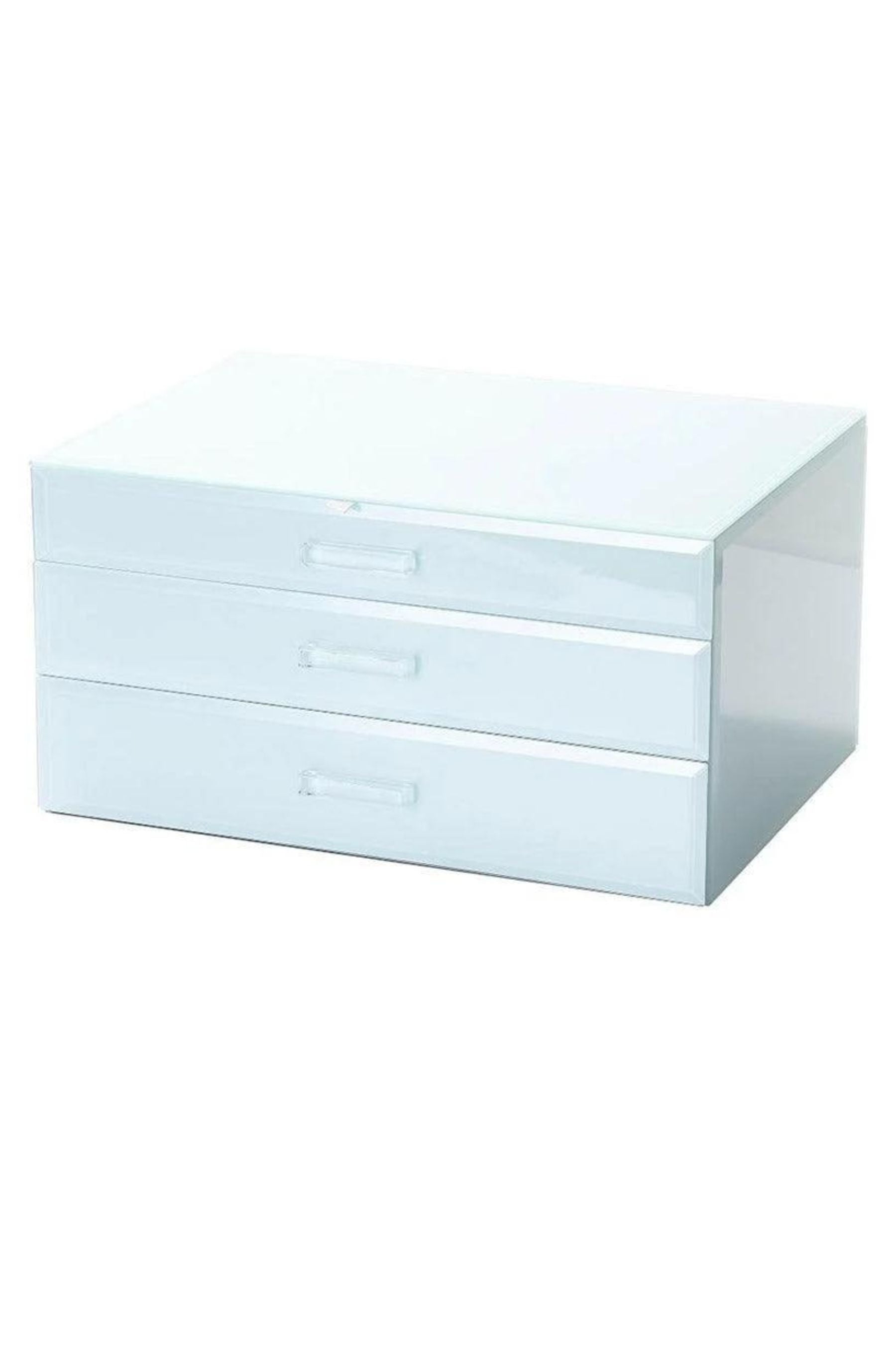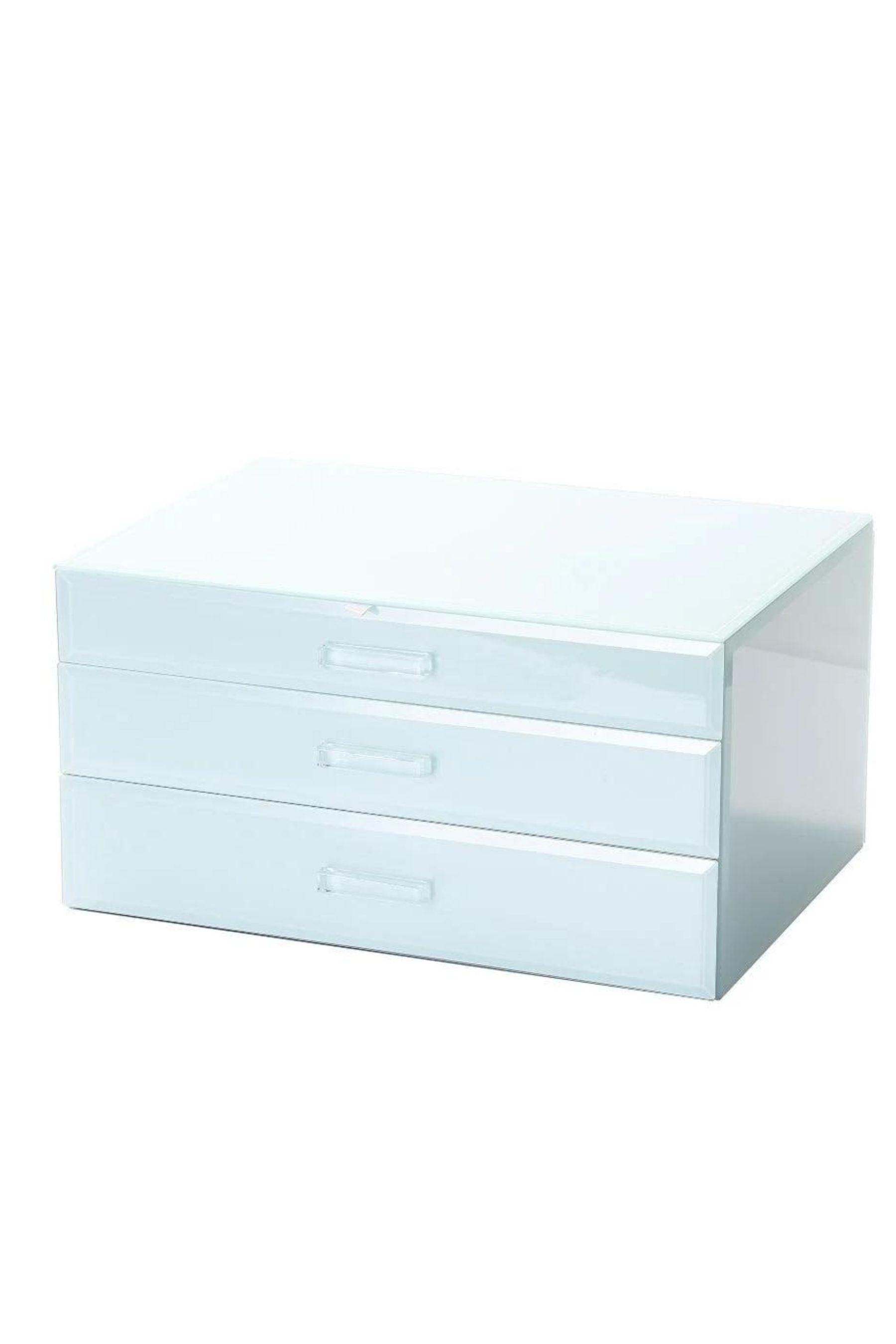Functionality meets fabulous style with this glass jewellery box. It features three tiers: one compartmentalised top section plus two removable drawers, so there's plenty of room for rings, earrings, bracelets and necklaces. Every item will be safely stored, neatly arranged and set against tactile velvet to protect it from scratches. The glass box will glisten in the light to bring an air of vintage glamour to your vanity table. What more could a girl want?