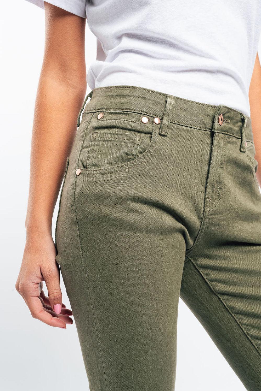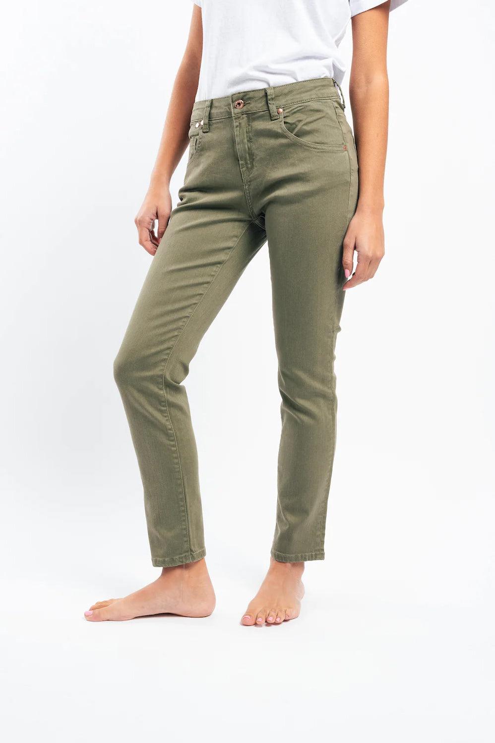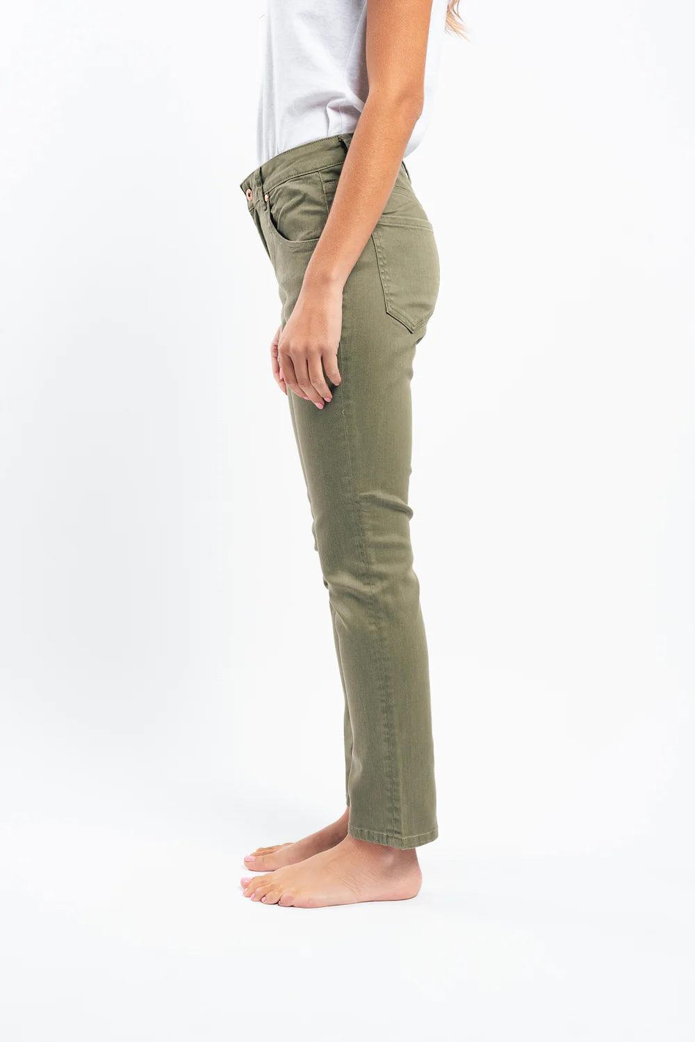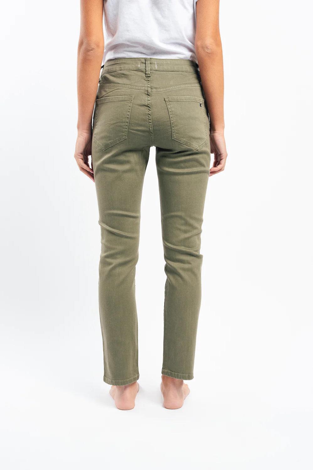 The Kirby Boyfriend Jean features a khaki denim for a cool, contemporary look. The Kirby is cut with a flattering mid rise waist and slightly tapering leg for a slimming effect. This flattering jean is constructed with a comfortable bit of stretch for everyday wear.