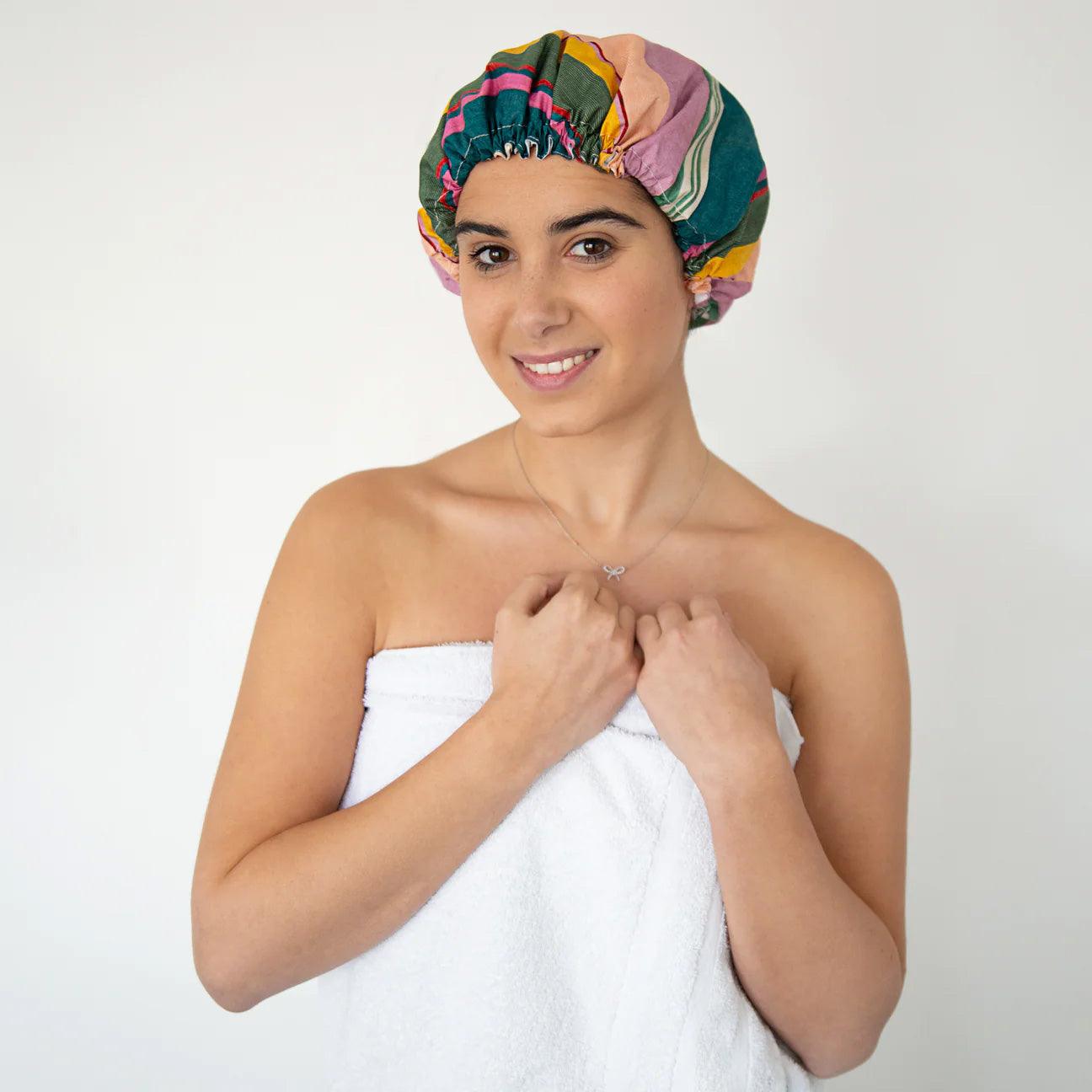 Keep your hair dry between washes in style with this Liberty Shower Cap in Gelato Stripe! Made with Liberty London’s Tana Lawn™ - a fine, cool, and durable cotton with a silk-like feel - outer and a water resistant lining, the soft elastic sits securely yet comfortable around the hairline without leaving red marks or indents.