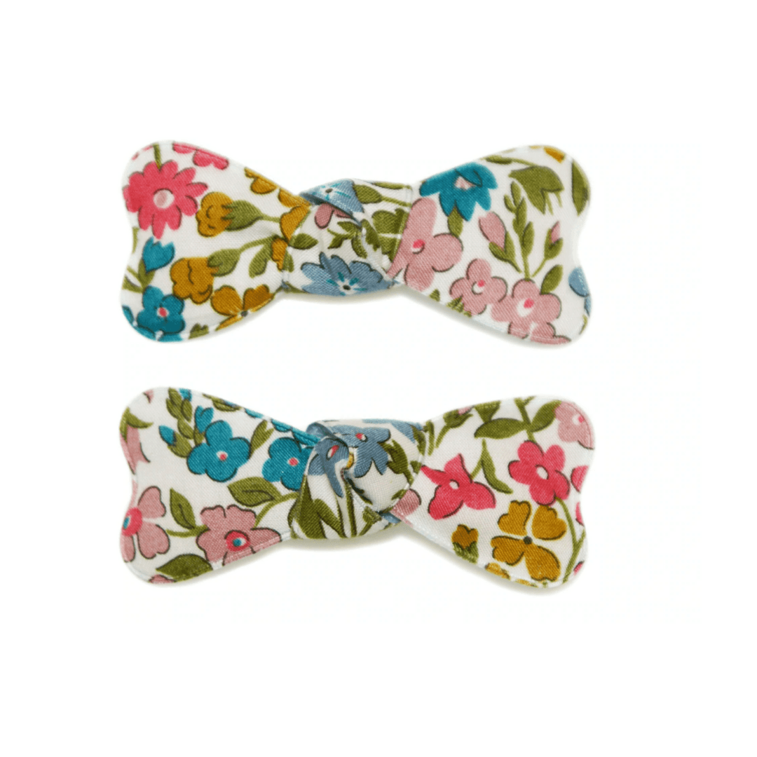 Pair of non-slip bow snaps covered in Liberty Sweet May fabric.