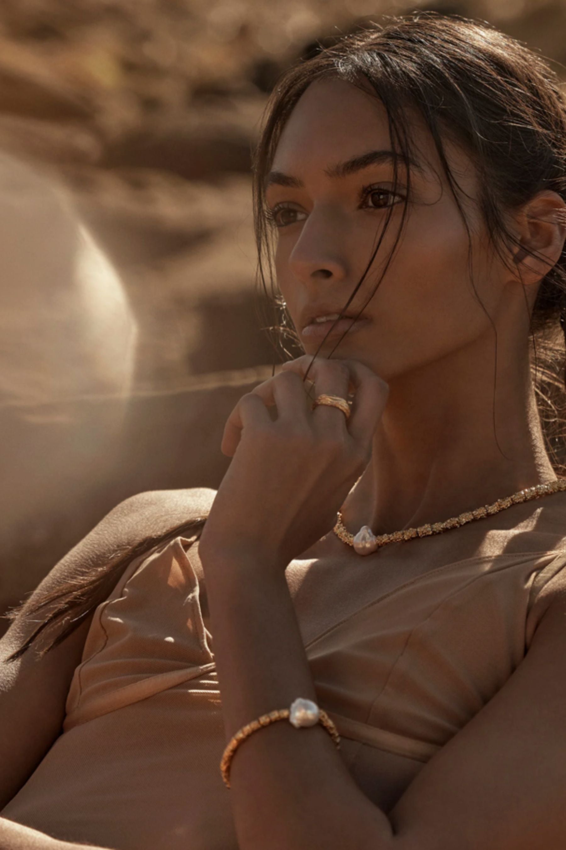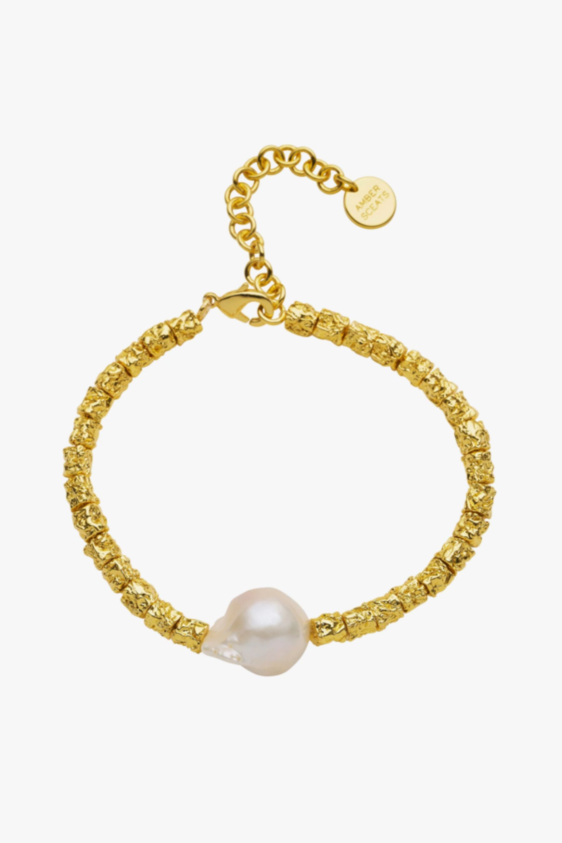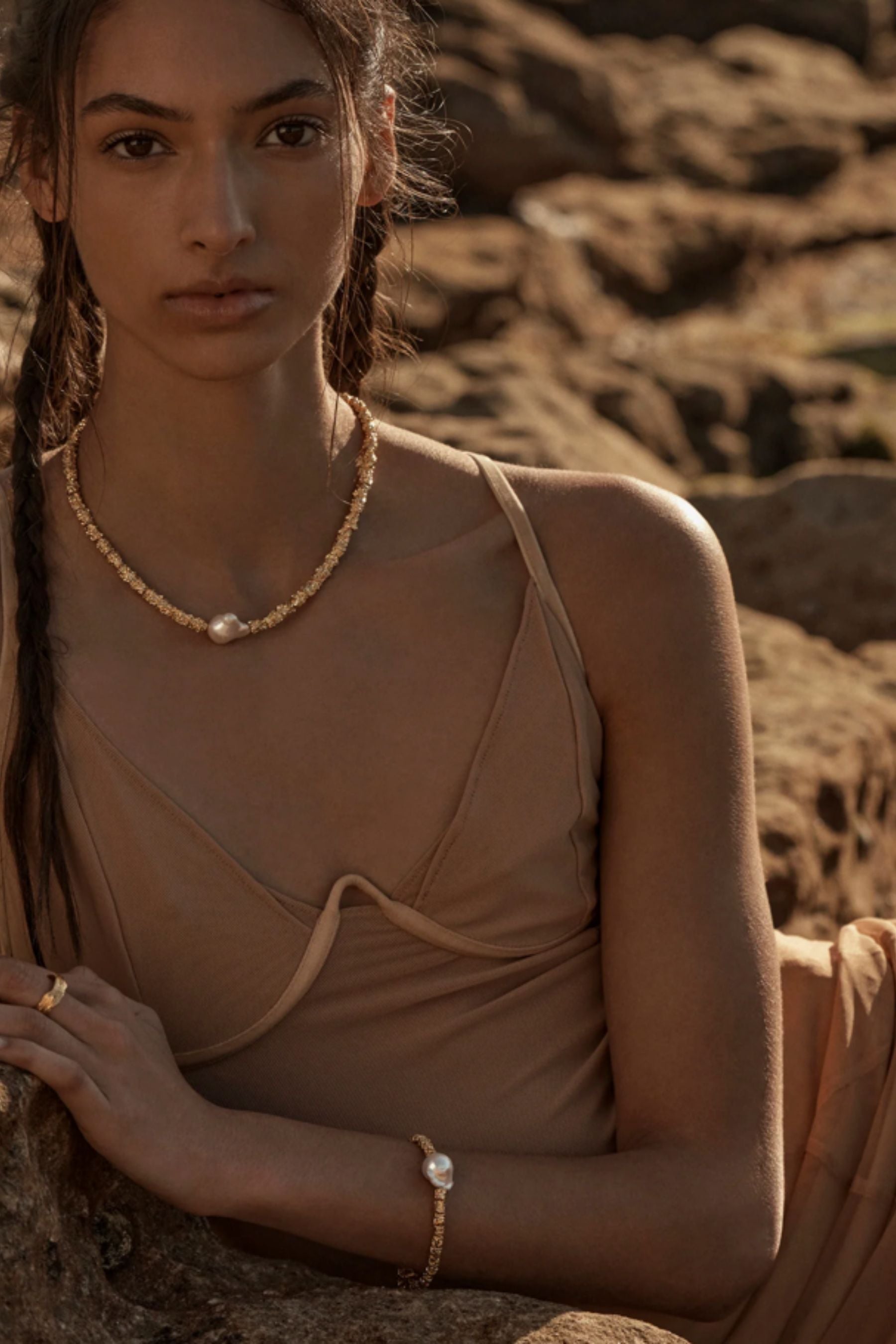 Exude elegance in the Liora Bracelet. Featuring a lustrous AAA+ freshwater Pearl surrounded by our signature 24K gold plated textured pendants. Wear yours with the matching Liora Necklace. Handcrafted in Italy.