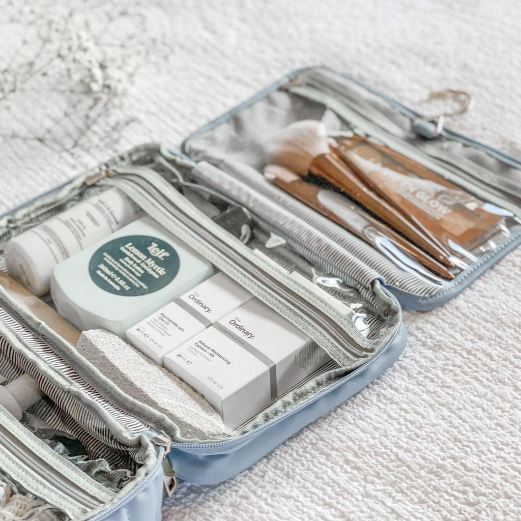 The Louenhide Maggie cosmetic case is a beautiful quilted large makeup bag. Designed to be functional and spacious with three zipped compartments to store you makeup, skincare, and toiletries all in one. Comes with a hanging hook for easy access on the go! Take with you on weekend adventures or around the world!