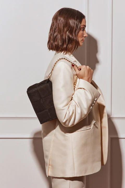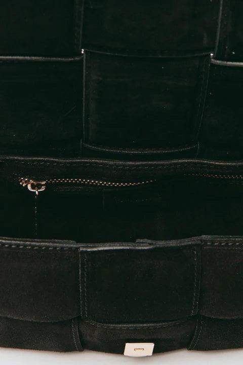 Woven padded Italian suede panels are the feature of this stunning statement bag. Margot, lovingly handmade in Italy, is as versatile as she is elegant. Featuring two straps choose between a short shoulder chain strap or a long adjustable crossbody leather strap depending on the occasion. Remove both straps to wear Margot as a clutch.