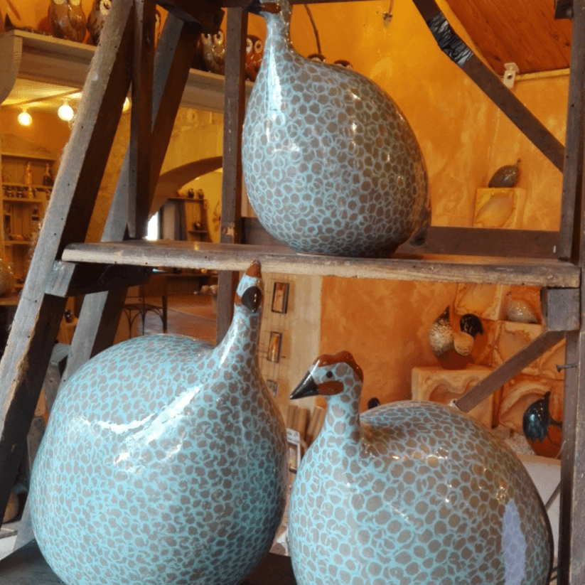 It’s difficult not to fall under the charm of Provence handicrafts. The Guinea Fowl or Pintades as they are known in France, are undeniably part of this category. These life- sized ceramic poultry with their generous stylized lines are made of clay and hand glazed. Each features a graphic, spotted white-blue plumage that contrasts with their little faces. A family tradition initiated by Heidi Caillard 40 years ago has endured and has made the adorable guinea fowl a classic of its kind. Made in France.