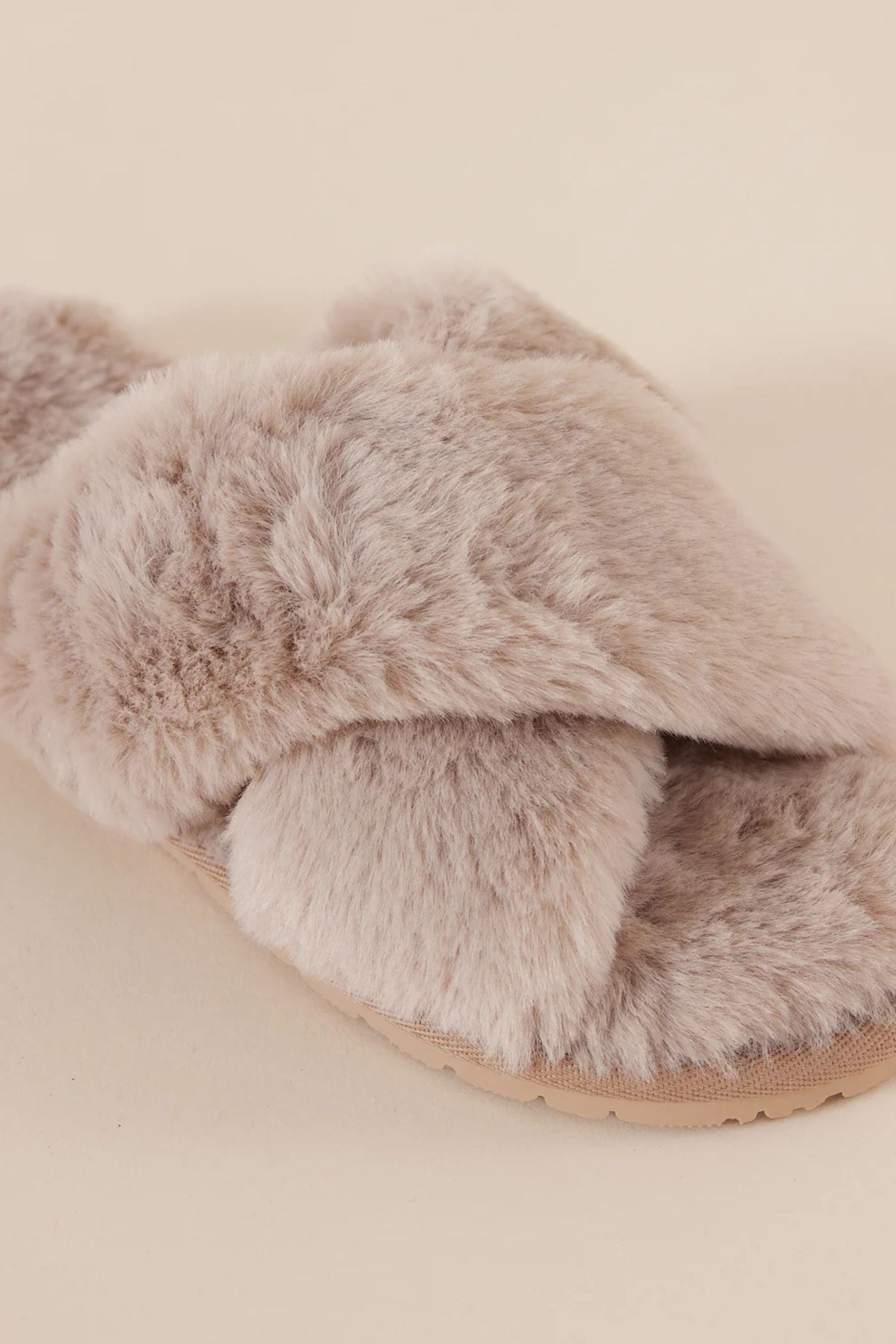 Indulge in the ultimate comfort with the Milan-inspired open-toe slippers, now available in a sophisticated taupe. Designed with both elegance and practicality in mind, these slippers feature soft, cushioned soles for a cloud-like walking experience. The crossover faux fur straps offer a luxurious touch, while the open-toe design ensures your feet stay cool and comfortable. Perfect for lounging around the house or relaxing after a long day, these slippers are the perfect addition to your loungewear collection.