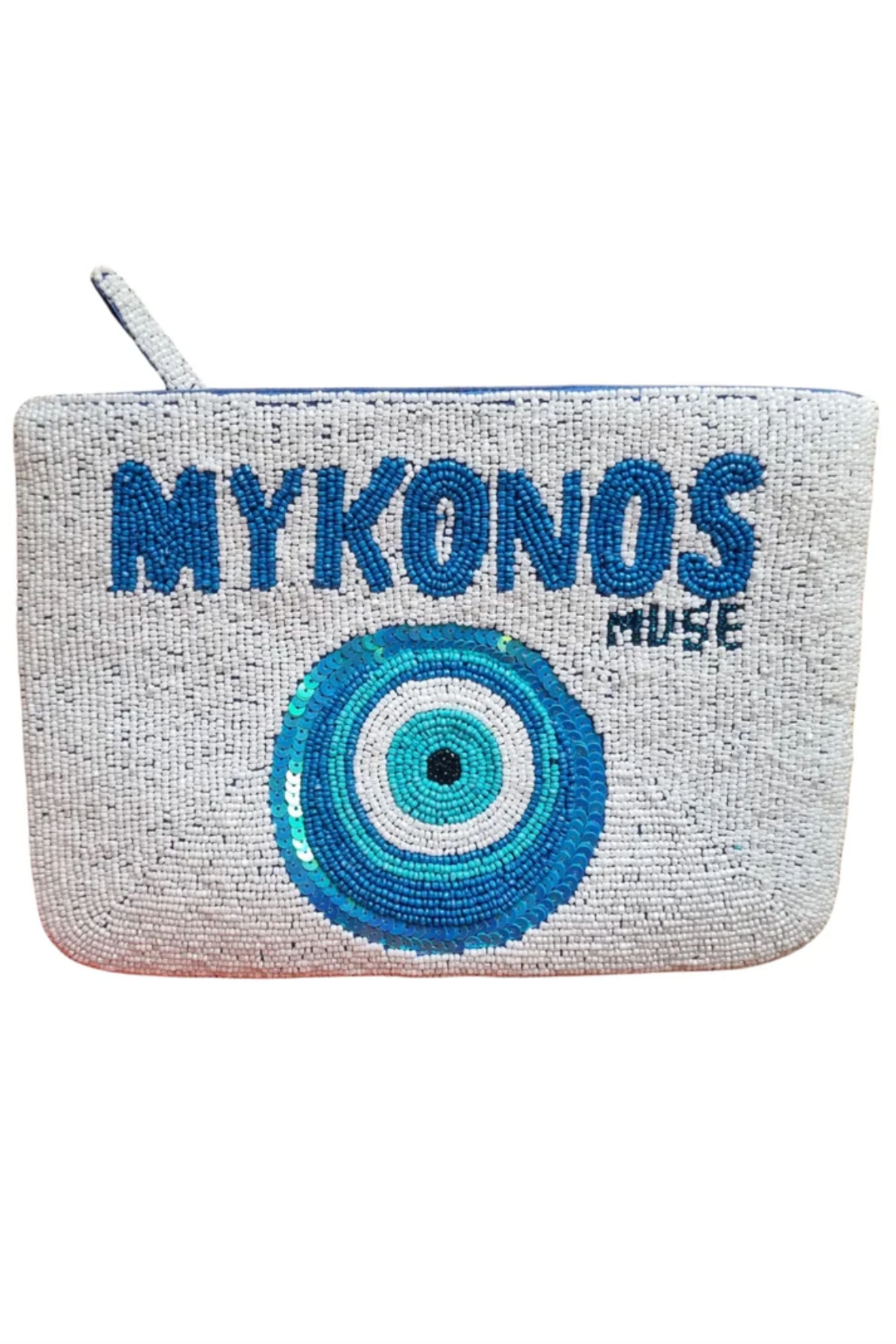 Step into the good vibes of Mykonos with this dazzling beaded clutch, sized at 25cm x 18cm. The "Mykonos Muse" text in blue is complemented by a good luck eye design, set against a white background. Perfect for adding a splash of fun to your summer wardrobe, it’s a versatile accessory for both day and night.