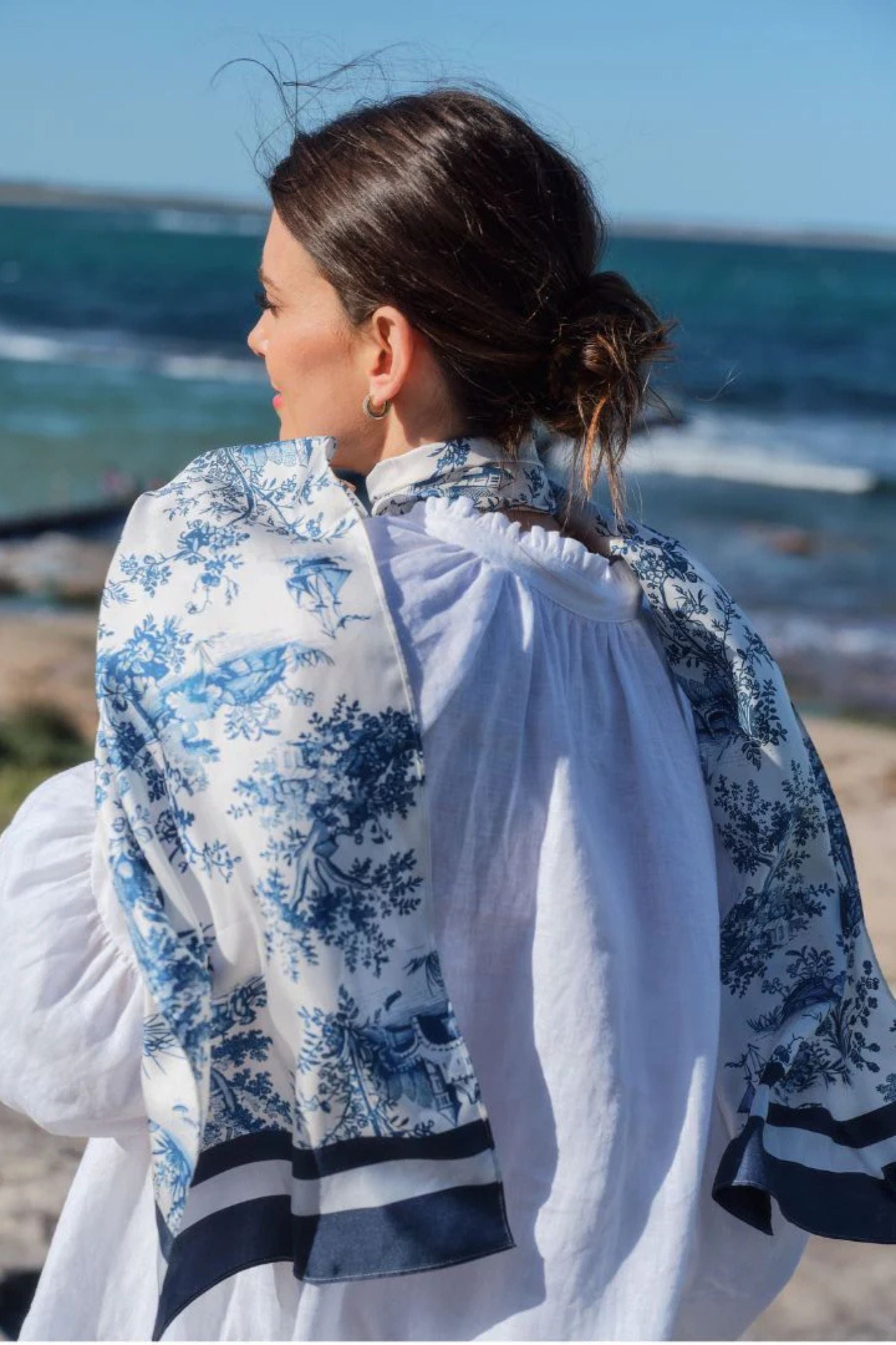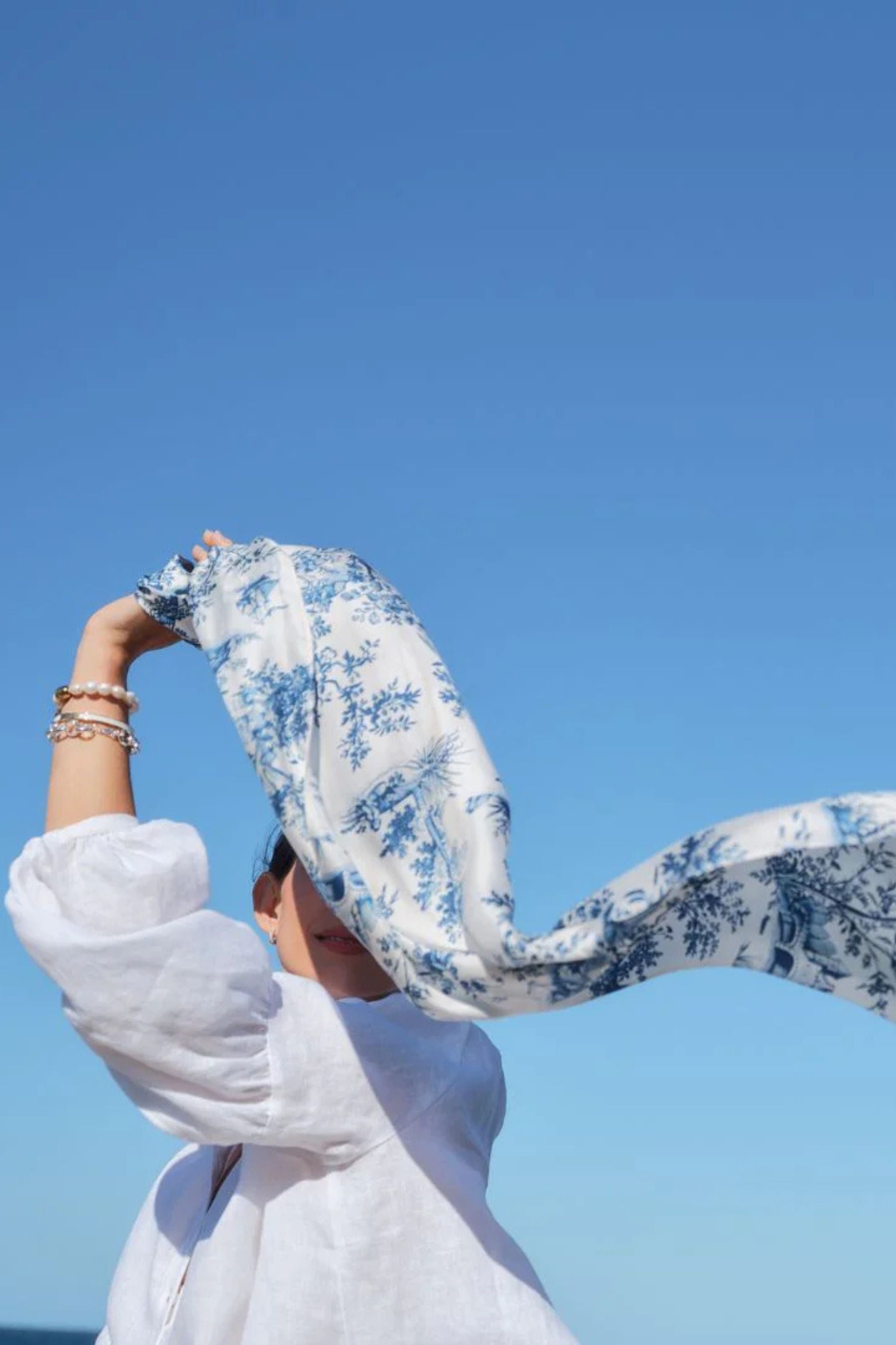 Perfect for those who love to express their unique style, this blue and white silk scarf is both timeless and endlessly adaptable, making it an essential addition to your collection!