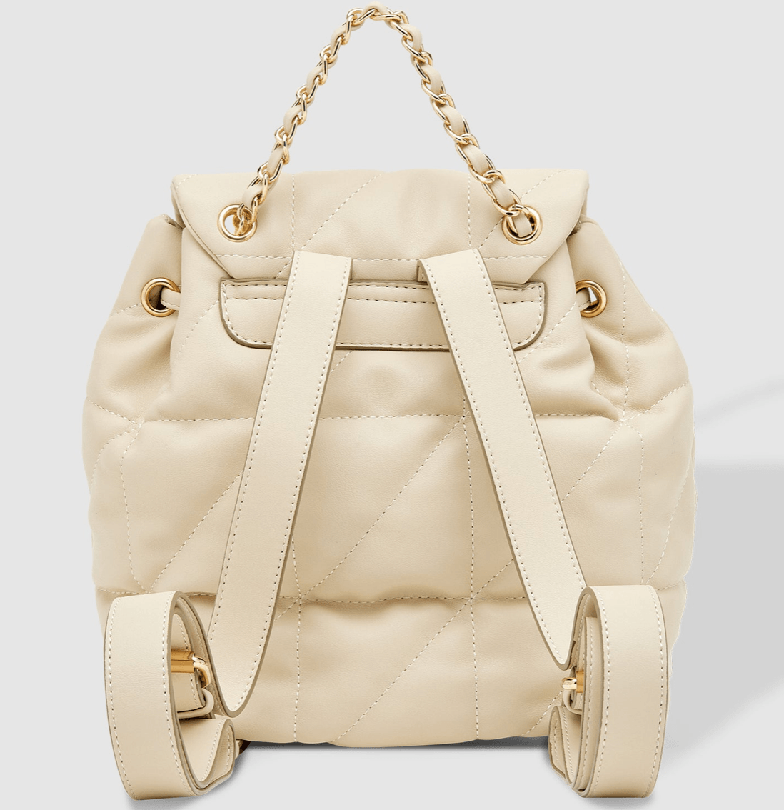 The Louenhide Nixon Stone Mini Puffer Backpack is a luxurious and feminine mini backpack. This women's travel backpack is designed with a box quilt stitch pattern, in buttery soft polyurethane vegan leather. This mini backpack is great for the light traveller and can be used for university, work or travel. This ladies backpack has an open interior, with one slip pocket and one zip pocket that make it easy to organise and access your belongings. You can keep your phone, keys, and other essentials separate and easily accessible, without having to dig through the bag. It has a secure drawstring fastening and invisible magnetic closure that ensures your belongings stay safe and adjustable backpack straps, making it comfortable to wear.