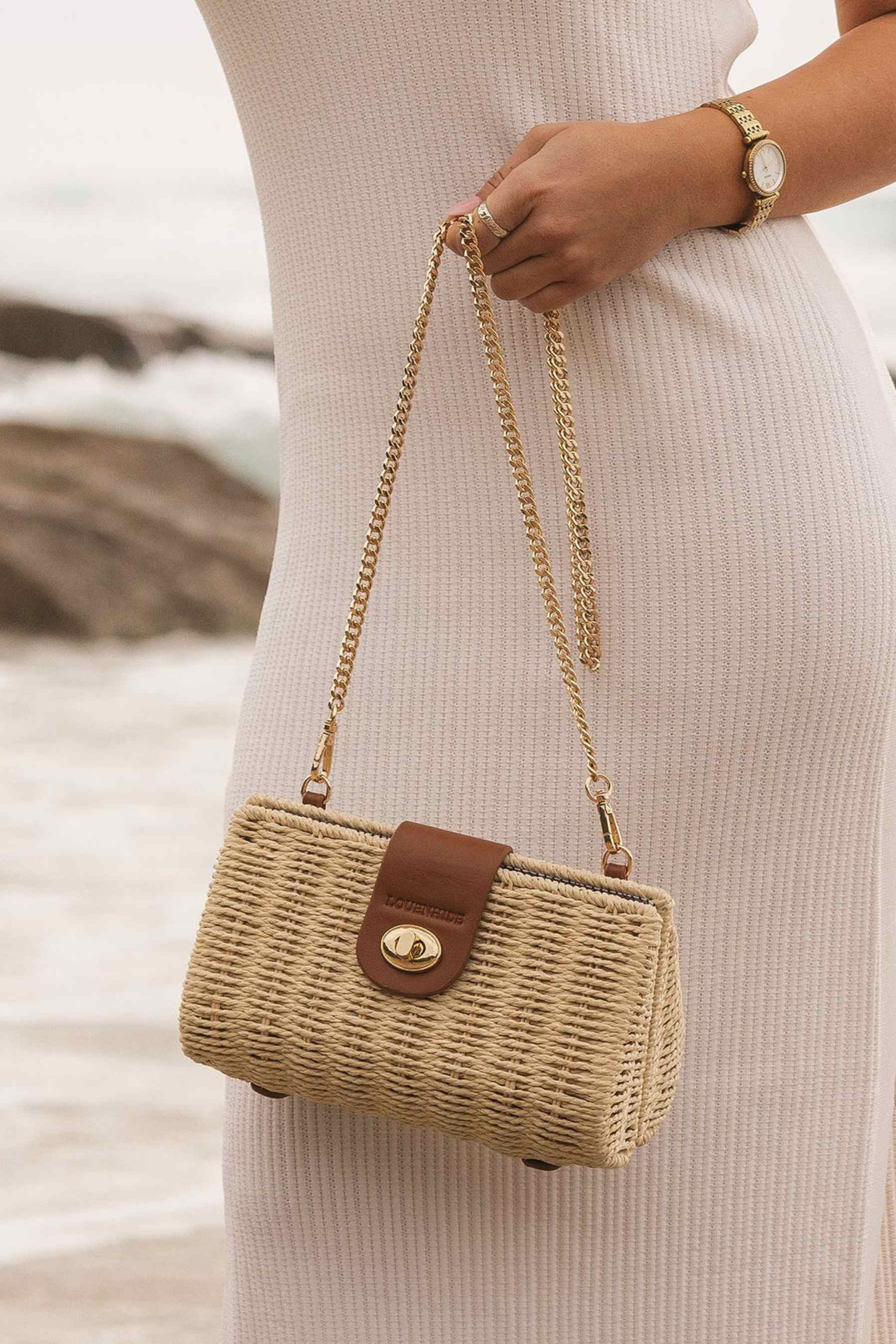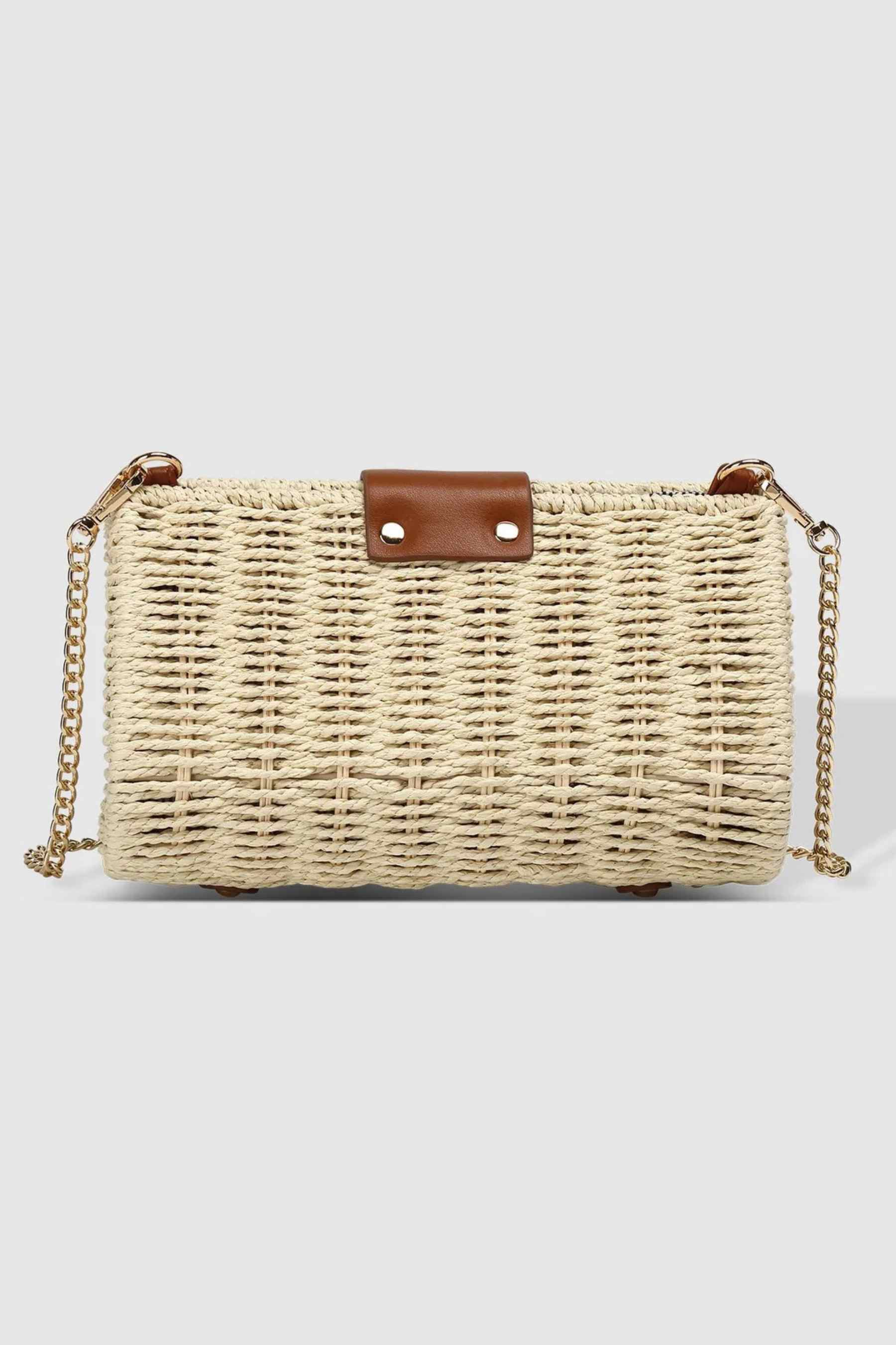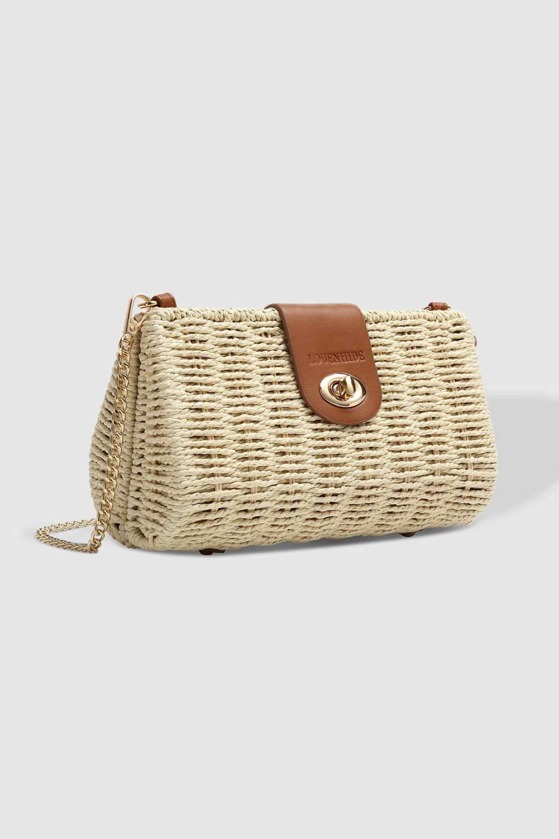 The Louenhide Ophelia Tan Raffia Crossbody Bag is an effortlessly luxe, structured crossbody, perfect for summer evenings. Adding a touch of luxury, the metallic vegan leather creates a harmonious fusion of textures that is sure to turn heads. Opening effortlessly to reveal a spacious interior, this luxe women's crossbody bag, allows you to organise your summer necessities while keeping them secure with the turn lock closure. The Ophelia Tan offers three ways to wear to completely customise your look. Keep it casual with the metallic vegan leather extension strap or simply detach to wear as an evening clutch. Take your outfit to the next level with the additional light gold chain crossbody strap for an added touch of feminism to your date night style. Elevate your holiday experience and treat yourself to the perfect companion for your sun-soaked journeys.