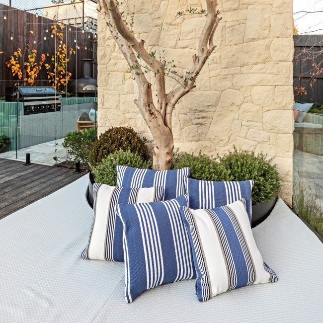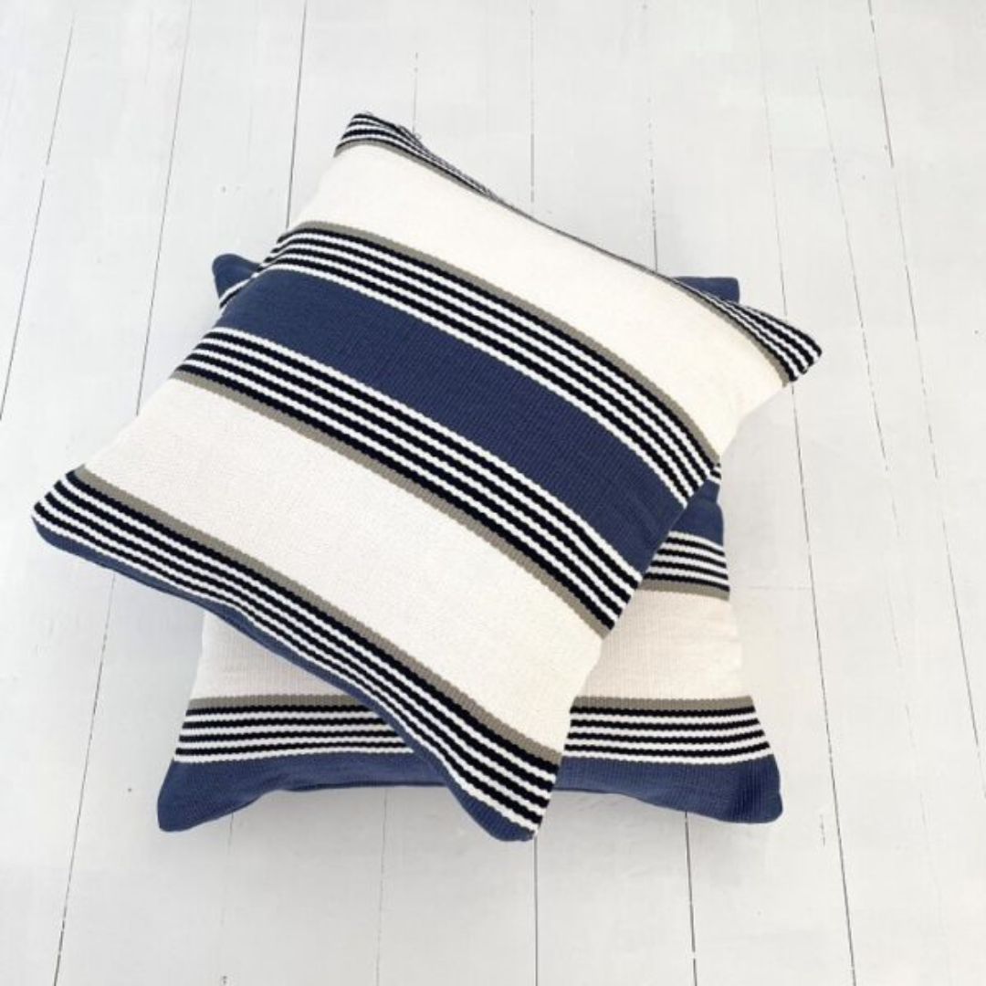 All-weather OUTDOOR CUSHIONS in classic naturals and bold designer stripes for luxurious outdoor spaces. Poolside or alfresco areas are effortlessly transformed with resort-style sophistication, comfort and quality. New Stripe Covers in denim/white in polypropylene are soft to touch, UV resistant and weatherproof.
