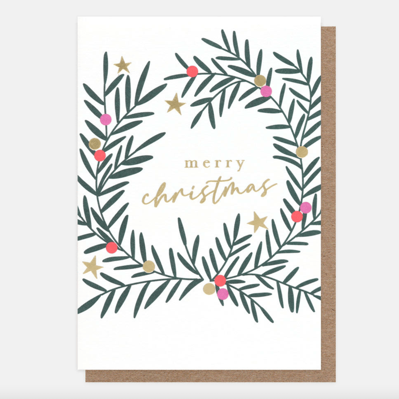 Stock up on some small but cute Christmas cards with this pack of 10 mistletoe wreath cards, featuring gold foil lettering and a message inside saying 'merry christmas and a happy new year'.