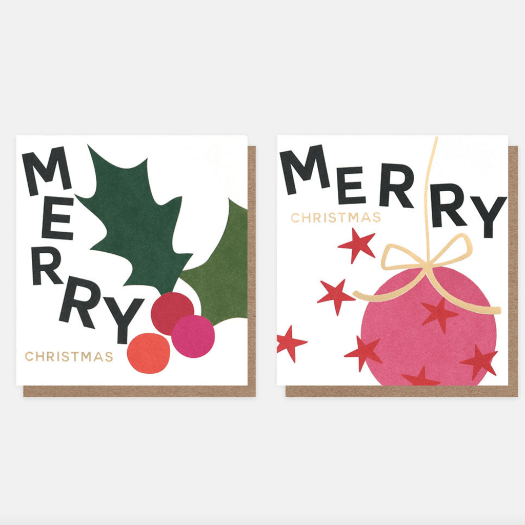 These charity Christmas card packs contained 8 cards each with the message 'merry christmas and a happy new year' inside. Choose from cute holly leaves and berries or bauble with stars designs, with 4 of each contained in the box.