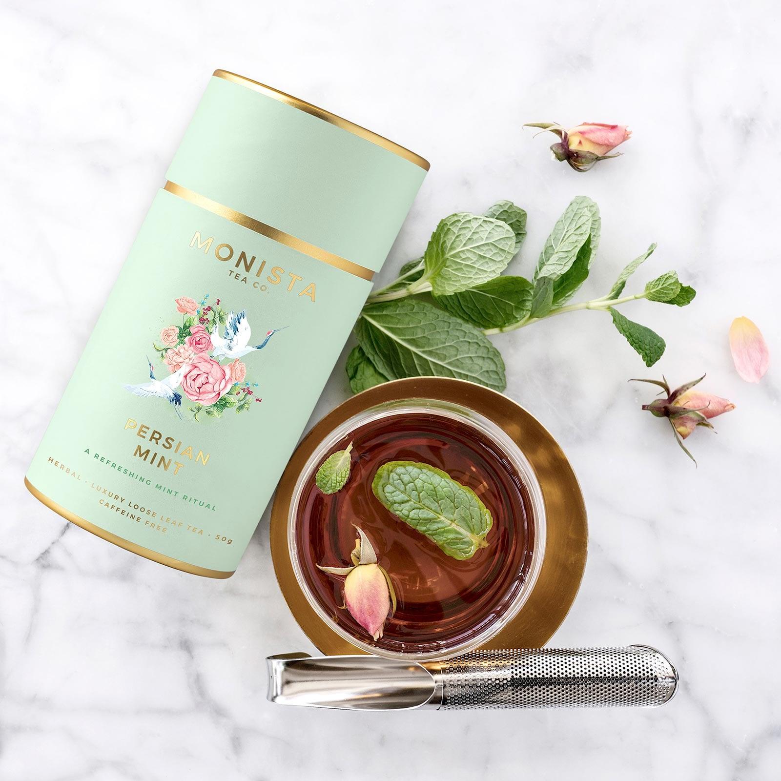 Monista’s Persian Mint blends organic peppermint and spearmint, finished with the national flower of Persia, the rose.